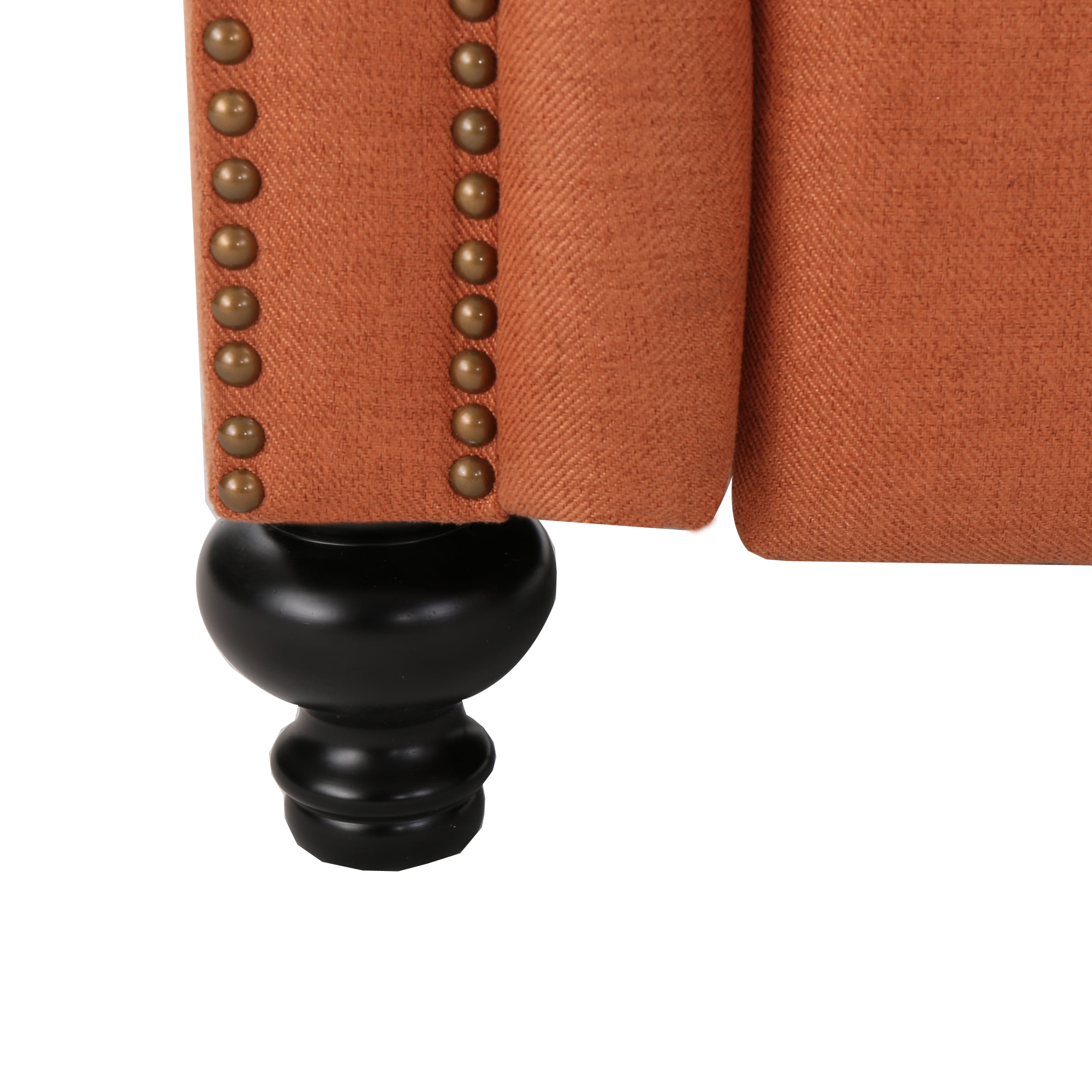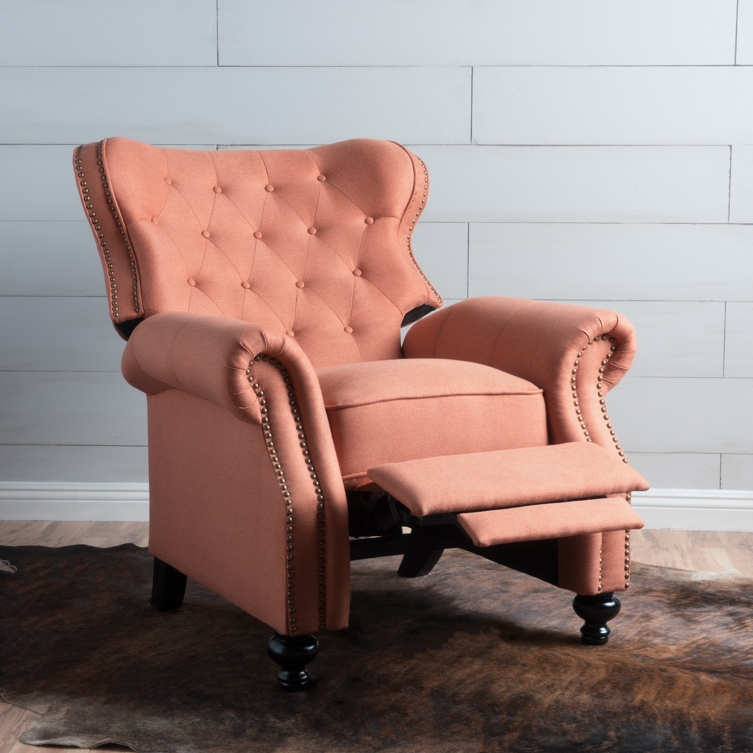 Includes: One (1) Recliner Material: Fabric Fabric Composition: 100% Polyester Leg Material: Birch Wood Color: Orange Leg Finish: Dark Brown Hand-Crafted Details Assembly Required Dimensions: 35.50 inches deep x 36.00 inches wide x 42.00 inches high Open Dimensions: 63.25 inches deep x 36.00 inches wide x 34.00 inches high Seat Dimensions: 21.50 inches deep x 18.50 inches wide x 21.50 inches high Arm Height: 26.25 inches