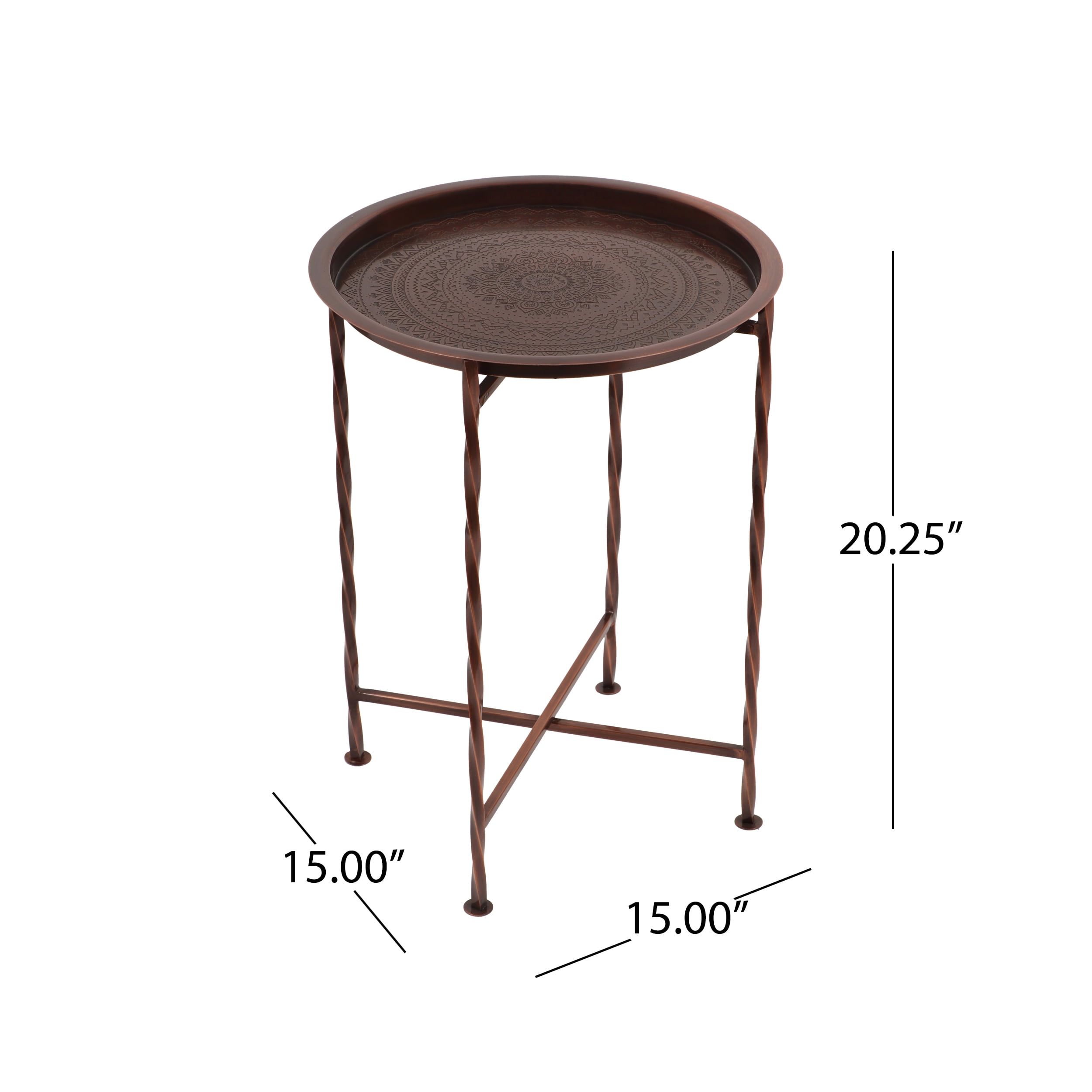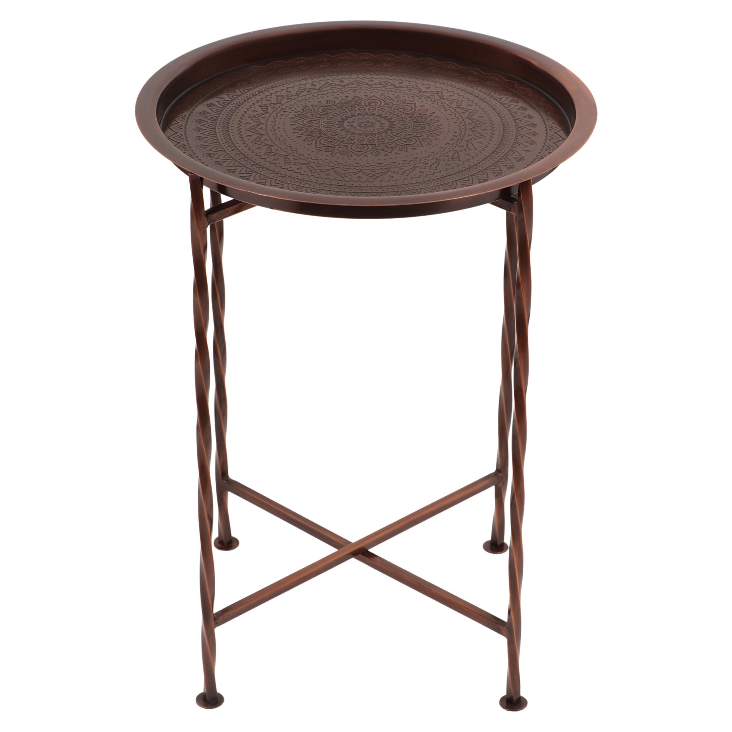 Up your hosting game with a tray top table that will make serving your guests a breeze. This handcrafted table is ideal for any occasion with its desirable mobile feature, making it easy to store and transport. Created for both functionality and impeccable style, this dazzling piece will open up your living space with a flourish. Accented with delicate Moroccan etchings and stunning twisted legs, our table is the perfect breathtaking addition that will have all your guests in awe of your decor. VINTAGE DESIGN: With an intricate Moroccan pattern etched into the tabletop, this tray table is the perfect vintage accessory for your interior space. Finished with a beautifully twisted leg design, this not only offers a minimalistic yet exquisite look but also provides a stable structure. HANDCRAFTED DESIGN: This accessory is expertly designed and handcrafted with artisan expertise. Any natural variations are not product flaws, but rather, will ensure that your purchase is truly a one-of-a-kind product. TRAY TOP: Our accent table features an antique-style tray top that makes it easy for you to transport snacks and drinks throughout several spaces. This offers convenient mobility, making it easy for you to add a perfect touch to any room whenever you need it. FOLDABLE LEGS: Supported by iron legs, this table offers a foldable option that still provides durability to the overall piece. Refined with a gorgeous twisted design, these legs bring a traditional touch to this piece, making it an understated yet elegant addition to your home. DIMENSIONS: Choose an accessory that is the perfect size for you and your furniture. This side table is 15.00” W x 15.00” D x 20.50” H. You will love how much your space can transform with the simple addition of this charming table.