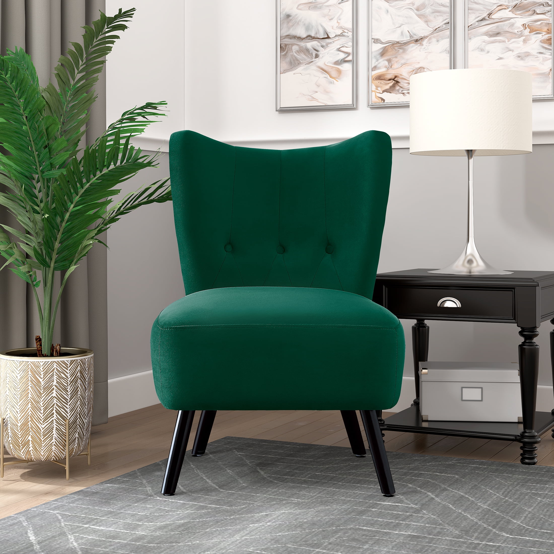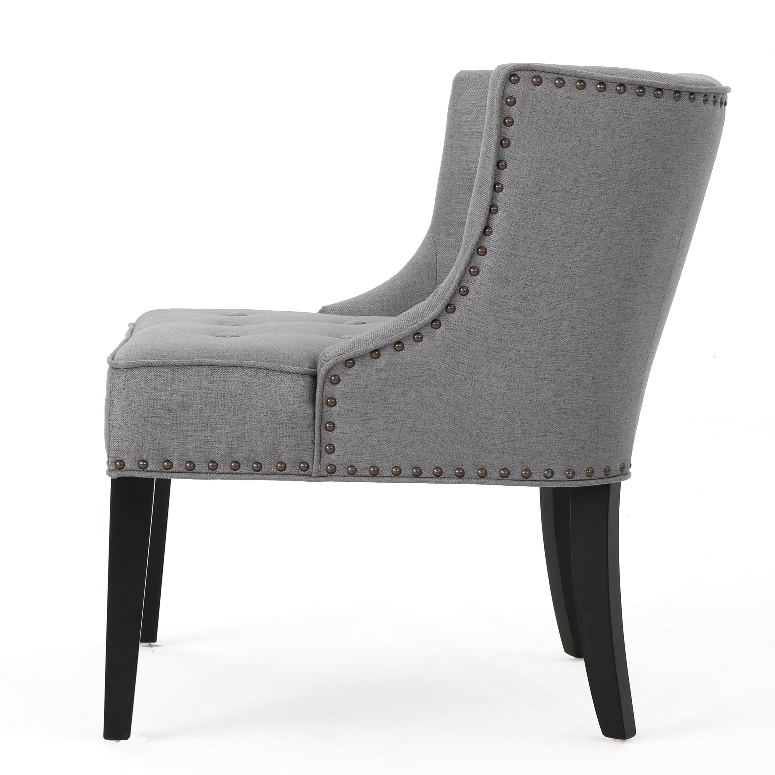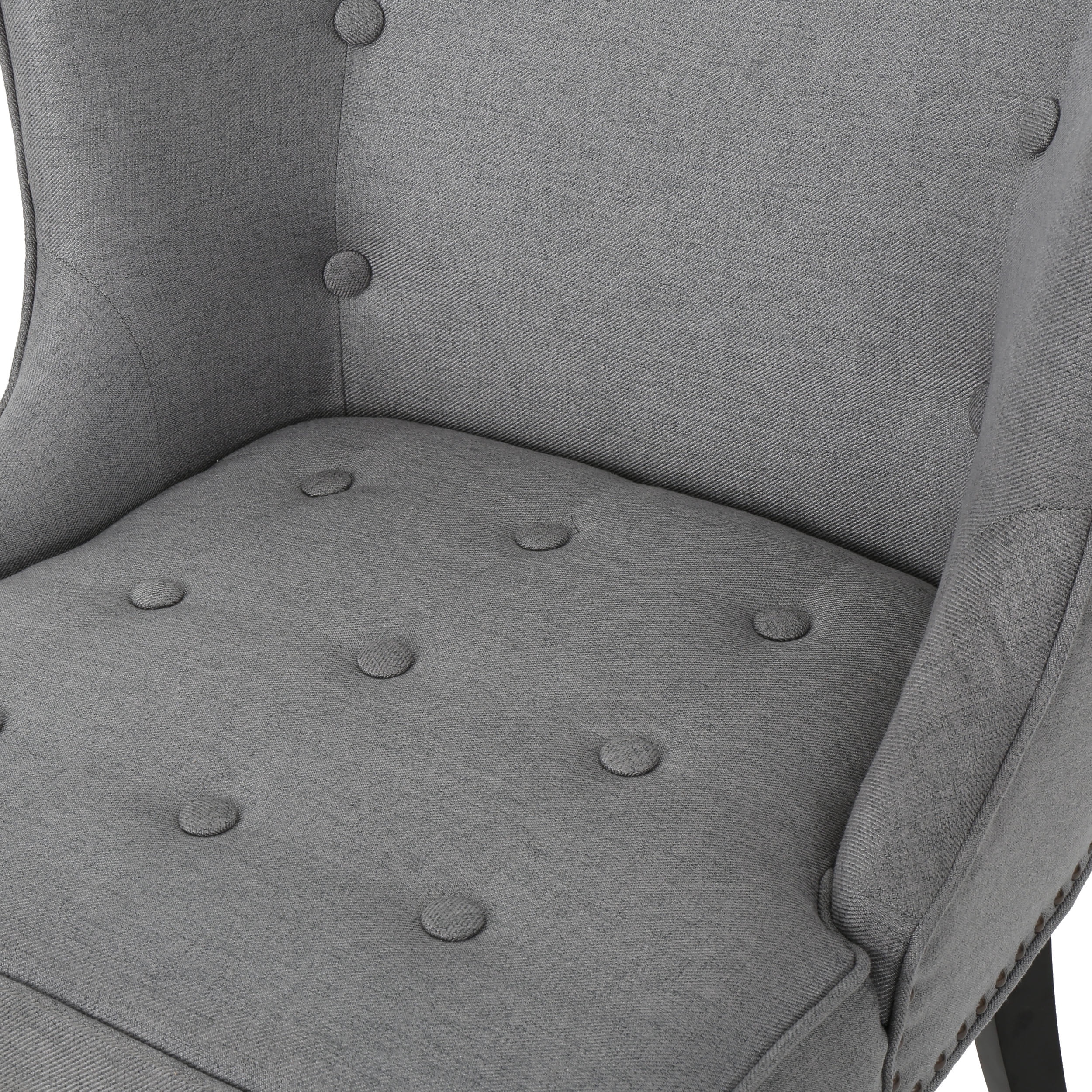 Noble House Angela Fabric Slipper Chair, Gray: Includes: One (1) Chair Material: Fabric Fabric Composition: 100% Polyester Leg Material: Birch Wood Multiple Color Options Leg Finish: Dark Brown Assembly Required Dimensions: 28.50 inches deep x 28.00 inches wide x 31.50 inches high Seat Dimensions: 22.25 inches deep x 25.00 inches wide x 18.25 inches high