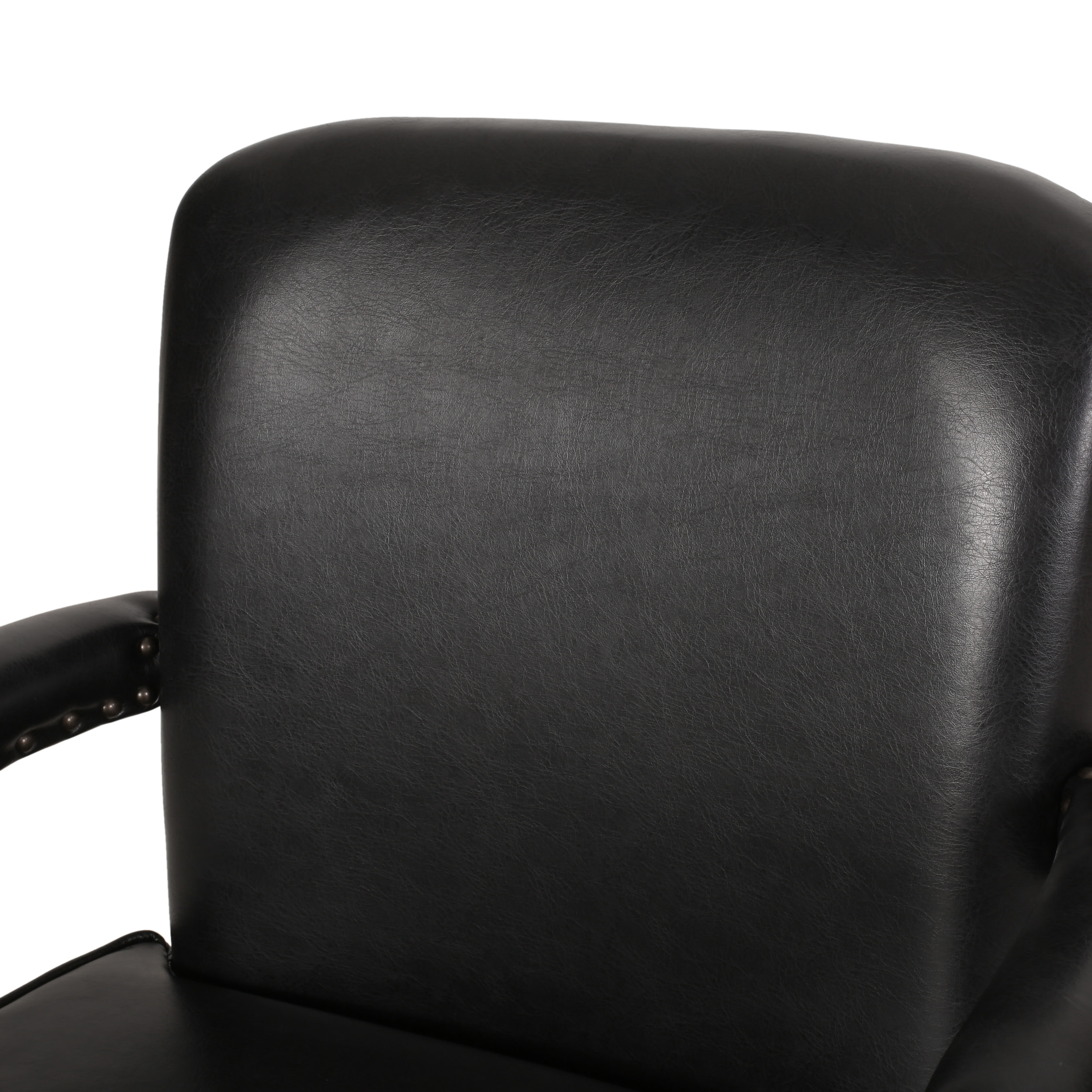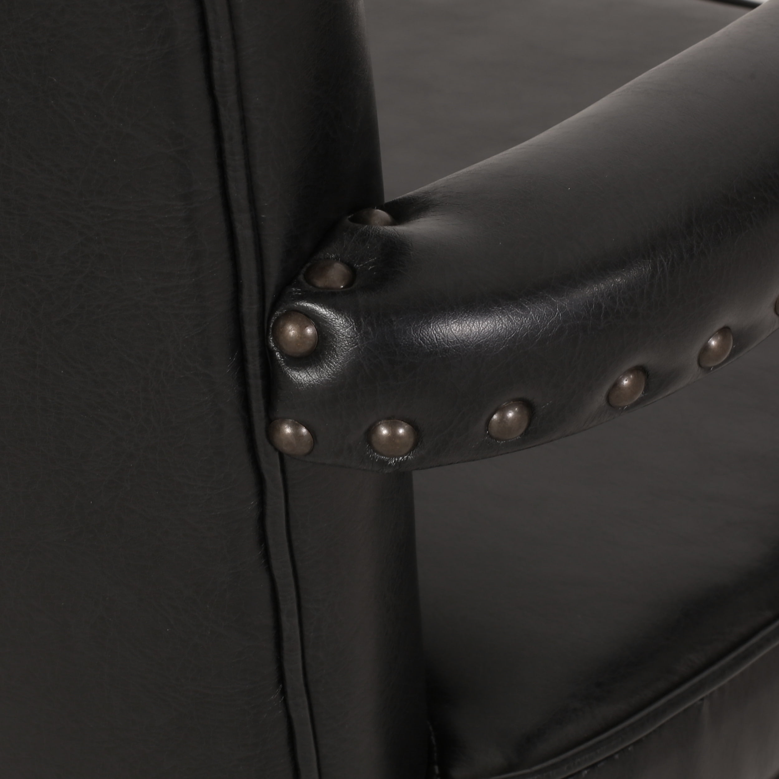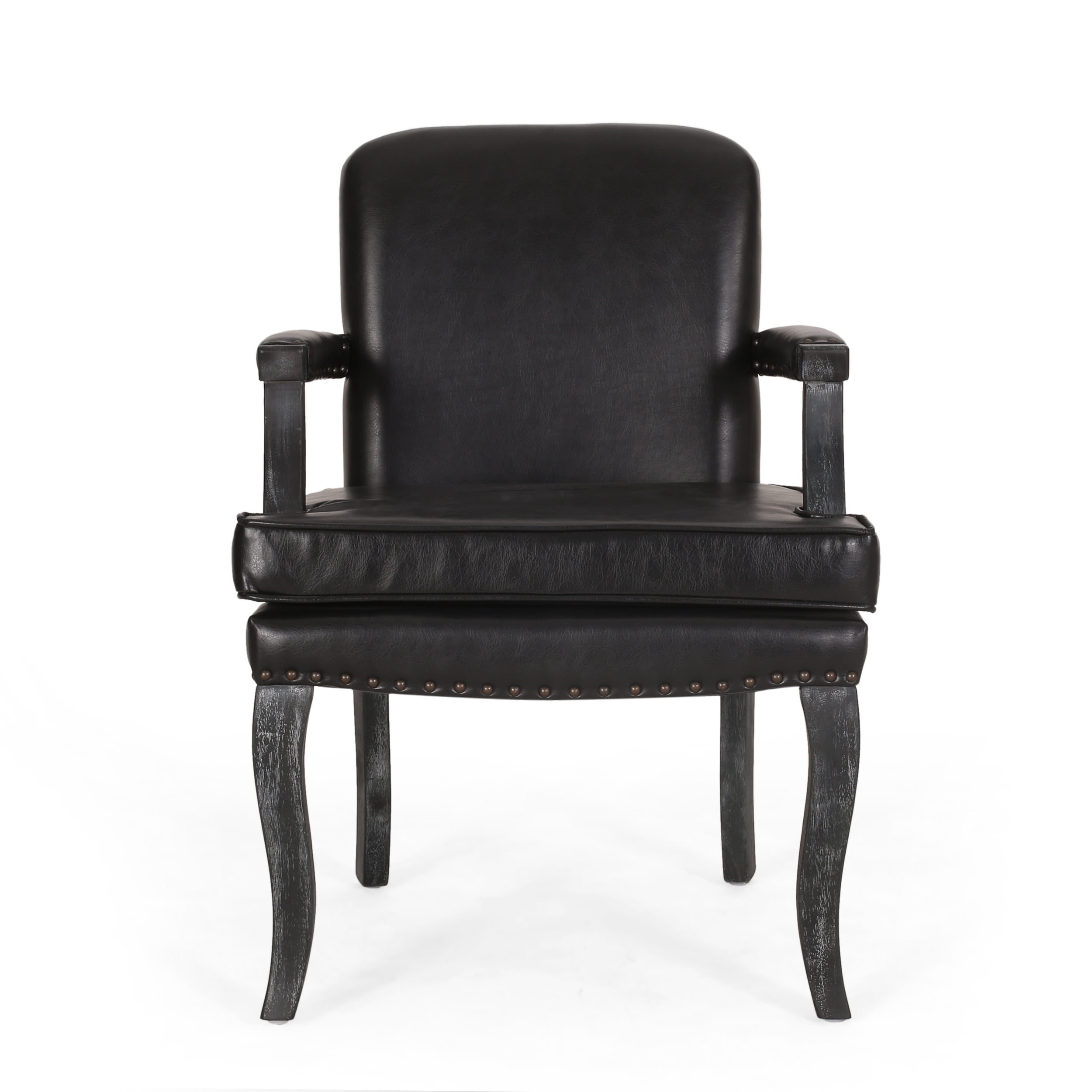 Noble House Ardson Faux Leather and Wood Dining Arm Chair with Nailhead Trim, Midnight Black and Gray: Includes: One (1) Dining Chair Multiple Seat Material Options Frame Material: Rubberwood Multiple Seat Color Options Multiple Frame Finish Options No Assembly Required Dimensions: 26.00 inches deep x 24.50 inches wide x 36.00 inches high Seat Dimensions: 19.25 inches deep x 19.75 inches wide x 19.75 inches high Arm Height: 26.50 inches Weight Capacity: 300 lbs
