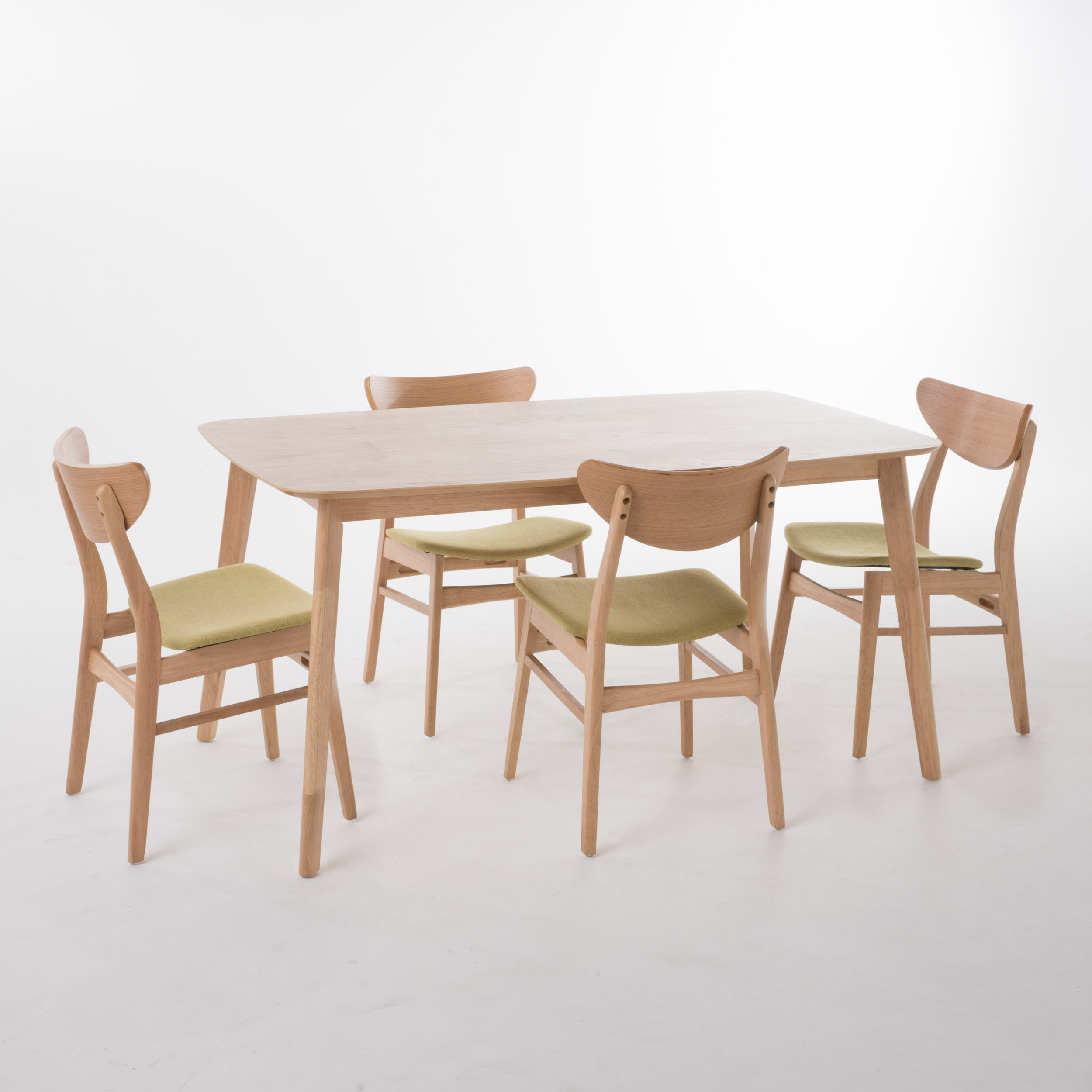 Includes: One (1) Table and Four (4) Chairs Materials: Medium Density Fibreboard with an Oak Veneer, Rubberwood, Fabric Table Dimensions: 35.43 inches deep x 59.06 inches wide x 29.53 inches high Chair Dimensions: 20.00 inches deep x 18.30 inches wide x 31.10 inches high Seat Dimensions: 14.30 inches deep x 18.25 inches wide x 17.60 inches high Chair Color: Green Tea Chair Leg Finish: Natural Oak Table Finish: Natural Oak Assembly Required