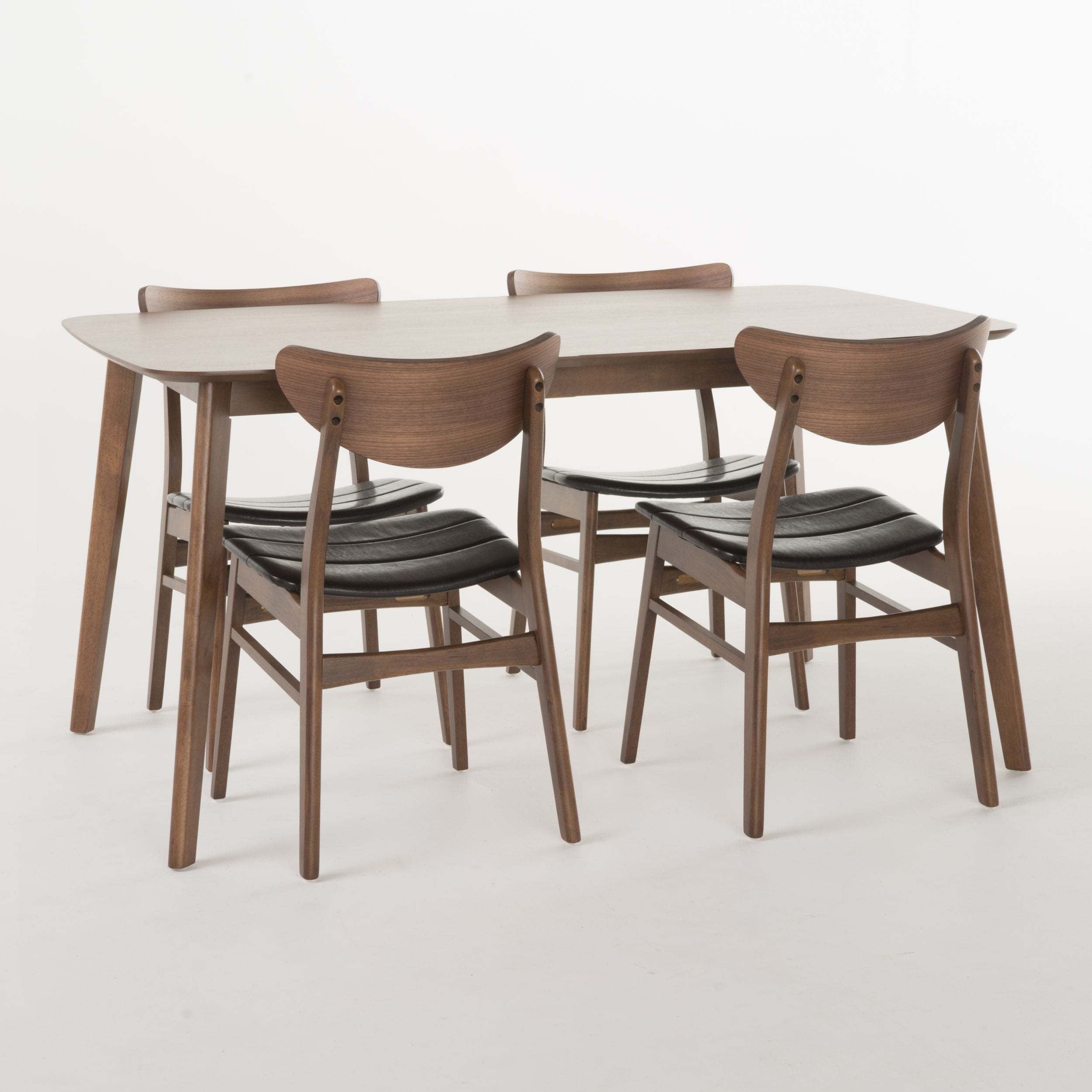 With matching wood finishes, you can’t go wrong with this dining set. Including one table and four chairs, this set is ideal for any home. The mid-century style and smooth wood finishes of this set will complement any decor, so you don’t have to worry about clashing color pallets in your home. The dining chairs feature a sturdy design with soft leather cushioned seats, providing both comfort and style for your dining pleasure.