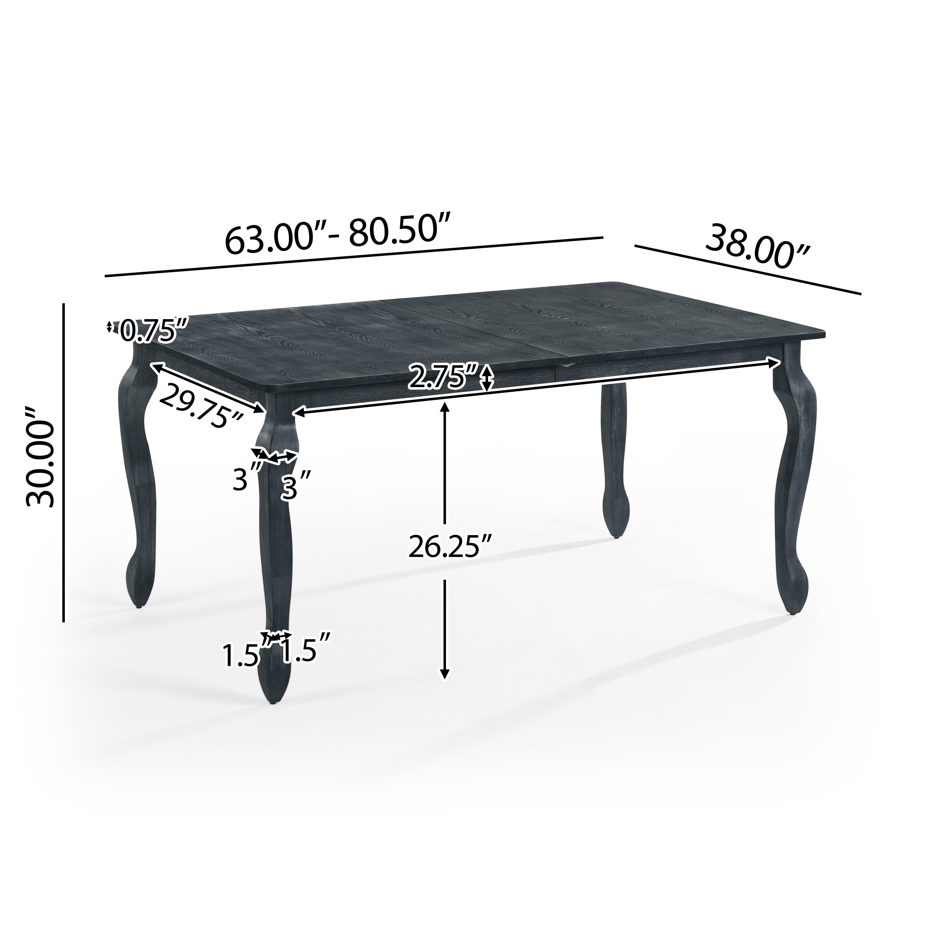 Noble House Bannock Wooden Expandable Rectangular Dining Table, Gray: Includes: One (1) Dining Table Tabletop Material: Manufactured Wood Leg Material: Rubberwood Multiple Finish Options Assembly Required Dimensions: 38.00 inches deep x 63.00 inches wide x 30.00 inches high Extended Dimensions: 38.00 inches deep x 80.50 inches wide x 30.00 inches high Weight Capacity: 500 lbs Recommended Locations: Indoor