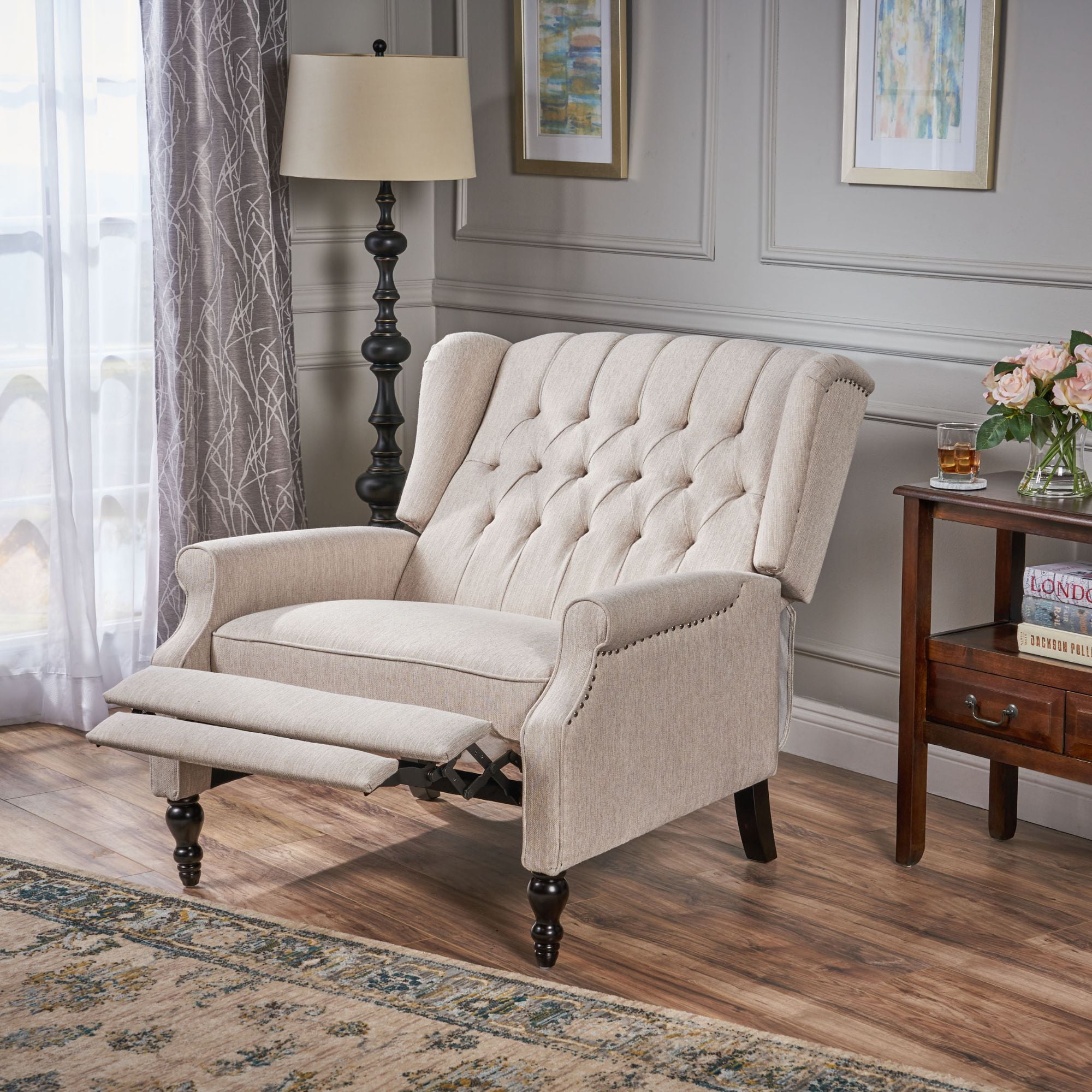 Envelop yourself in comfort and transform your space at the same time. Featuring a button-tufted wingback design and lovely turned legs, our recliner takes traditional elements and upgrades with contemporary aesthetics. The reclining pushback function encourages effortless and soothing relaxation, perfect after a long day. With its elevated style and oversized seating, our recliner promises to bring sophistication and leisure together in perfect harmony.