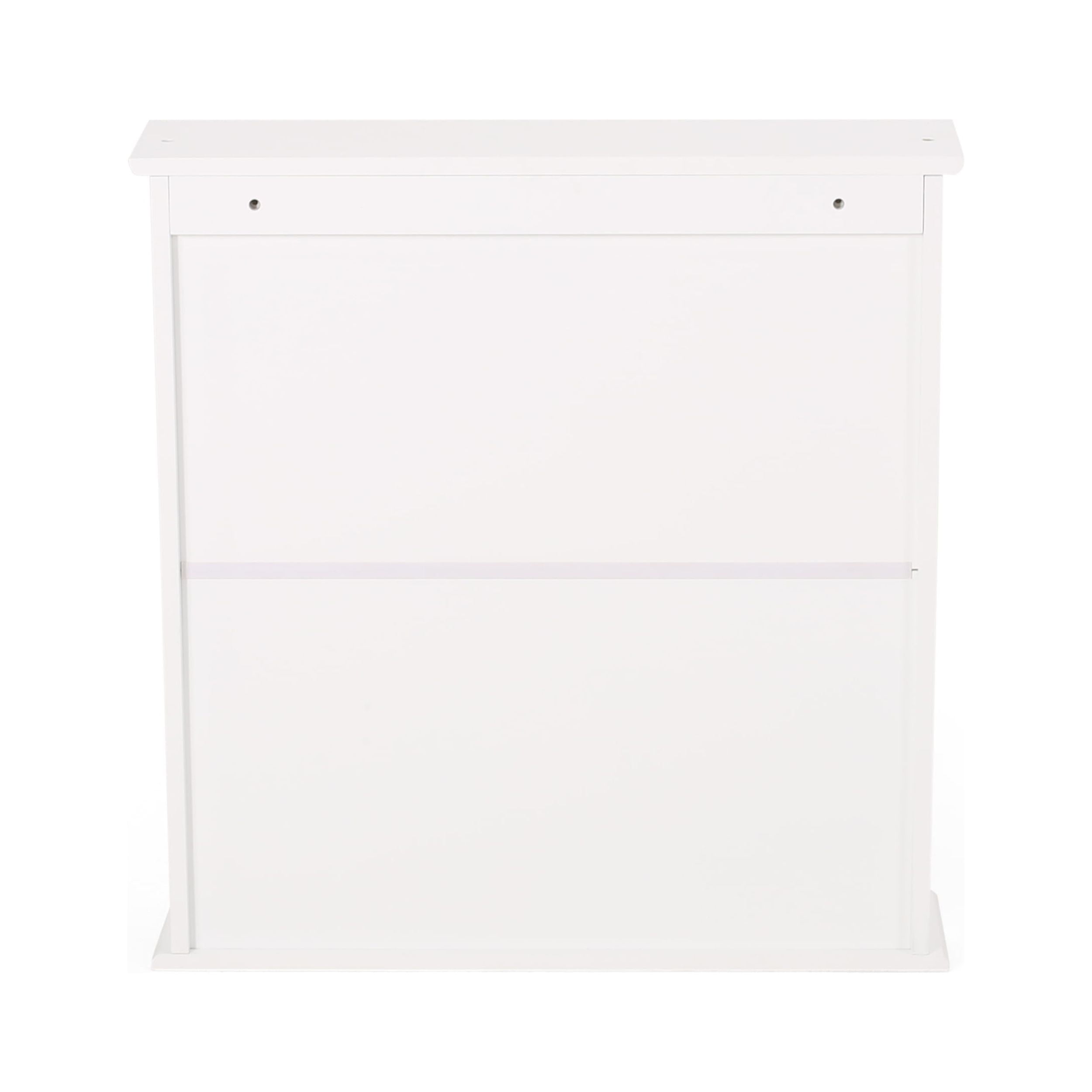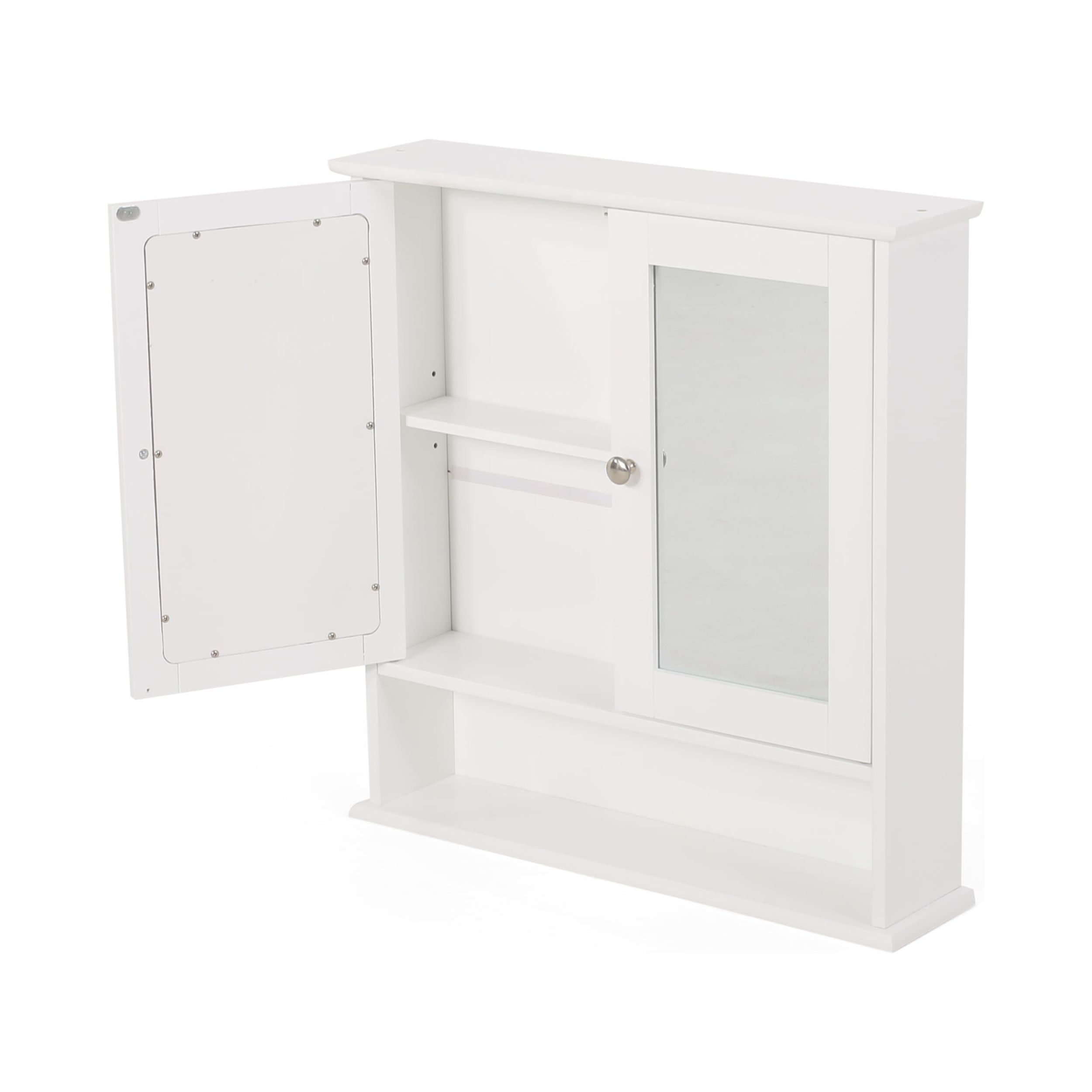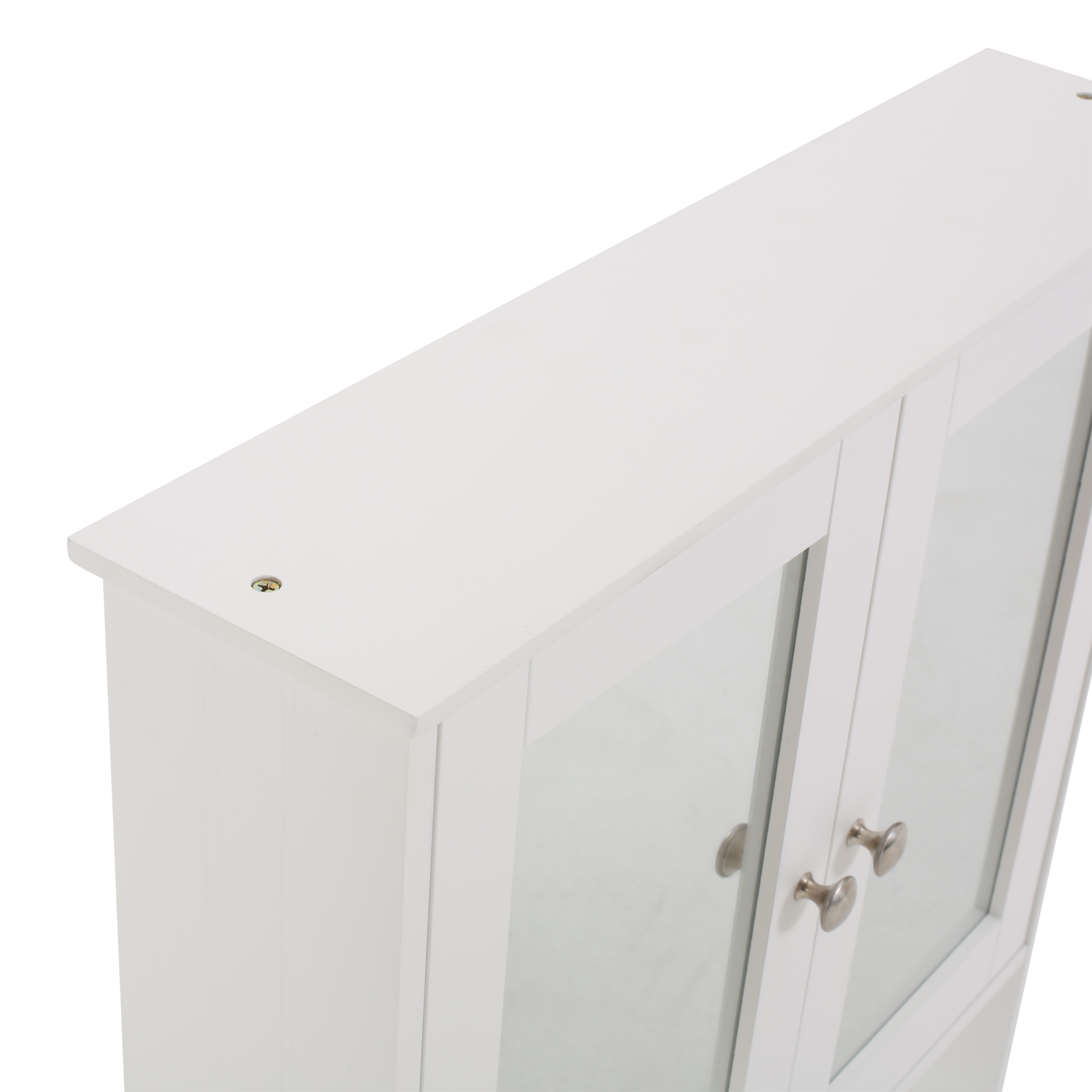 Store your q-tips, soaps, and medicines in a cabinet of crisp, refreshing style. Featuring a lovely two-door design, our medicine cabinet will maximize your bathroom’s potential with its illuminating mirror paneling and generous storage space. This durable structure is an essential addition to any bathroom for it not only adds a sleek modern touch to your decor but it also helps you organize your bathroom necessities. Finished with stunning silver knobs and a convenient open shelf, our cabinet will make your morning routine a breeze. MODERN: Our medicine cabinet showcases gorgeous mirror paneling that pair seamlessly with clean, straight lines for a luxurious modern look. Complemented with rounded knobs and minimalistic structure, this cabinet brings a sleek touch to any decor. SHELVING SPACE: This wall accessory offers two enclosed shelves to store your bathroom necessities and one open shelf for any towels or other items. This is perfect for storing and organizing your items however you please. FAUX WOOD: Made with faux wood, this medicine cabinet offers a beautiful wood look with the strength of real wood. Resistant to moisture, this material provides a smooth and refined finish to any bathroom. DIMENSIONS: Choose an accessory that is the perfect size for you and your furniture. This medicine cabinet is 22.25” W x 5.25” D x 23.00” H. You will love how much your space can transform with the simple addition of this charming cabinet. ASSEMBLY REQUIRED: Some assembly is required for this medicine cabinet. All of the instructions and tools needed for assembly are included.