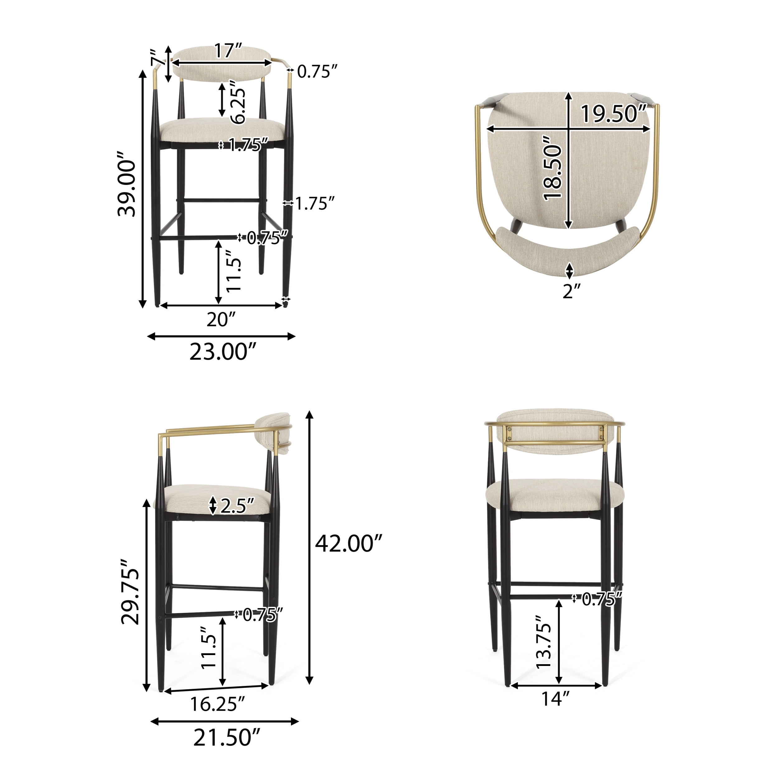 Includes: Two (2) Barstools Seat Material: Fabric Frame Material: Iron Multiple Color Options Frame Finish: Black Frame Top Finish: Gold Assembly Required Dimensions: 21.50 inches deep x 23.00 inches wide x 42.00 inches high Seat Dimensions: 18.50 inches deep x 19.50 inches wide x 29.7 inches high Weight Capacity: 300 lbs