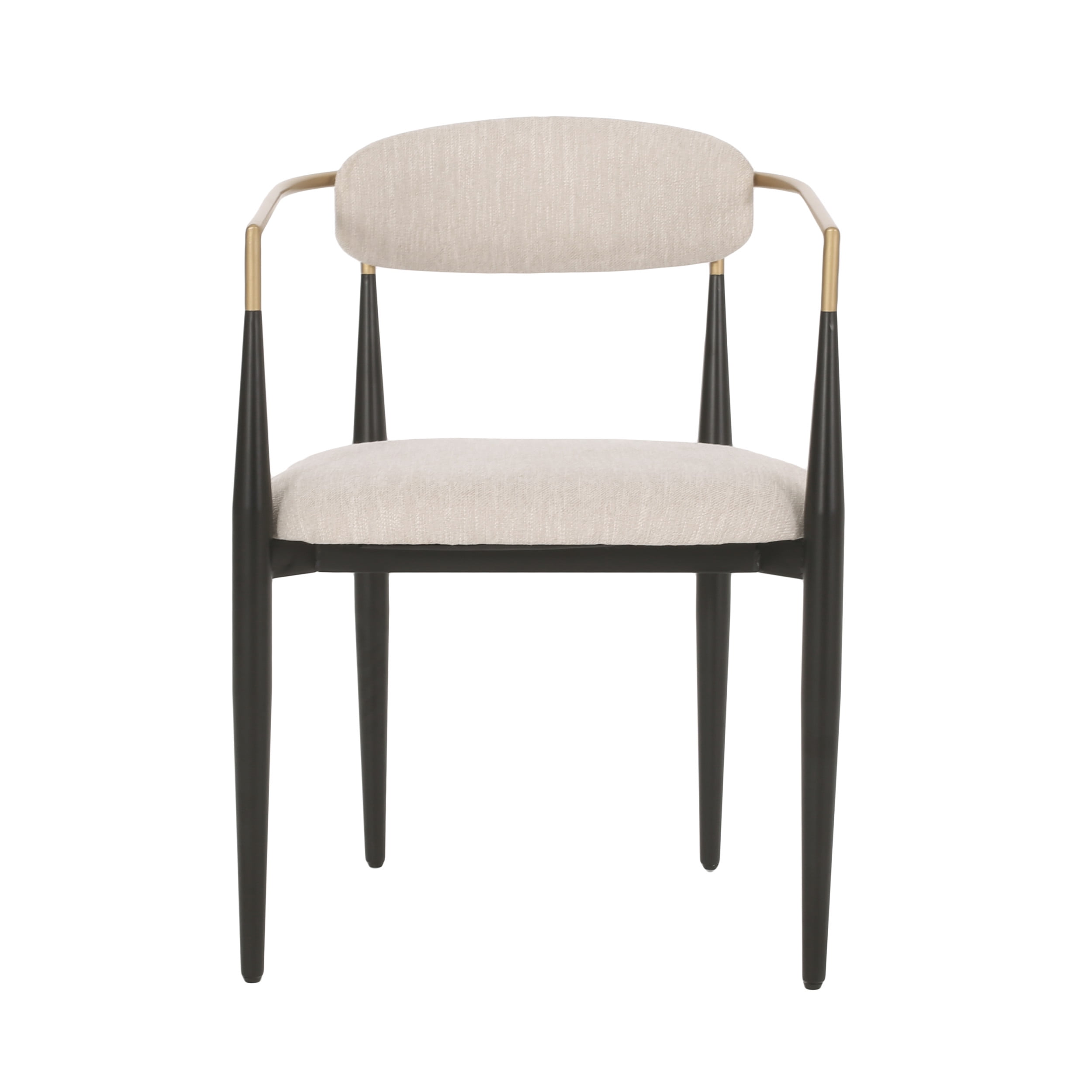 Noble House Boise Fabric Upholstered Iron Dining Chairs, Set of 2, Beige, Black, and Gold: Includes: Two (2) Dining Chairs Material: Fabric Frame Material: Iron Multiple Color Options Frame Finish: Black Frame Top Finish: Gold Assembly Required Dimensions: 21.75 inches deep x 22.75 inches wide x 31.50 inches Seat Dimensions: 18.50 inches deep x 19.50 inches wide x 19.50 inches high Arm Height: 28.75 inches Weight Capacity: 300 lbs