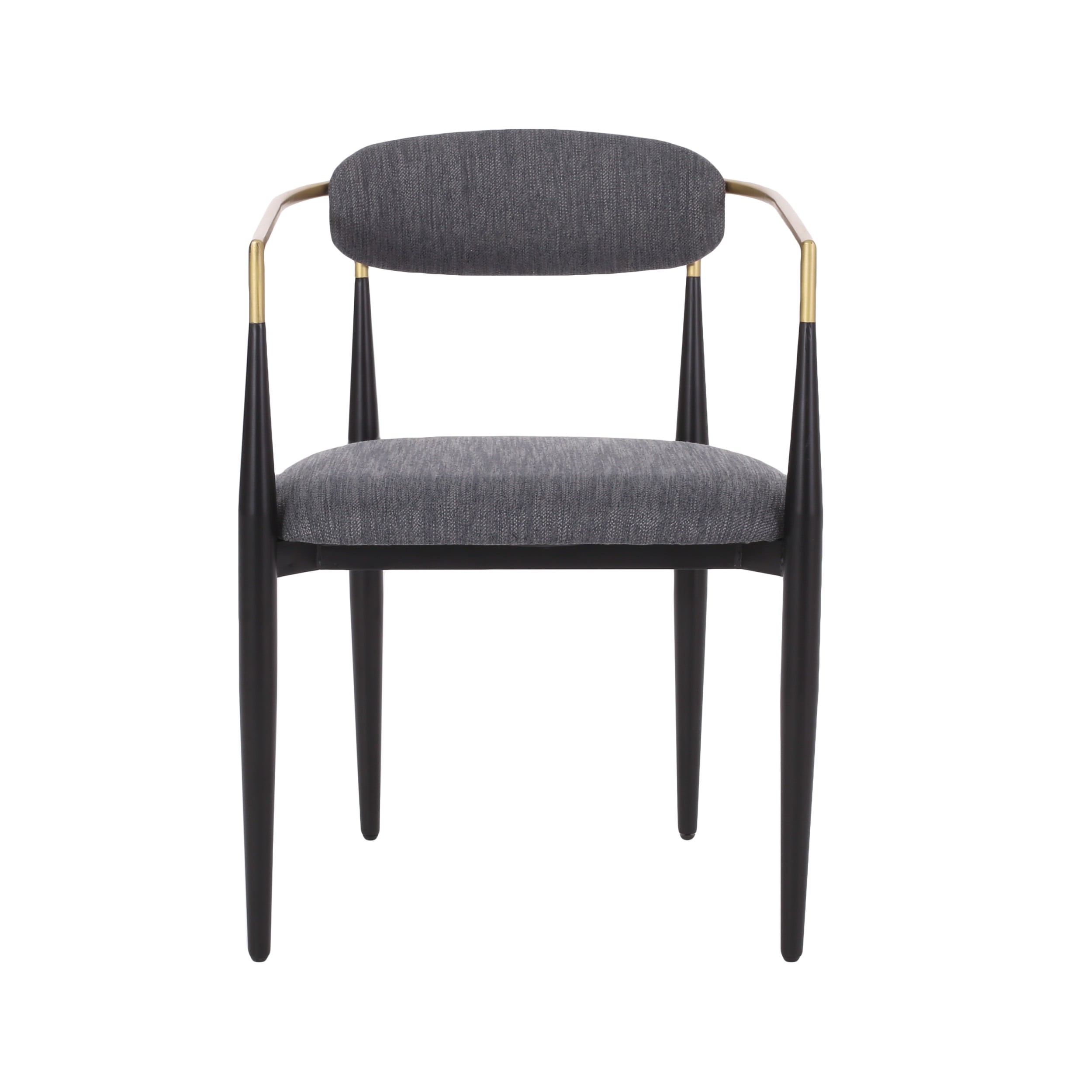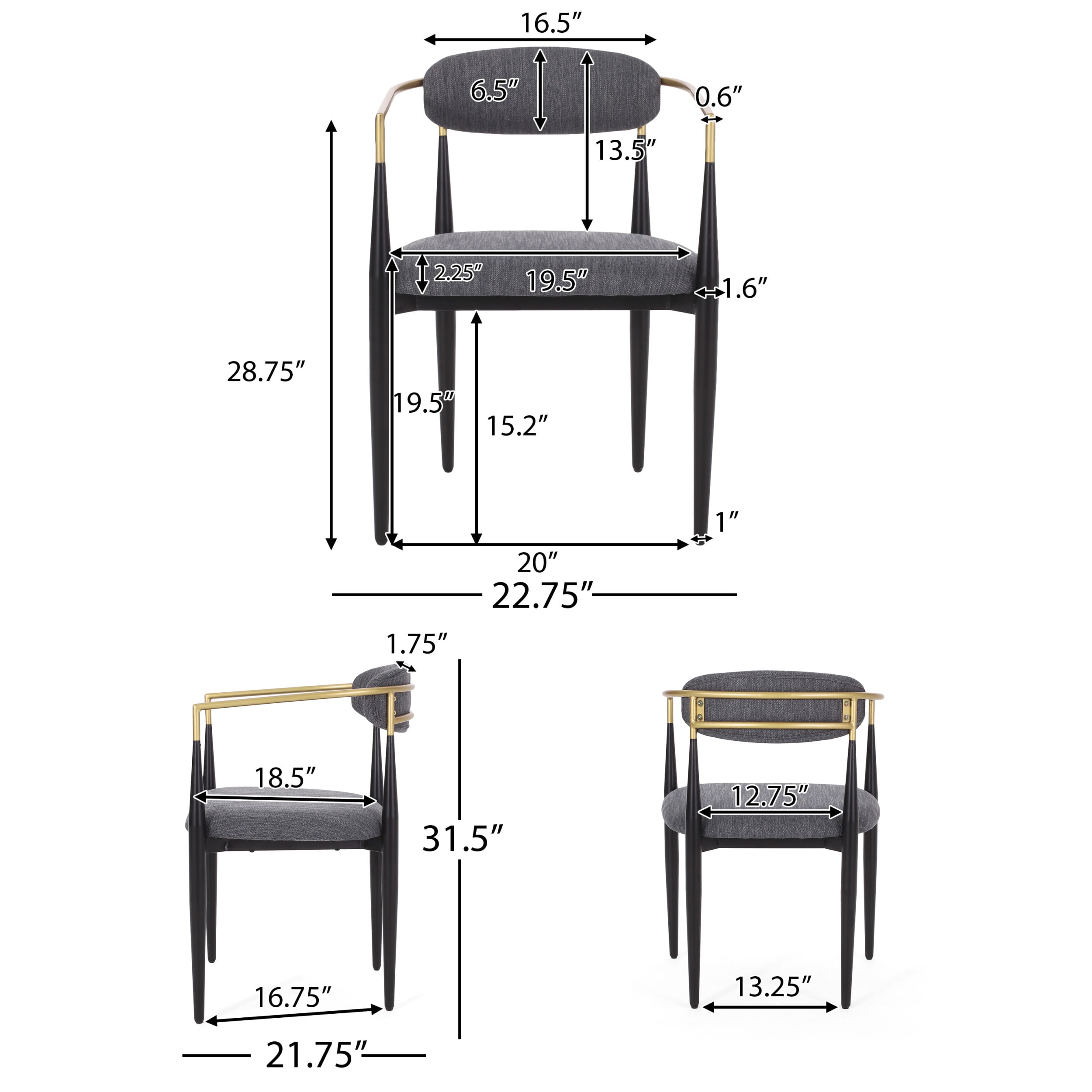 Noble House Boise Fabric Upholstered Iron Dining Chairs, Set of 2, Charcoal, Black, and Gold: Includes: Two (2) Dining Chairs Material: Fabric Frame Material: Iron Multiple Color Options Frame Finish: Black Frame Top Finish: Gold Assembly Required Dimensions: 21.75 inches deep x 22.75 inches wide x 31.50 inches Seat Dimensions: 18.50 inches deep x 19.50 inches wide x 19.50 inches high Arm Height: 28.75 inches Weight Capacity: 300 lbs