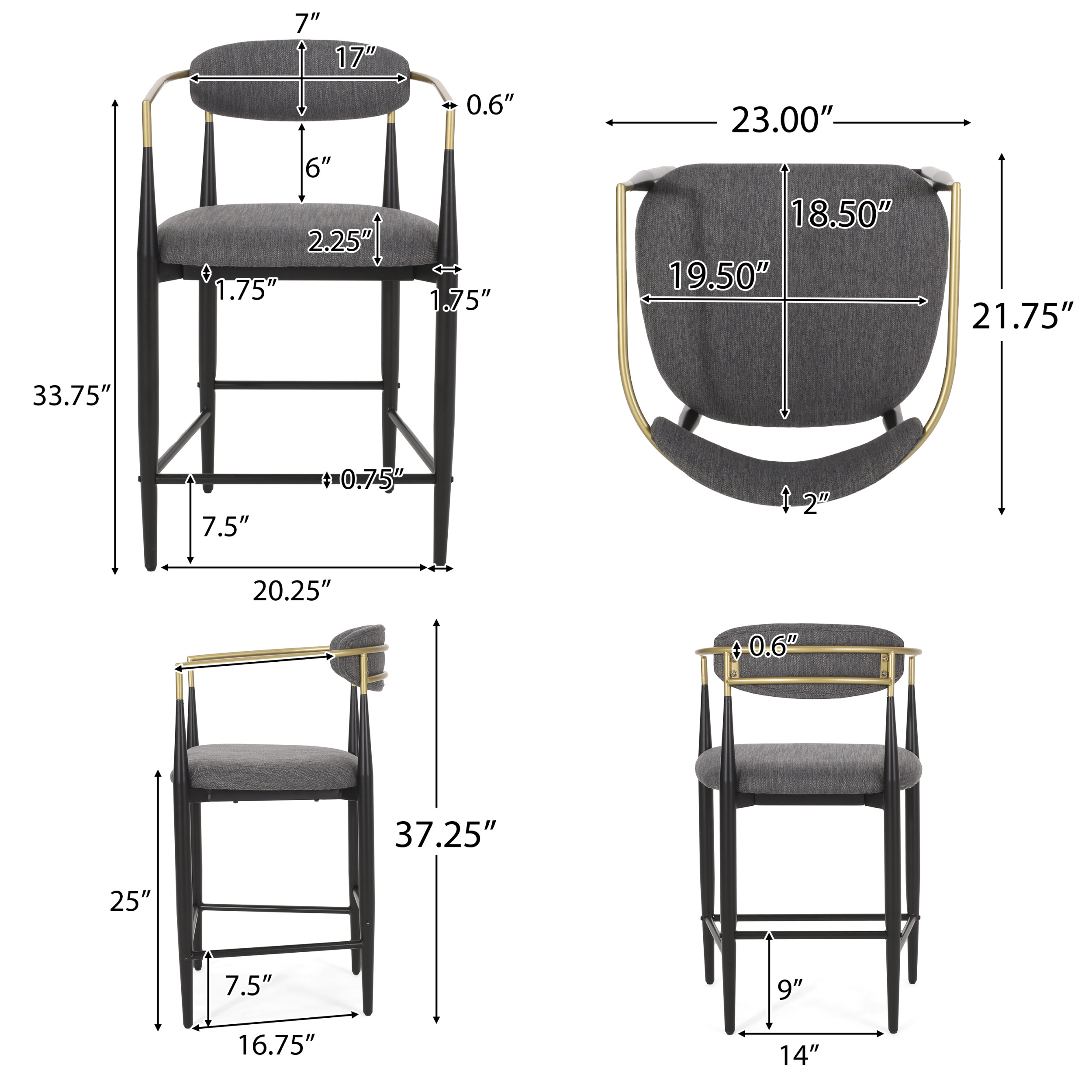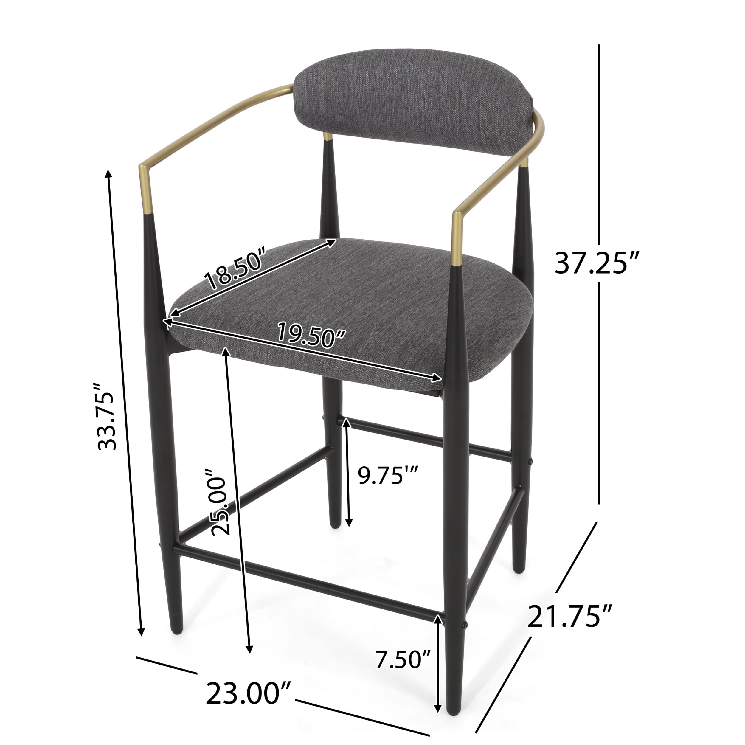 Noble House Boise Indoor Fabric and Metal 25 inch Counter Stools, Set of 2, Charcoal, Black, and Gold: Includes: Two (2) Counter Stools Seat Material: Fabric Frame Material: Iron Multiple Color Options Frame Finish: Black Frame Top Finish: Gold Assembly Required Dimensions: 21.75 inches deep x 23.00 inches wide x 37.25 inches high Seat Dimensions: 18.50 inches deep x 19.50 inches wide x 25.00 inches high Weight Capacity: 300 lbs