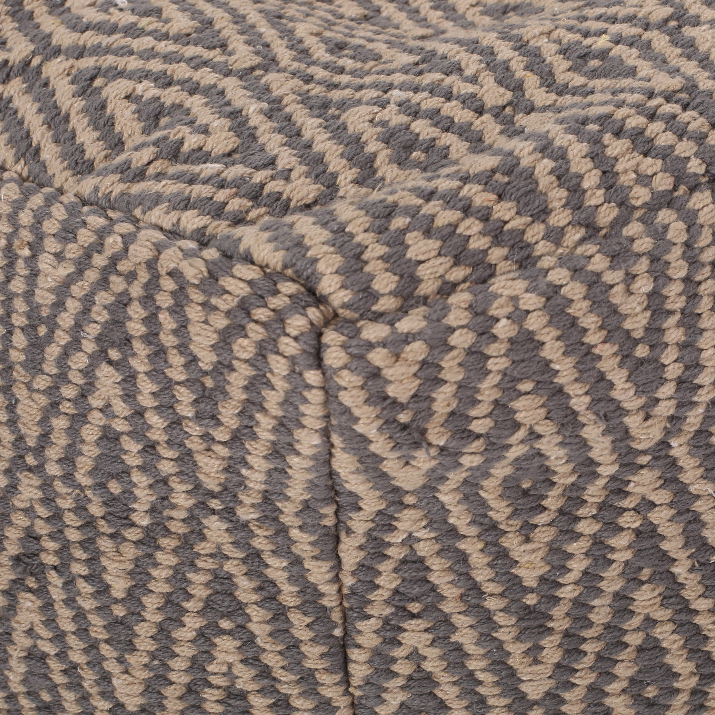 Includes: One (1) Pouf Material: Fabric Fabric Composition: 100% Cotton Filling Material: Polystyrene Beads Color: Dark Gray and Brown Hand-Crafted Details No Assembly Required Dimensions: 16.00 inches wide x 16.00 inches deep x 16.00 inches high