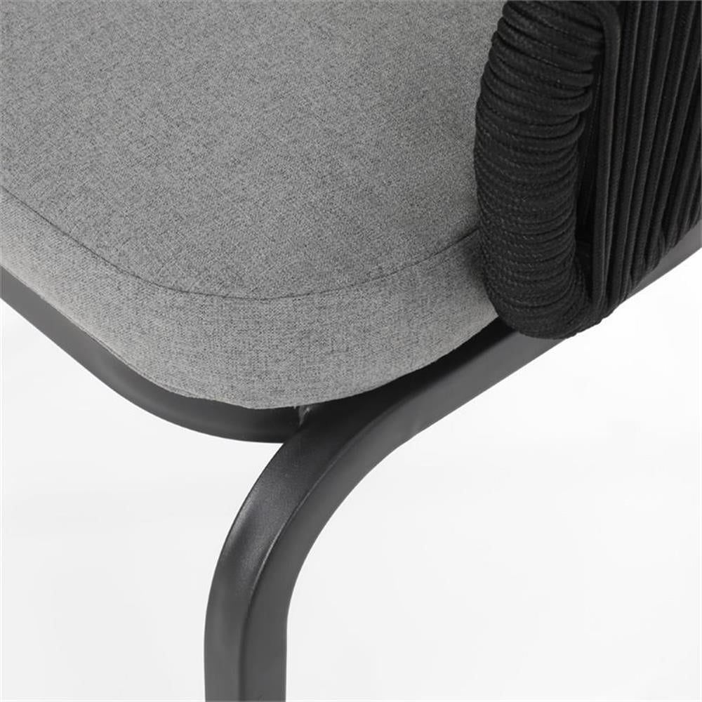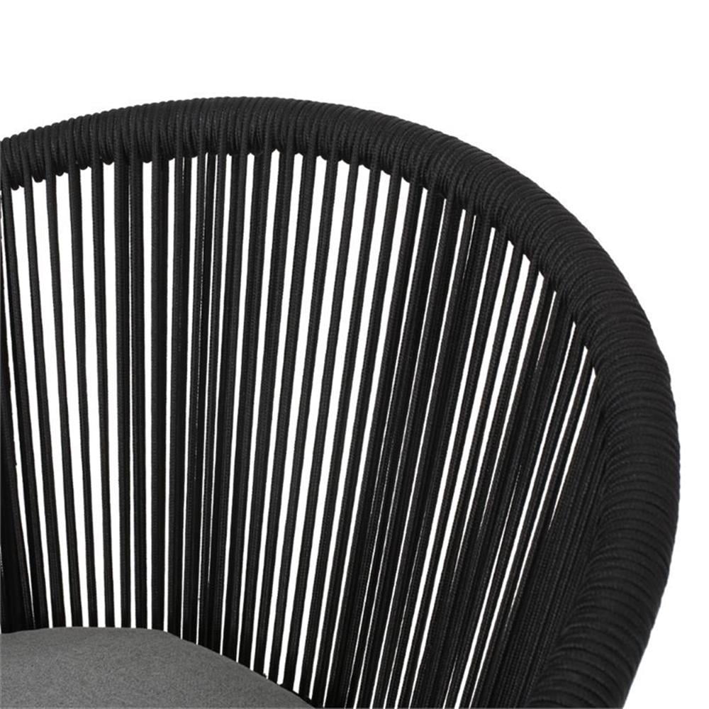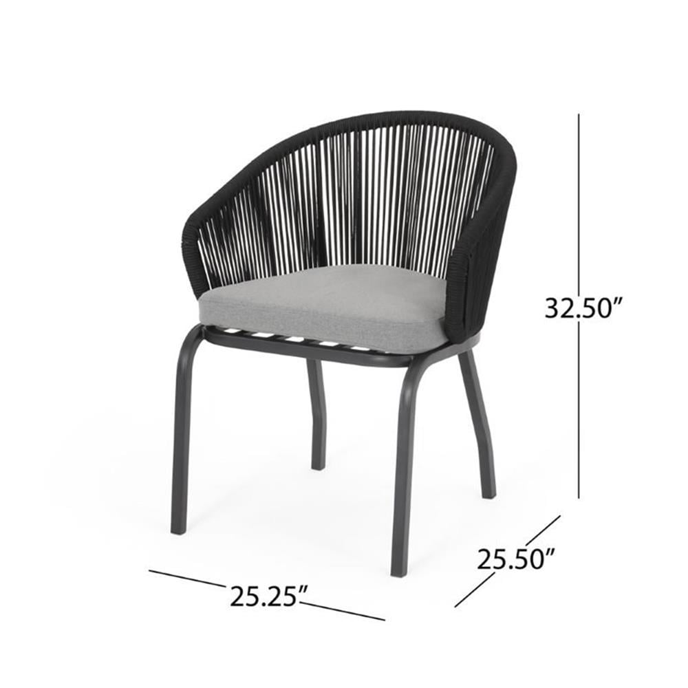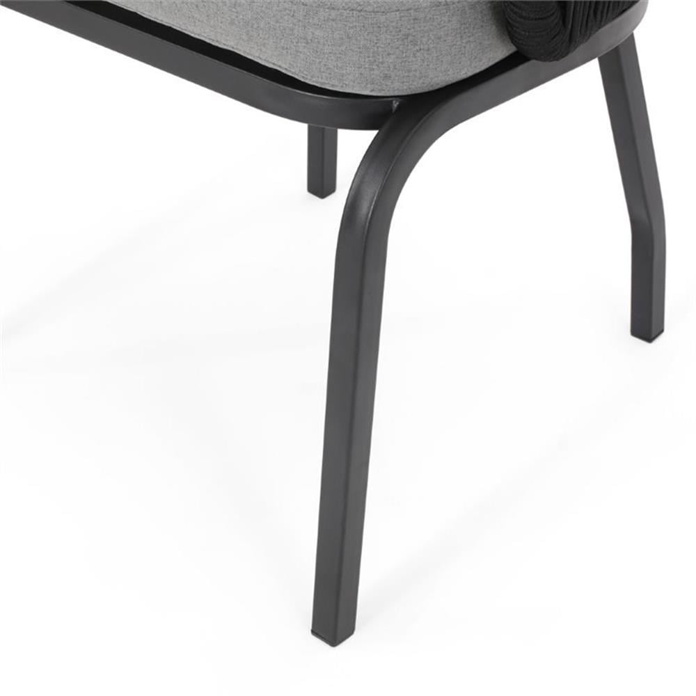 Includes: Two (2) Club Chairs Material: Rope Frame Material: Iron Cushion Material: Water Resistant Fabric Composition: 100% Polyester Rope Finish: Black Frame Finish: Black Cushion Color: Gray Hand-Crafted Details Assembly Required