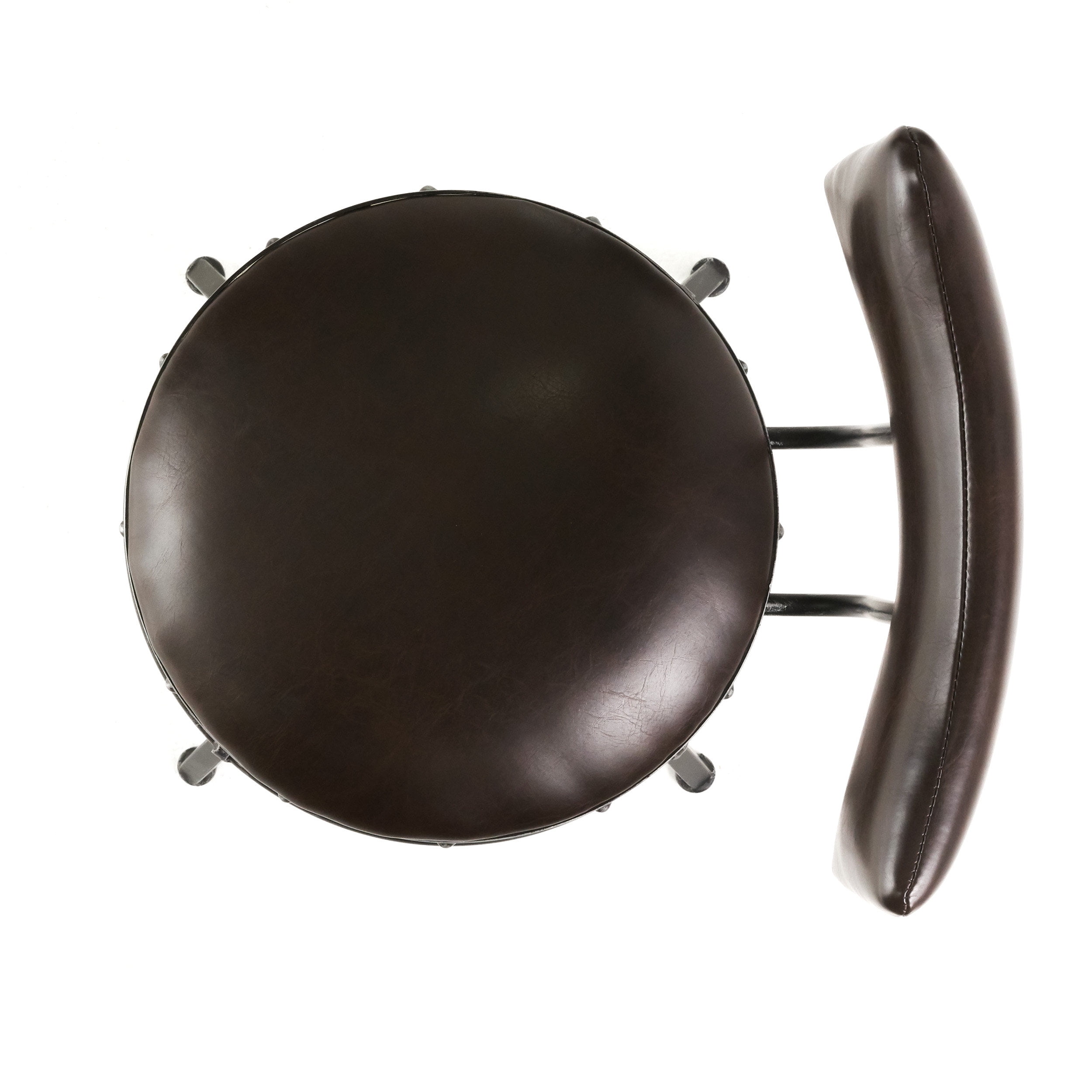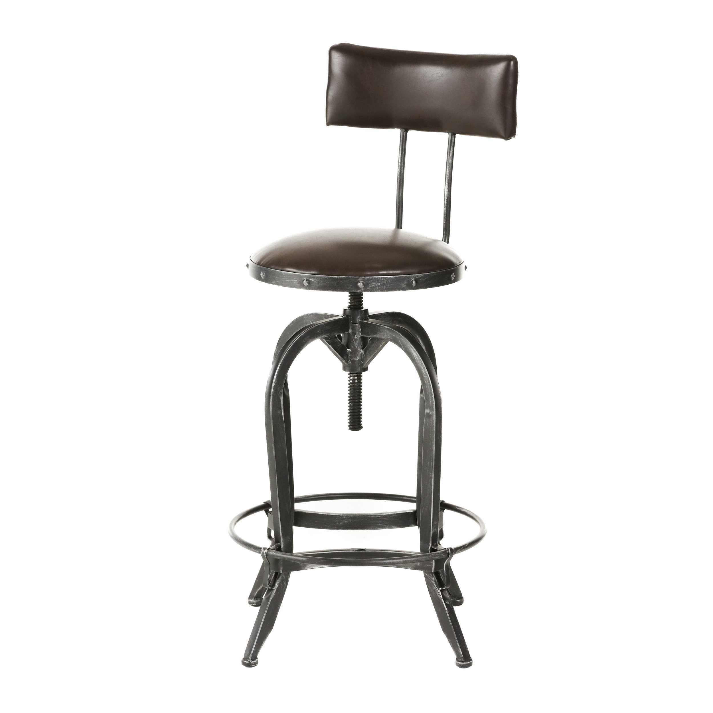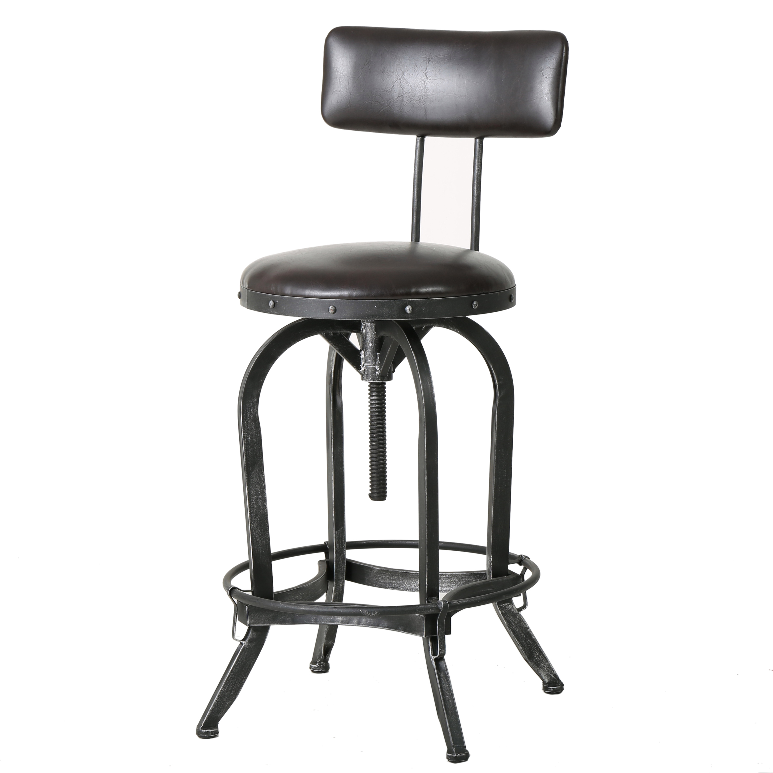 Includes: One (1) barstool Materials: Bonded leather, iron Color option: Brown Finish: Black brush silver Features: Adjustable seat height Assembly required: Yes Furniture Pattern: Solid Furniture Room: Bar, Dining Room, Kitchen Material: Iron, Bonded Leather Assembly: Assembly Required Set Size: Single Seat Height: Adjustable Exact Color: Brown Color: Brown Weight: 24-pounds Dimensions: 39.75 inches high x 18.50 inches wide x 18.50 inches deep