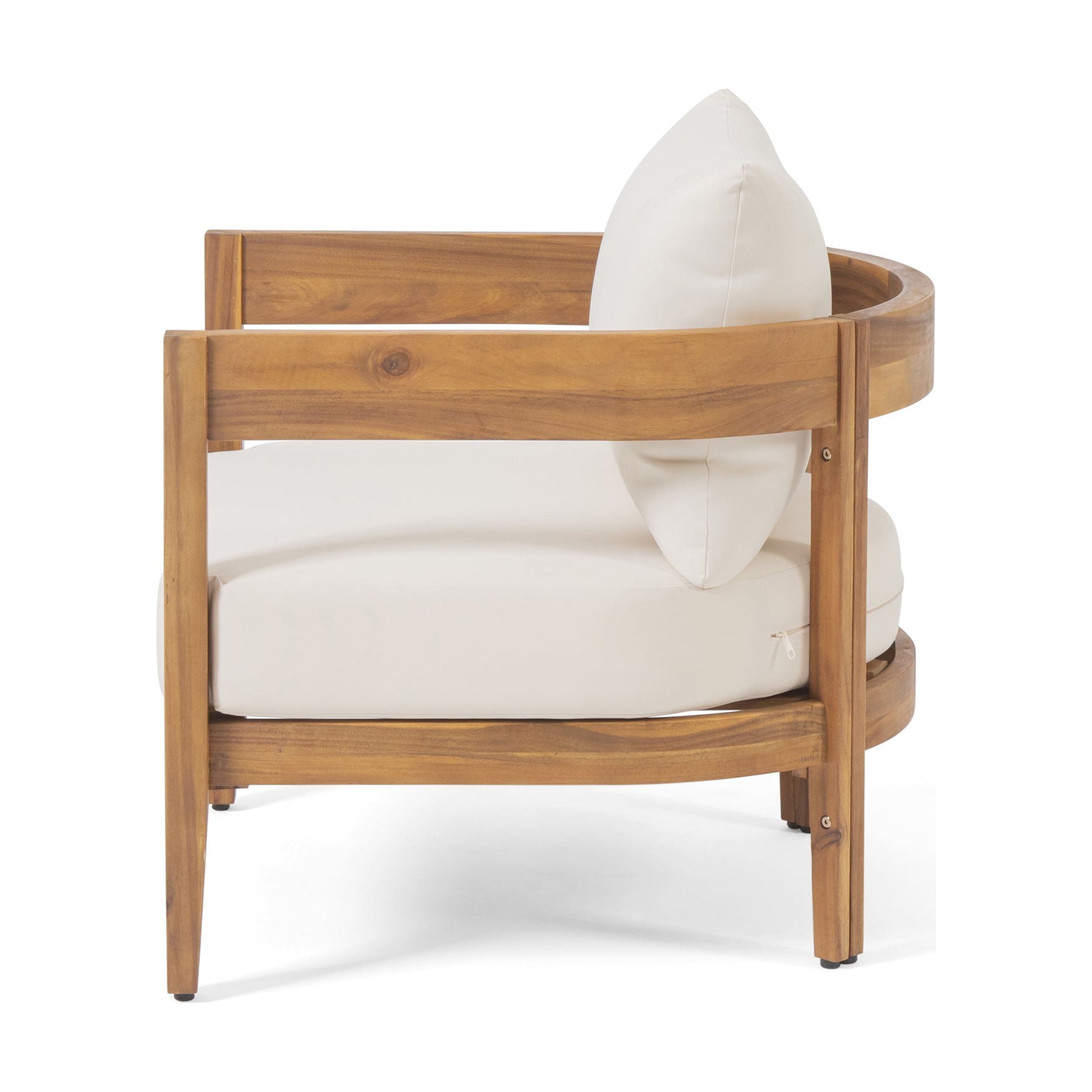 Bring luxurious seating to your outdoor space with a chair set that will upgrade your decor in style and comfort. With lovely acacia wood frames and classic slat paneling, this chair set highlights both assuring durability and incredible style for all to enjoy. This chair set features a lovely tub shape that is topped with plush water-resistant cushions that make your outdoor lounging one of luxurious comfort. Perfect for a cozy conversation or a refreshing drink, this set will quickly become your new favorite outdoor spot to unwind. ACACIA WOOD: Made with acacia wood that brings a sleek and exotic look to your space, this durable hardwood naturally withstands outdoor elements and will not darken over time. Acacia wood is perfect as a solid, heavy frame that resists wear and tear. TUB DESIGN: These chairs showcase a curvaceous tub shape which brings a touch of refinement to your outdoor space. This design features a semi-circular back that seamlessly transitions into its armrests. SLAT DESIGN: Each chair features seating with beautiful open slat paneling, taking a sophisticated, classic look and giving it a modern twist. This perfectly complements the curved backrest of each chair. WATER-RESISTANT CUSHIONS: Our cushions are covered with a non-porous material that makes cleaning any spill a breeze. Please note that these cushions are water-resistant and not waterproof. Please do not submerge in water. ASSEMBLY REQUIRED: Some assembly is required for this chair set. All of the instructions and tools needed for assembly are included. This comes as a set of two. Features : Includes: Two (2) Club Chairs Frame Material: Acacia Wood Cushion Material: Water Resistant Fabric Cushion Composition: 100% Polyester Frame Finish: Teak Cushion Color: Beige Assembly Required Specifications : Product Dimensions : 29.50″ D x 27.50″ W x 31.50″ H Seat Dimensions : 28.25″ D x 24.50″ W x 10.50″ H Arm Height : 24.75 inches