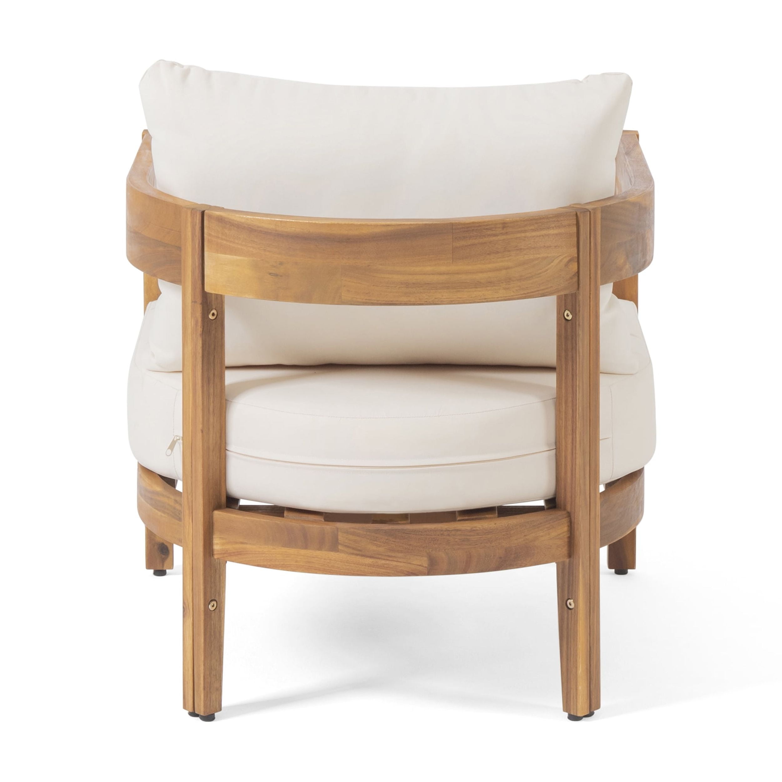Includes: Two (2) Club Chairs Frame Material: Acacia Wood Cushion Material: Water Resistant Fabric Cushion Composition: 100% Polyester Frame Finish: Teak Cushion Color: Beige Hand-Crafted Details Assembly Required Dimensions: 29.50 inches deep x 27.50 inches wide x 31.50 inches high Seat Dimensions: 28.25 inches deep x 24.50 inches wide x 10.50 inches high Arm Height: 24.75 inches