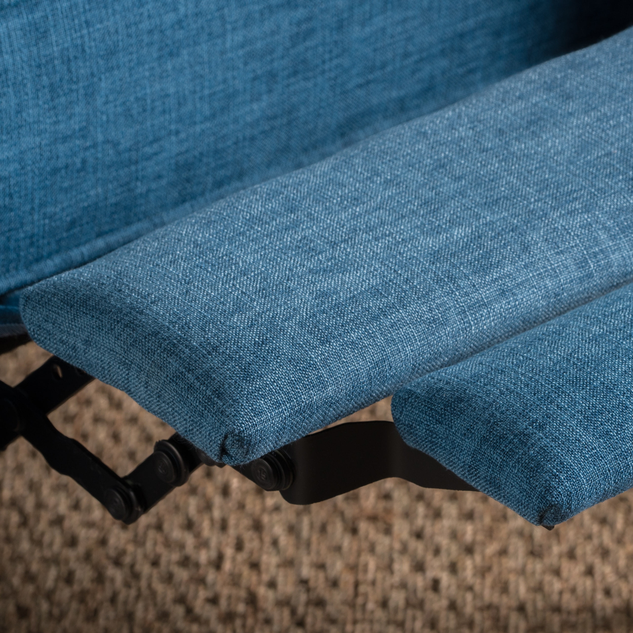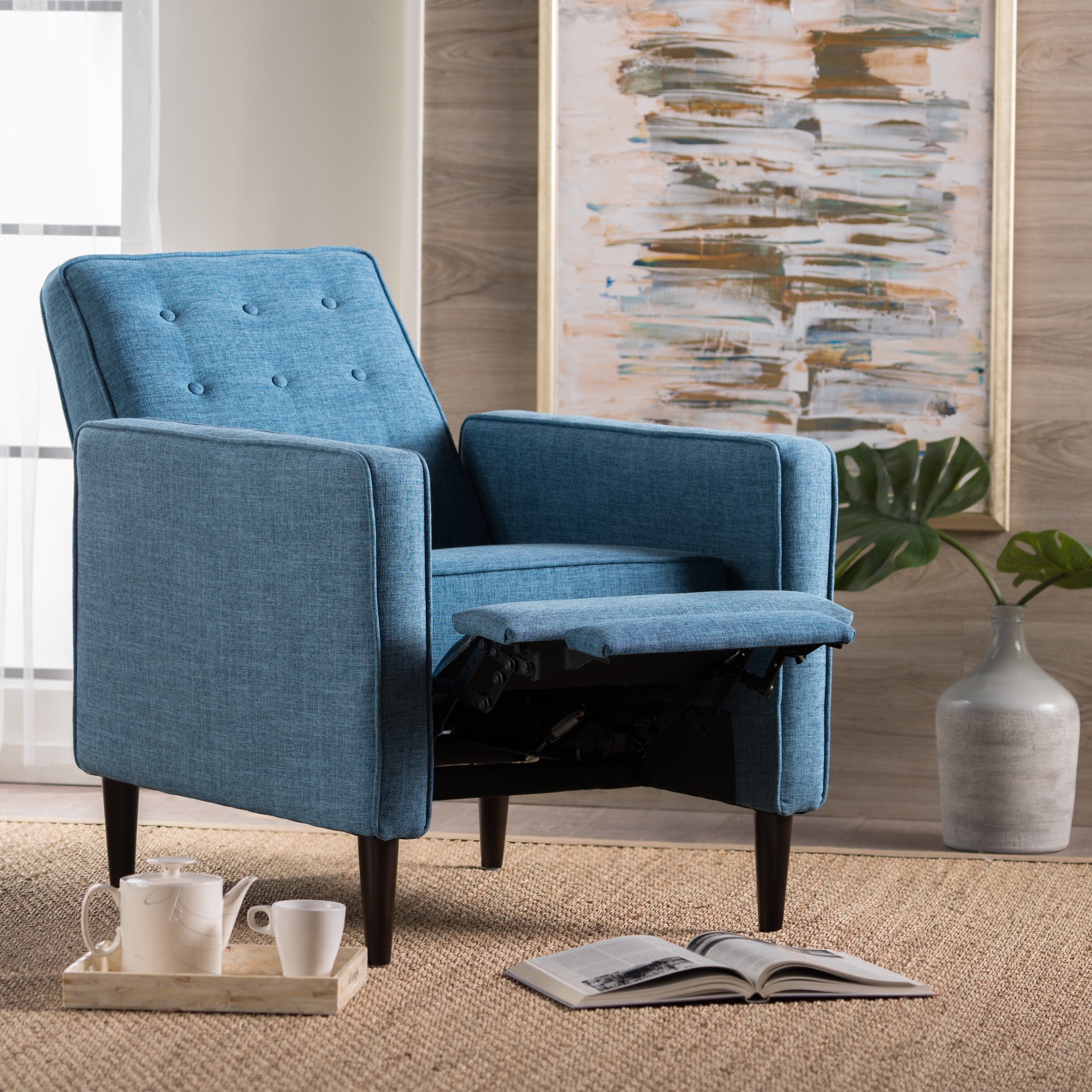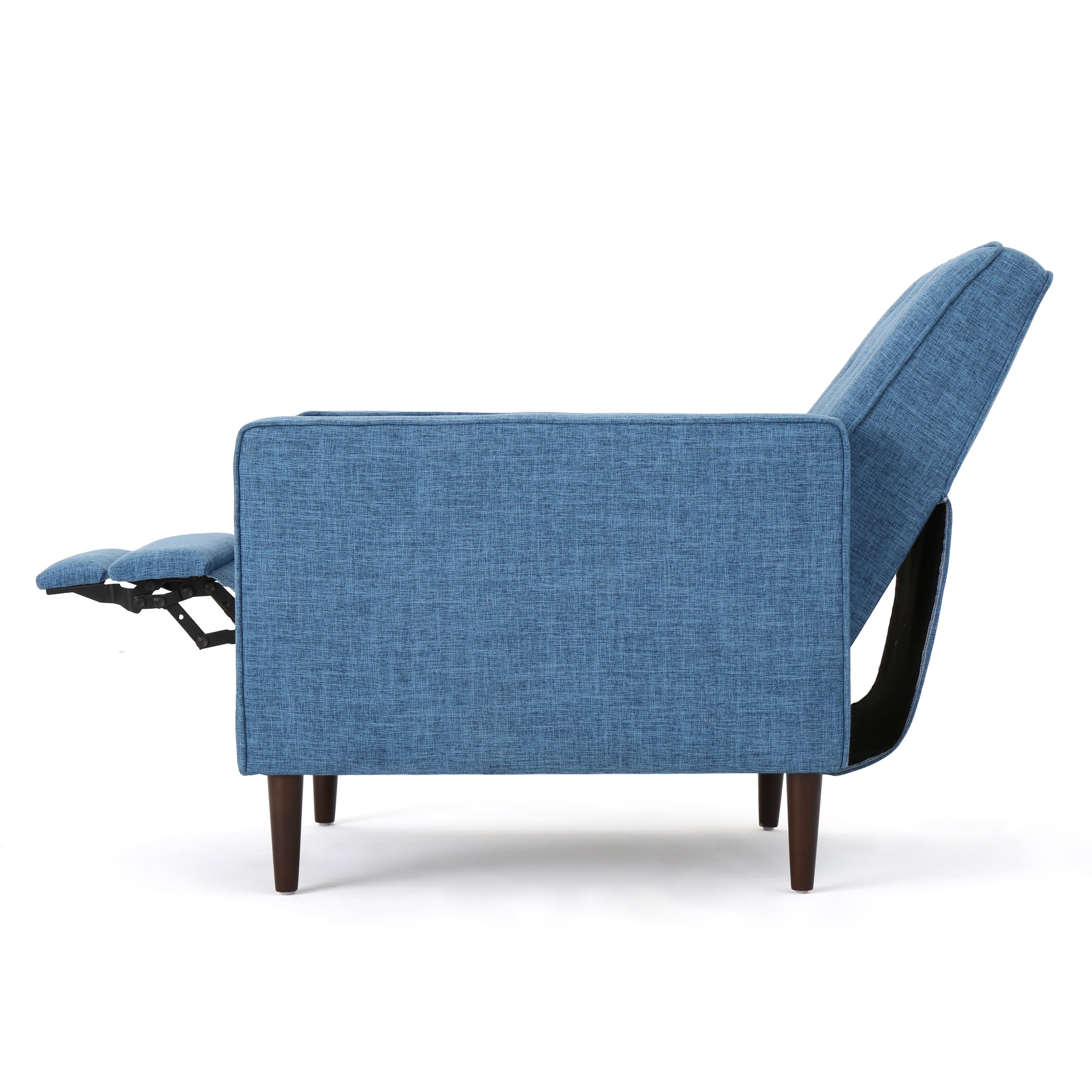Includes: One (1) Recliner Some Assembly Required Dimensions: 34.25 inches deep x 27.00 inches wide x 38.00 inches high Color: Muted Blue Leg Finish: Dark Espresso Seat Height: 18.50 inches Fabric Composition: 100% Polyester Arm Height: 25.00 inches Leg Material: Birch Seat Width: 20.00 inches Material: Fabric Seat Depth: 21.50 inches
