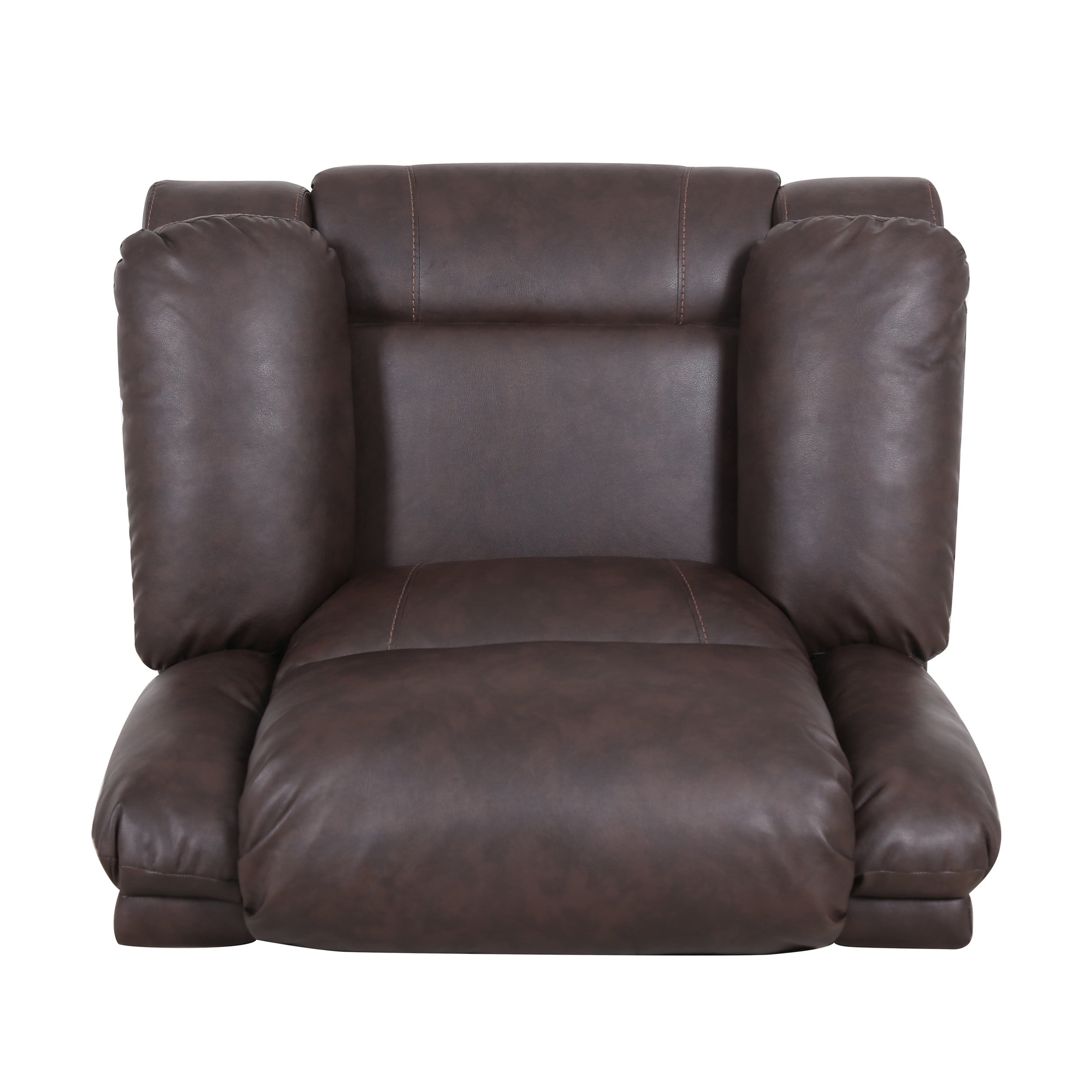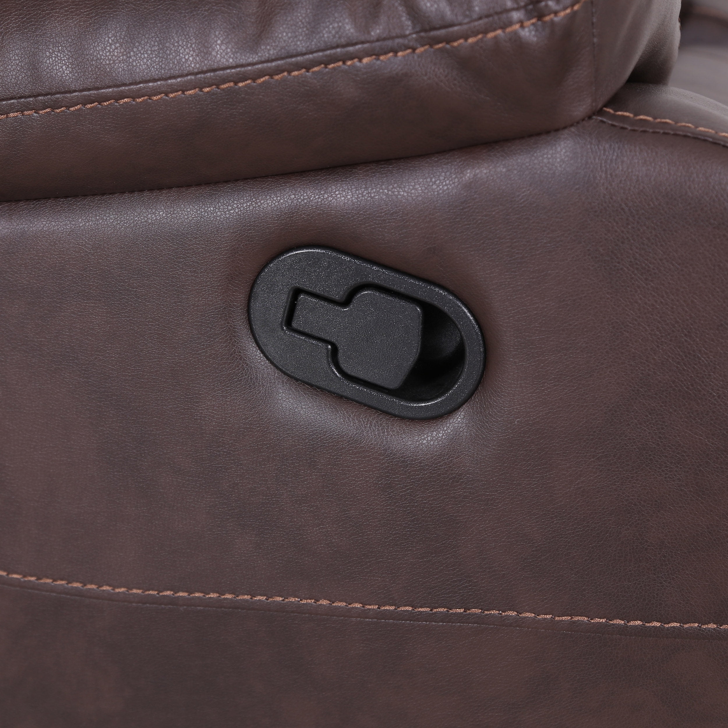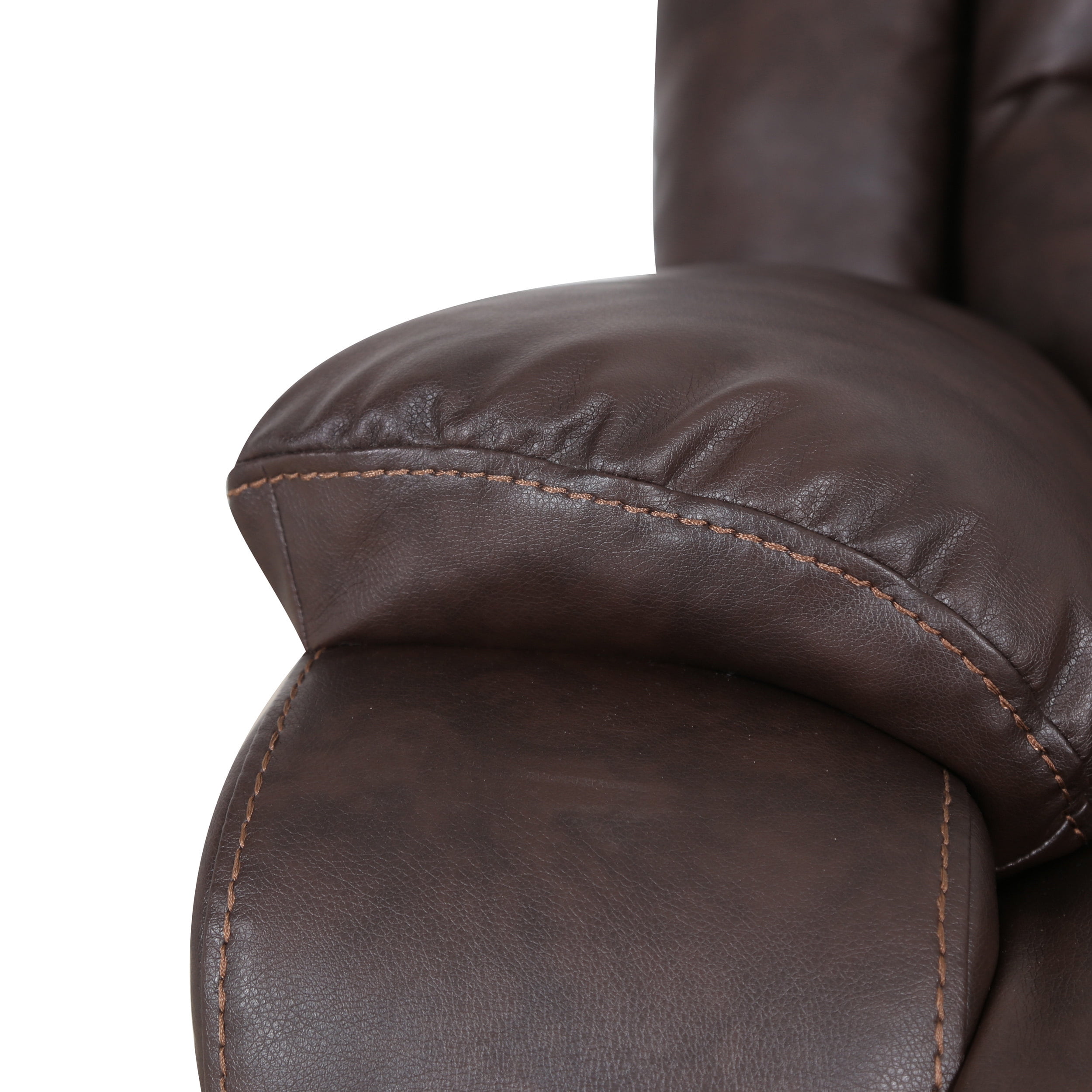 Includes: One (1) Recliner Material: Polyurethane Leg Material: Plastic Color: Dark Brown Leg Finish: Black Some Assembly Required Hand Crafted Details Dimensions When Upright: 37.75 inches deep x 38.19 inches wide x 39.75 inches high Seat Width: 19.00 inches Seat Depth: 20.50 inches Seat Height: 20.00 inches Arm Height: 25.50 inches Dimensions When Reclined: 62.99 inches deep x 38.19 inches wide x 31.50 inches high
