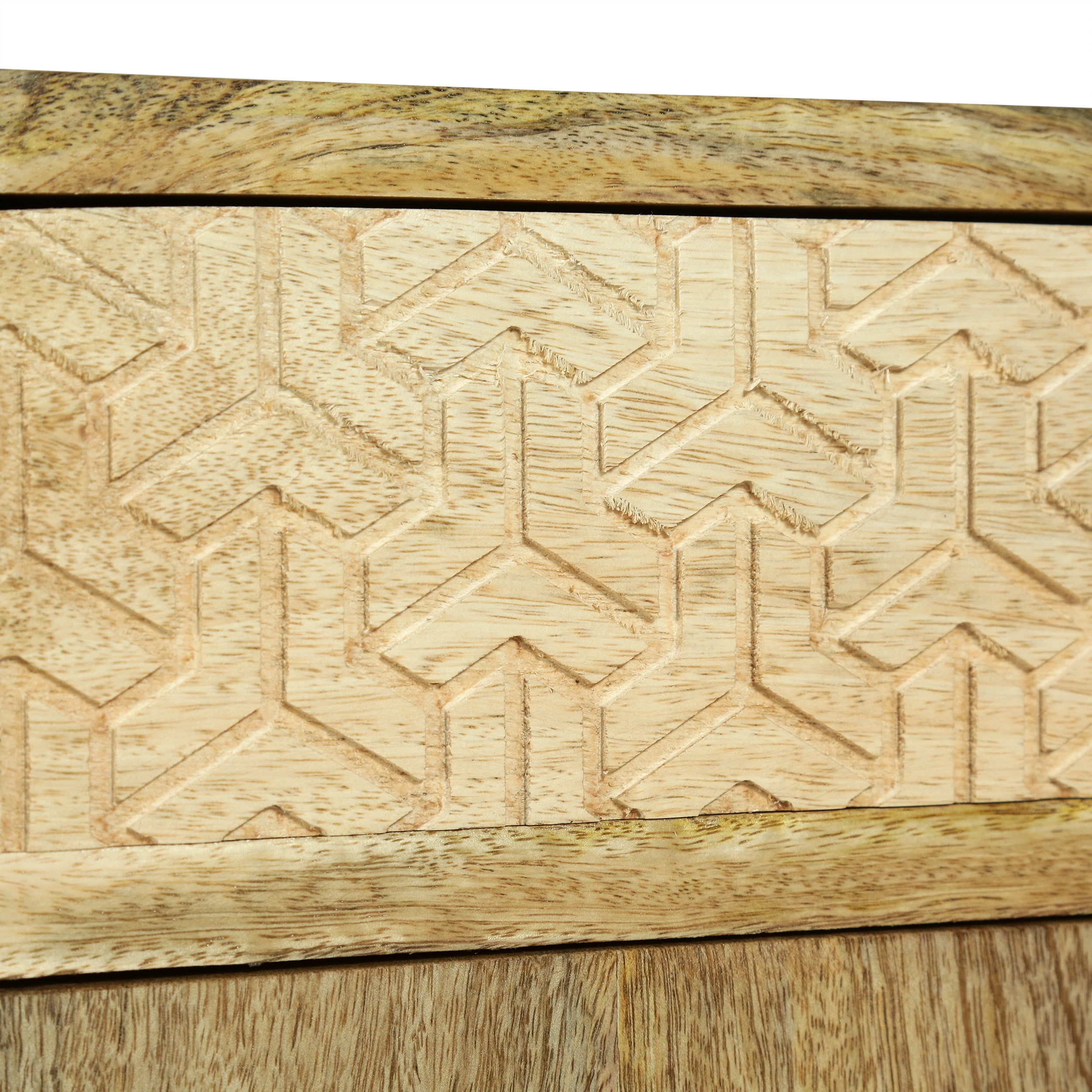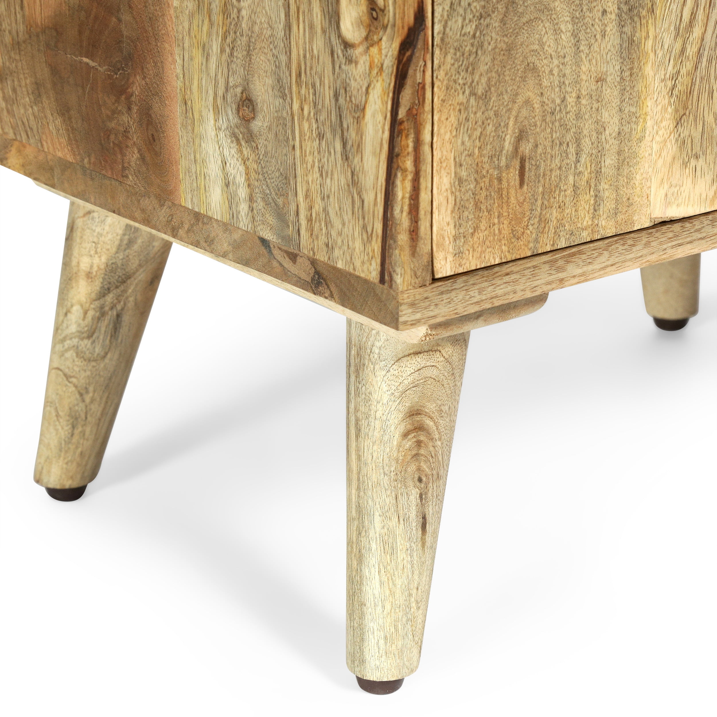 Bring your existing furniture a stylish sidekick of outstanding function. Featuring a rich mango wood structure for a one-of-a-kind design, our nightstand brings a stunning bohemian look to your home that is completed with a beautifully carved geometric texture and tapered legs. This handcrafted nightstand is the perfect companion to any living space with its drawer and cabinet space for storing and organizing your clutter. Blending seamlessly with your existing decor, this accessory brings a perfect amount of stylish function and carefree aesthetics to your bedside. BOHO: For a carefree, unconventional look and a variety of textures for your interior space, our nightstand brings an earthy boho touch to your decor by combining handcrafted mango wood with a beautifully carved geometric texture. HANDCRAFTED DESIGN: This accessory is expertly designed and handcrafted with artisan expertise. Any natural variations are not product flaws, but rather, will ensure that your purchase is truly a one-of-a-kind product. MANGO WOOD: Mango wood features gorgeous golden browns with natural hues that come from spalting, making each piece a one-of-a-kind color. Not only does this hardwood showcase unique patterns and take well to stains, but it also offers dense durability to resist wear and tear. STORAGE SPACE: This nightstand comes with one drawer and one cabinet space for storing and organizing all of your items. This is finished with small matching knobs for easy access to your items.