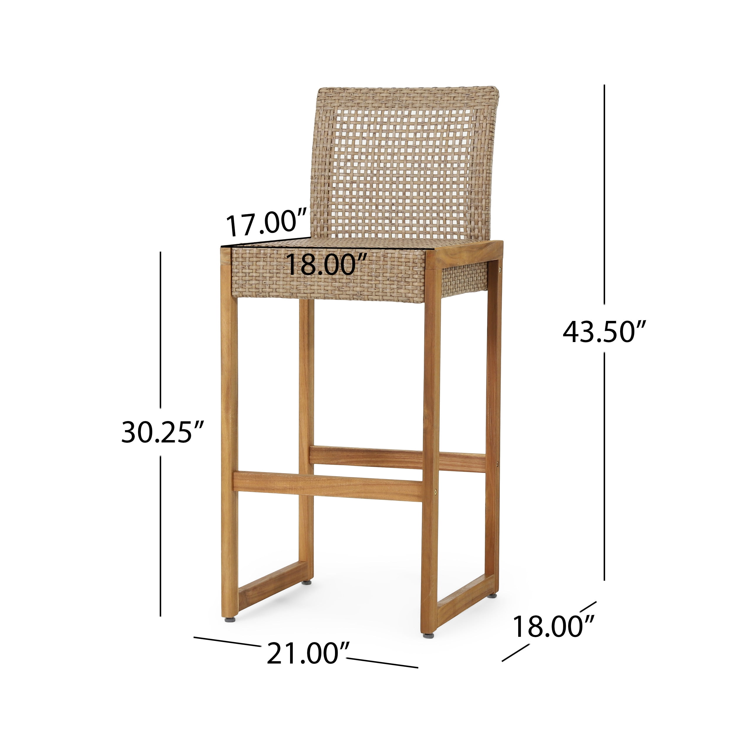 Includes: Two (2) Barstools Material: Faux Rattan Frame Material: Acacia Wood Color: Light Multibrown Frame Color: Teak Assembly Required Dimensions: 21.00 inches deep x 18.00 inches wide x 43.50 inches high Seat Dimensions: 17.00 inches deep x 18.00 inches wide x 30.25 inches high Footrail Height: 12.00 inches Weight Capacity: 400 lbs