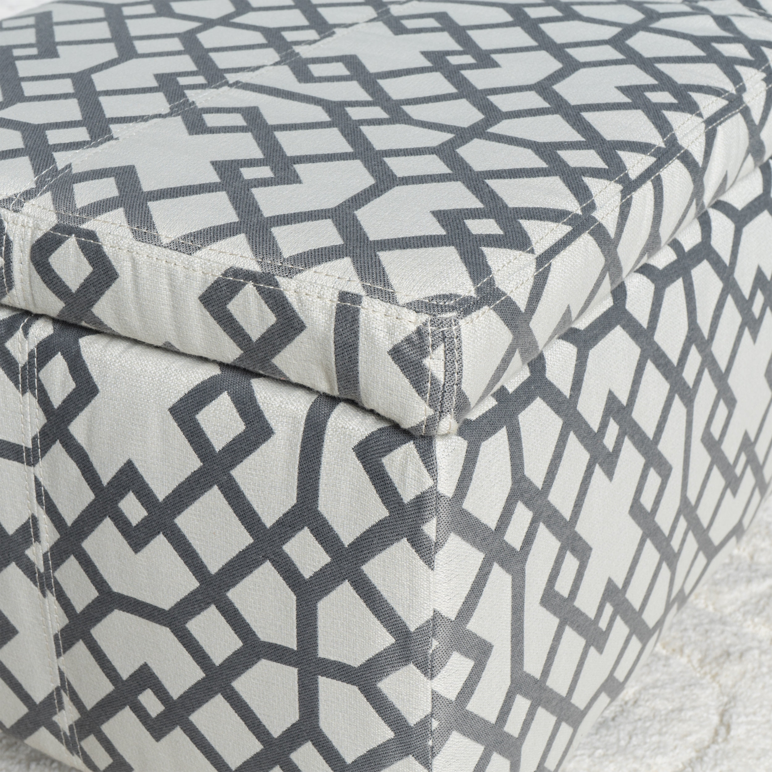 Includes: One (1) Storage Ottoman Material: Fabric Fabric Composition: 100% Polyester Leg Material: Birch Color: Grey Geometric Pattern Leg Finish: Dark Brown Light Assembly Required Dimensions: 17.50 inches deep x 51.25 inches wide x 16.25 inches high