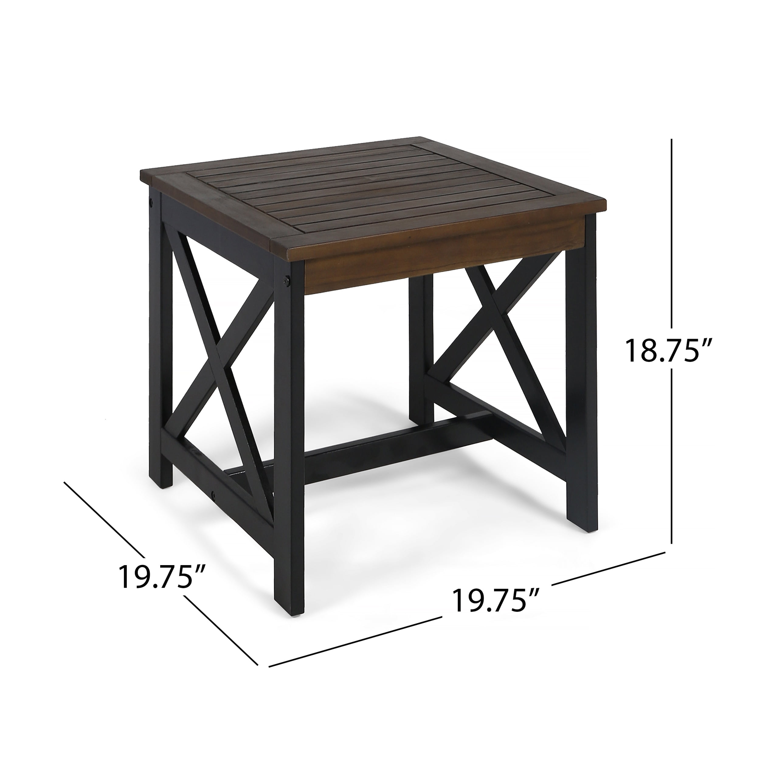 This two toned end table is a wonderful addition to any sofa or chat set. The modern farmhouse design of this end table pairs a dark brown finished table top with contrast legs. Made from acacia wood with a two toned design, this end table is both sturdy as well as stylish. Designed to complement many types of farmhouse decors, you can place this end table next to any sofa and the table will blend seamlessly. MODERN FARMHOUSE: The popular farmhouse look is complemented with a modern touch, featuring the two toned look with the strong dark brown wood colors and contrasted legs. TWO TONE: The two toned finish of this table complements any décor. With simple color are easy to match with and help create one cohesive look. ACACIA WOOD: Made with naturally weather resistant acacia wood for a sturdy and stylish build. VERSITLE: Easily complements many types of farmhouse decors, this end table can work with any patio set. ONE YEAR WARRANTY: With a one year warranty, you can enjoy your set all summer long knowing you are covered till your next summer season. ASSEMBLY REQUIRED: Some assembly is required for this table. All of the instructions and tools needed for assembly are included. Features: Includes: One (1) Side Table Frame Material: Acacia Wood Table Top Color: Dark Brown Leg Color: Black Hand Crafted Details Specifications: Product Dimensions: 18.75″H x 19.75″W x 19.75″D Product Weight: 12.13 lbs
