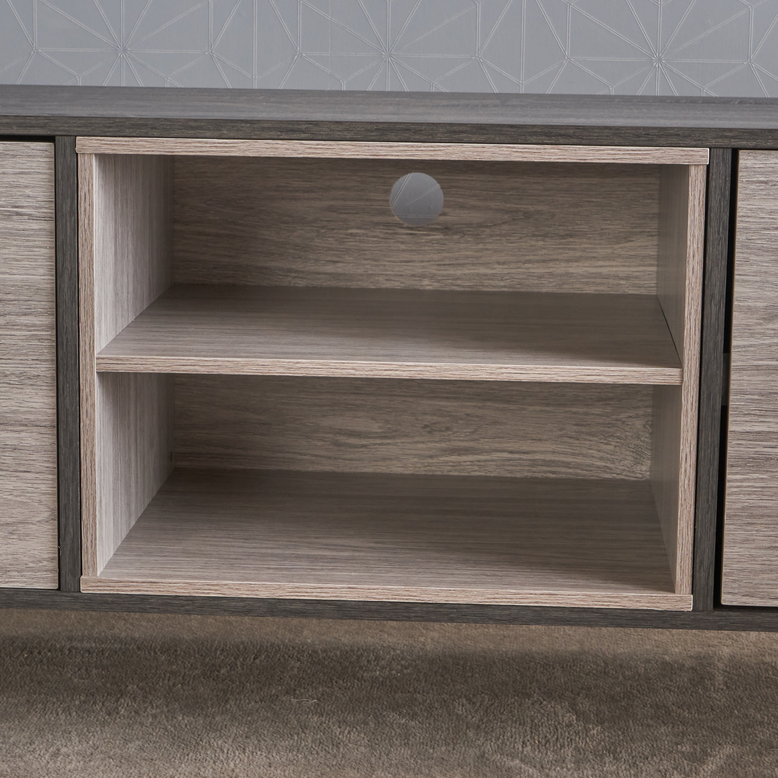 Includes: One (1) TV Stand Material: Particleboard Leg Material: Iron Finish: Grey Oak Accent Finish: Sonoma Grey Oak Leg Finish: Black Assembly Required Hand Crafted Details Dimensions: 16.25 inches deep x 71.10 inches wide x 21.10 inches high