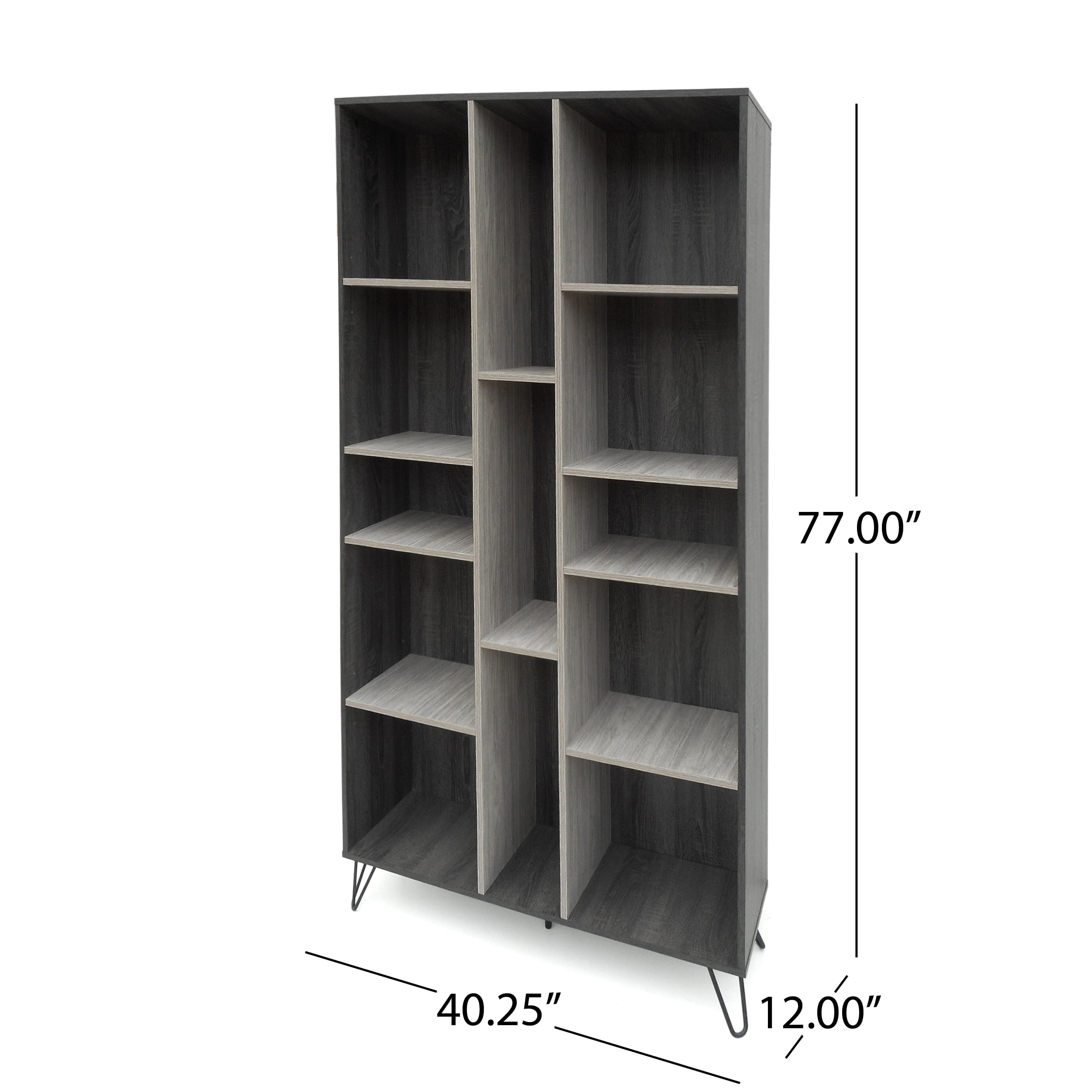 Includes: One (1) Bookshelf Material: Particleboard Leg Material: Iron Finish: Grey Oak Accent Finish: Sonoma Grey Oak Leg Finish: Black Assembly Required Hand Crafted Details Dimensions: 12.00 inches deep x 40.25 inches wide x 77.00 inches high