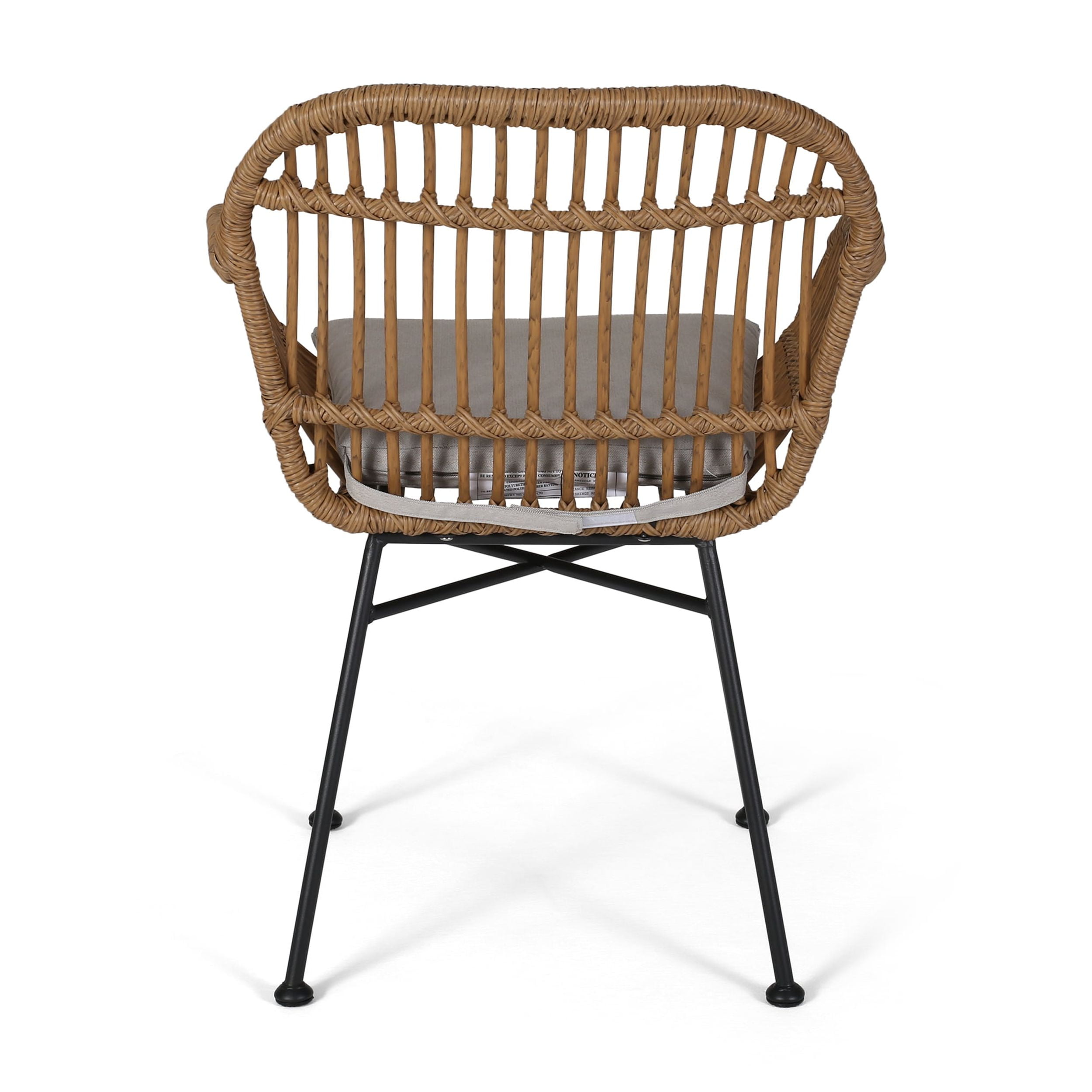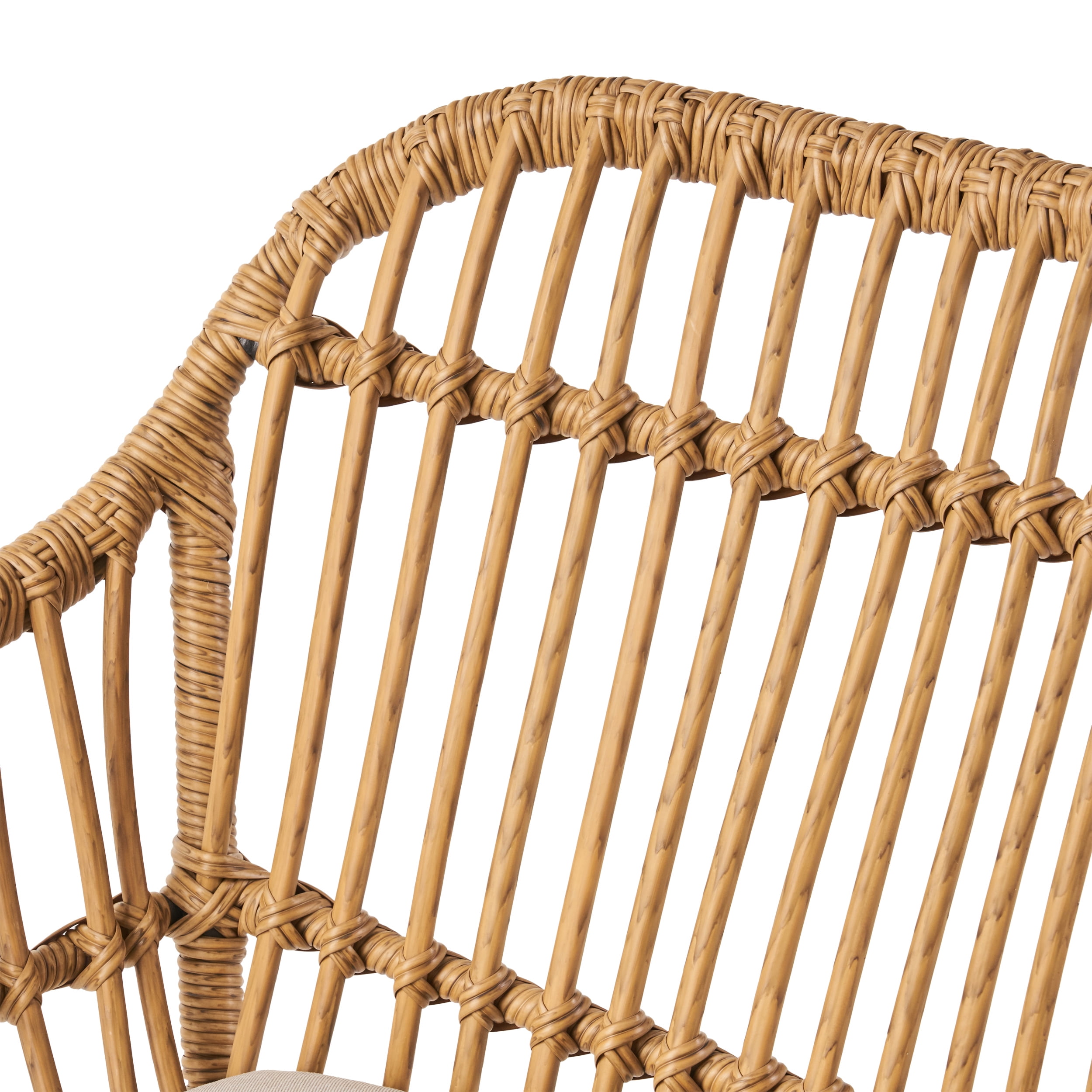 Includes: Two (2) Chairs Material: Faux Rattan Cushion Material: Water Resistant Fabric Cushion Composition: 100% Olefin Leg Material: Steel Rattan Finish: Light Brown Cushion Color: Beige Leg Finish: Black Some Assembly Required Hand Crafted Details Dimensions: 24.00 inches deep x 24.00 inches wide x 31.75 inches high Seat Dimensions: 16.50 inches deep x 14.00 inches wide x 17.50 inches high Arm Height: 25.75 inches