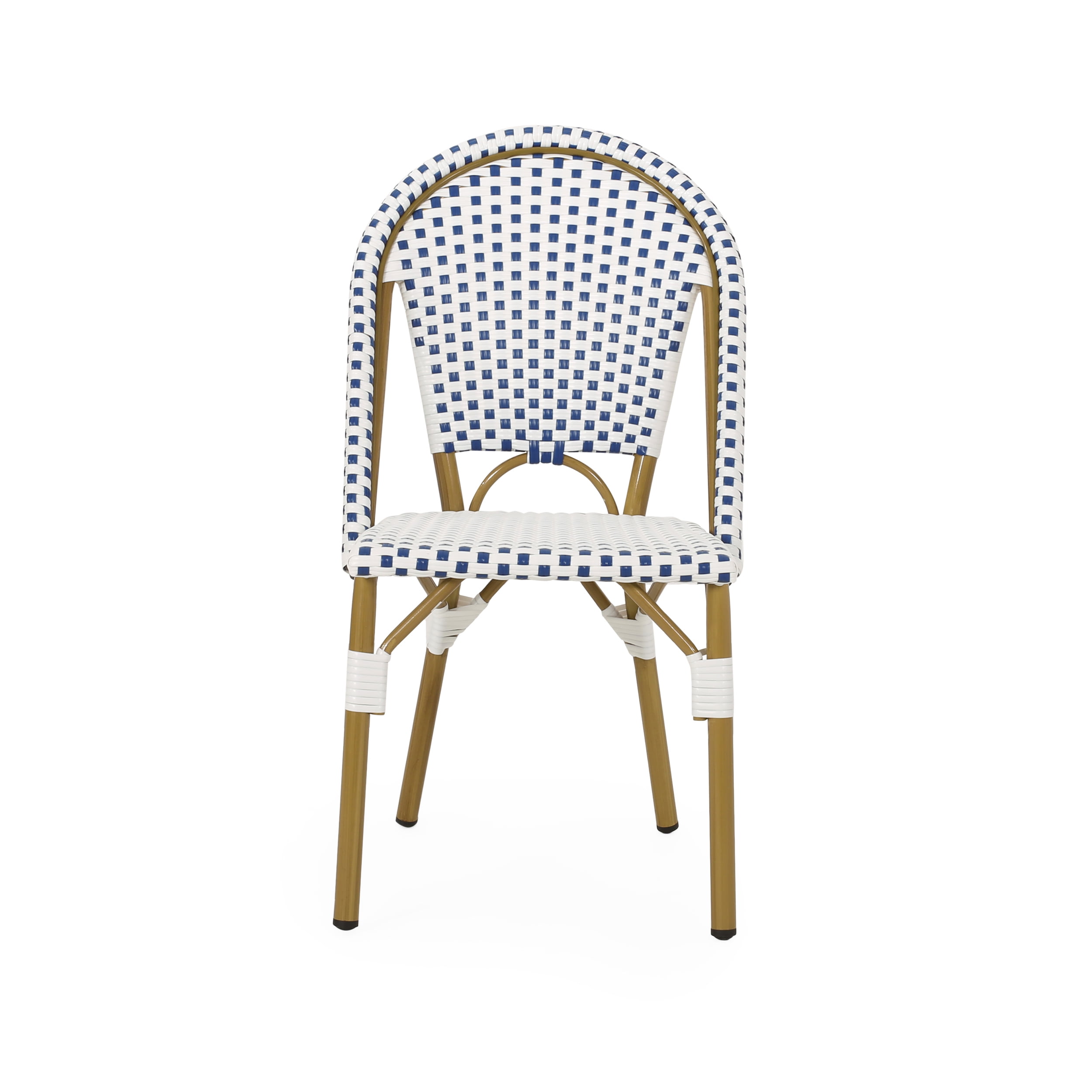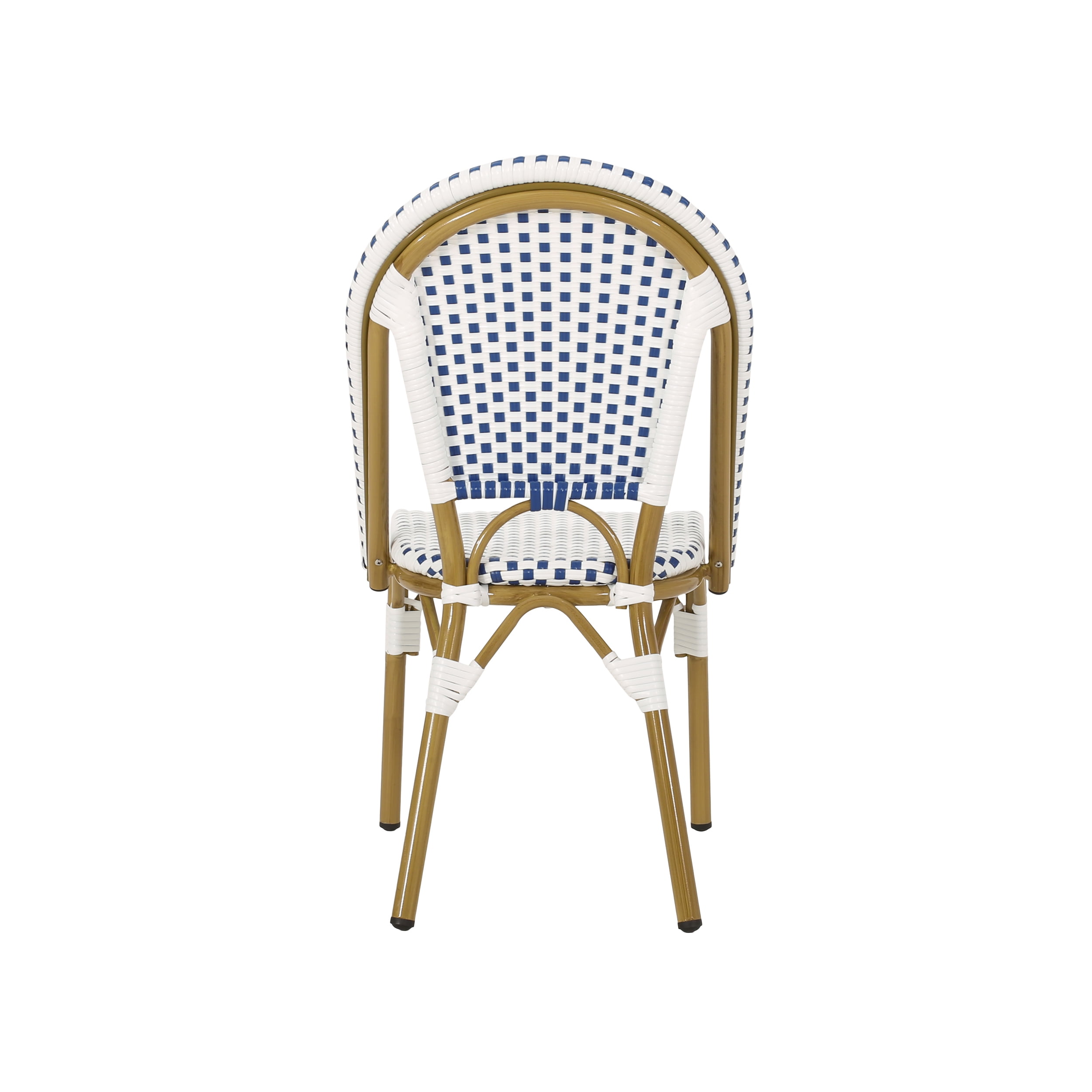 Set includes 2 dining chairs Material: Aluminum, faux rattan Finish: Blue, white Frame material: Aluminum Seat and back material: Faux rattan Wrapping material: Faux rattan Frame finish: Bamboo print Multiple color options For residential use only. Not intended for commercial purposes.
