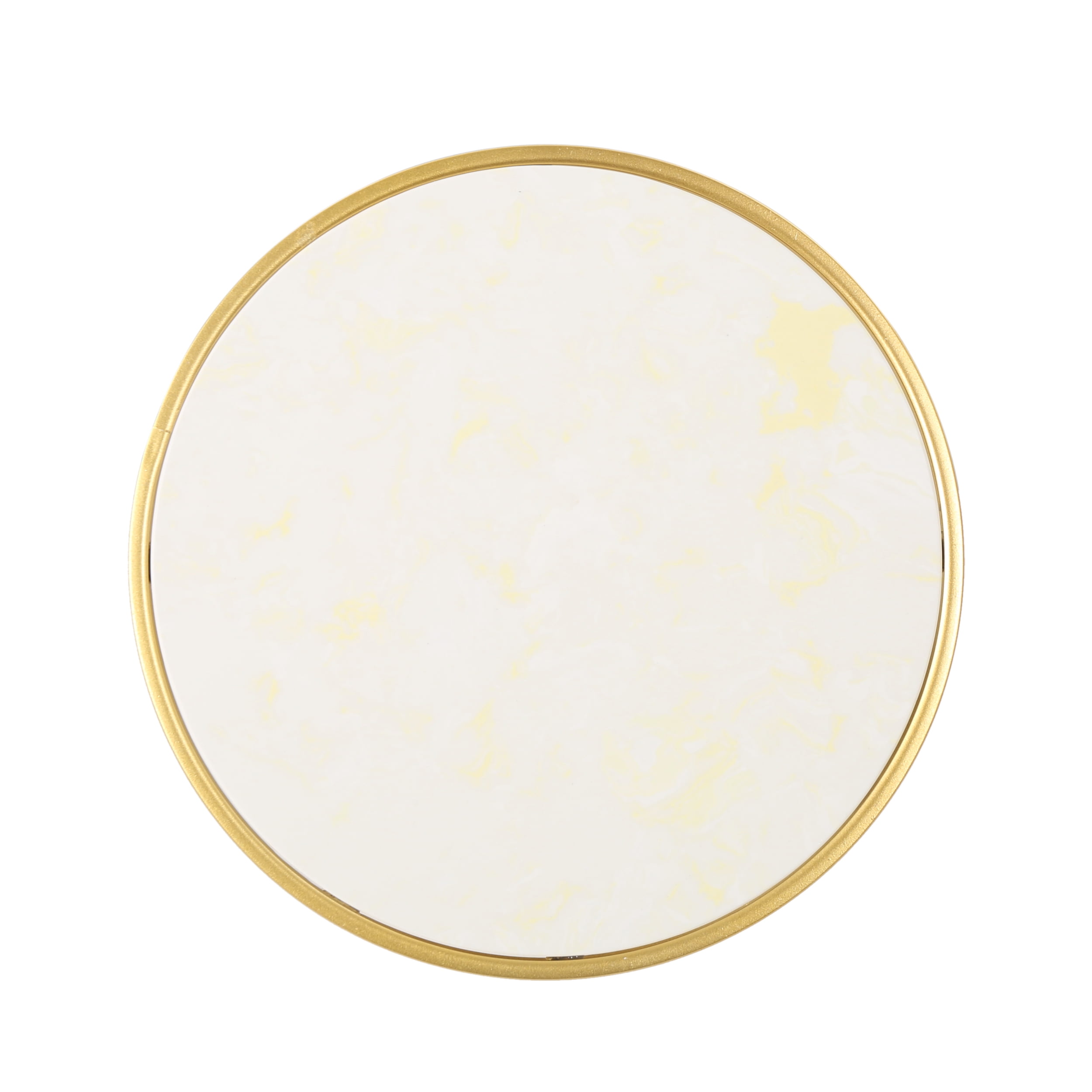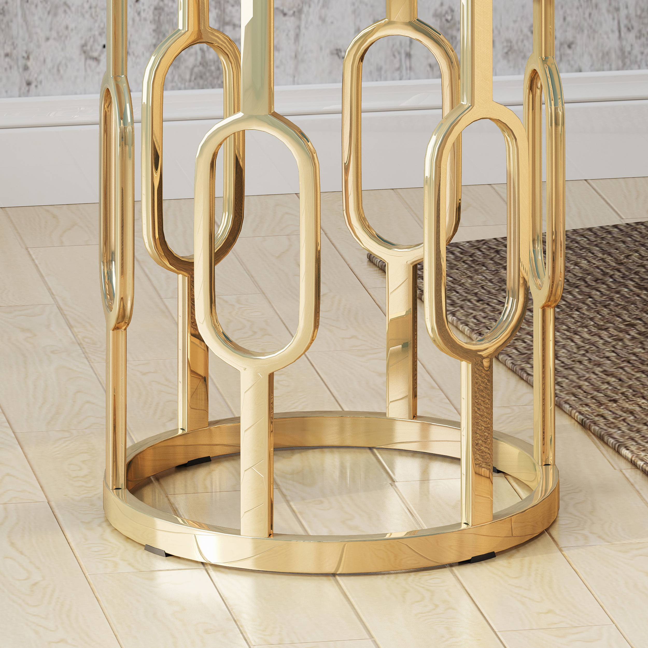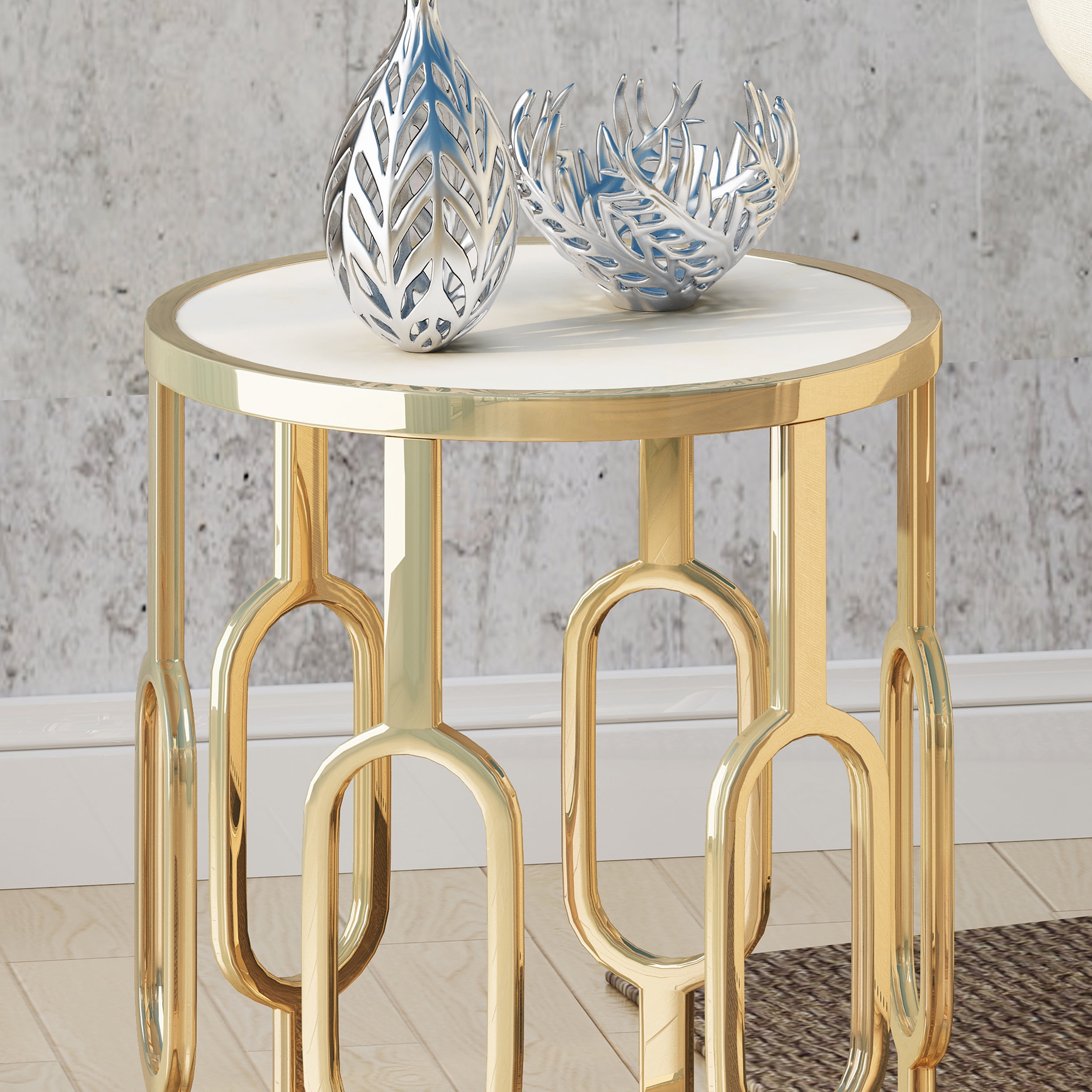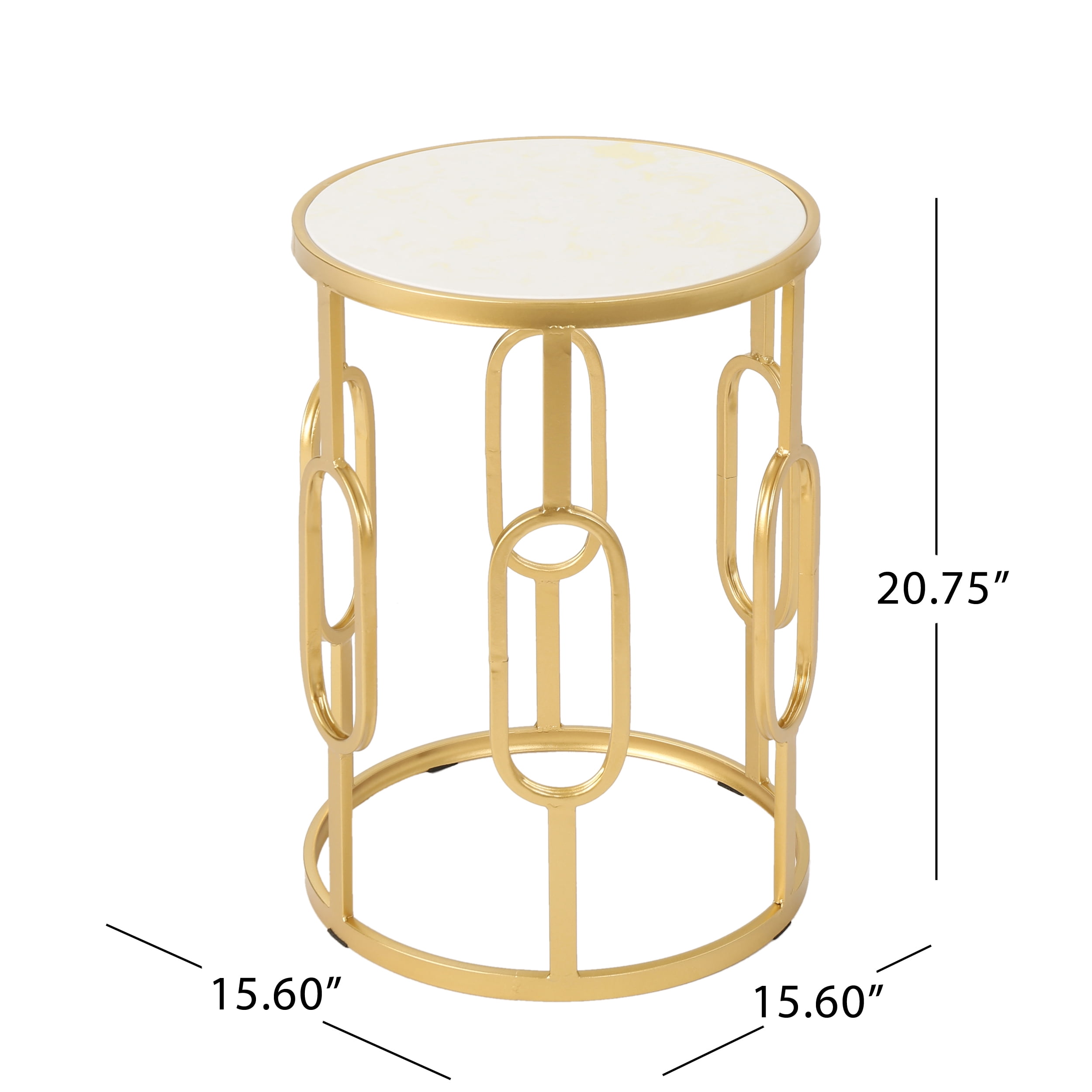 Includes: One (1) Side Table Material: Artificial Stone Frame Material: Iron Stone Finish: White Frame Finish: Gold No Assembly Required Hand Crafted Details Dimensions: 15.60 inches deep x 15.60 inches wide x 20.75 inches high