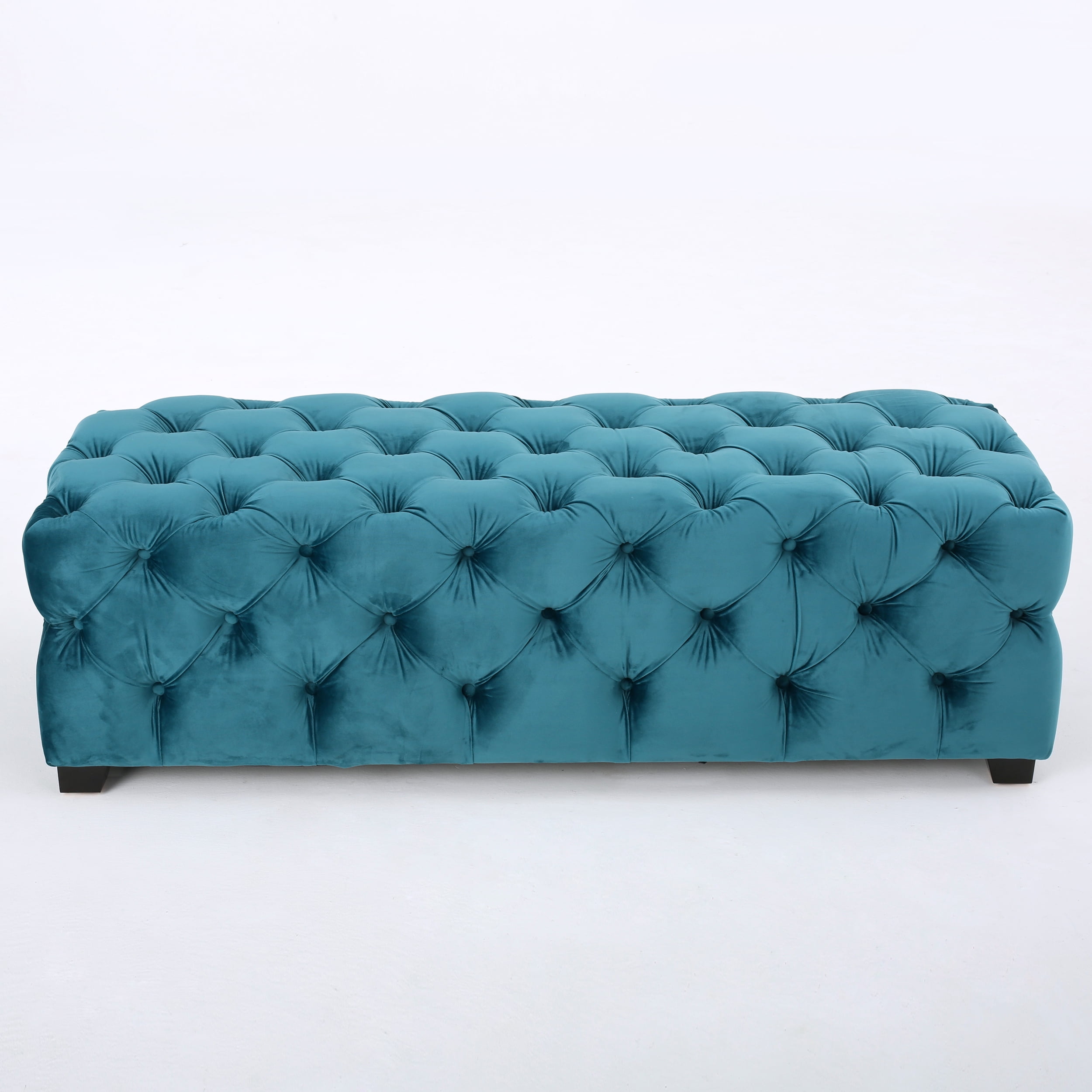 Includes: One (1) Ottoman Frame Finish: Dark Brown Some Assembly Required Dimensions: 18.75 inches deep x 50.75 inches wide x 15.75 inches high Color: Dark Teal Materials: Velvet, Birch