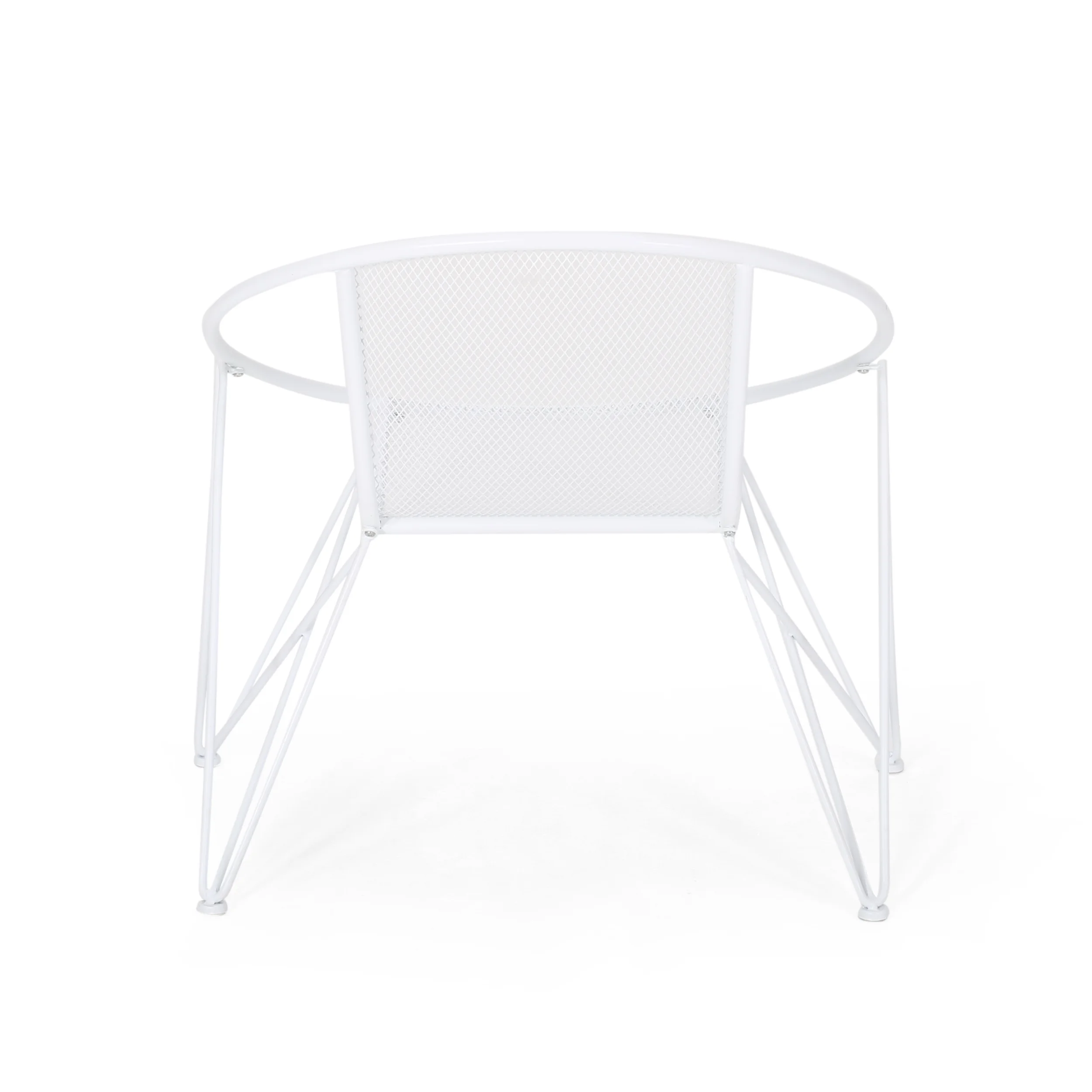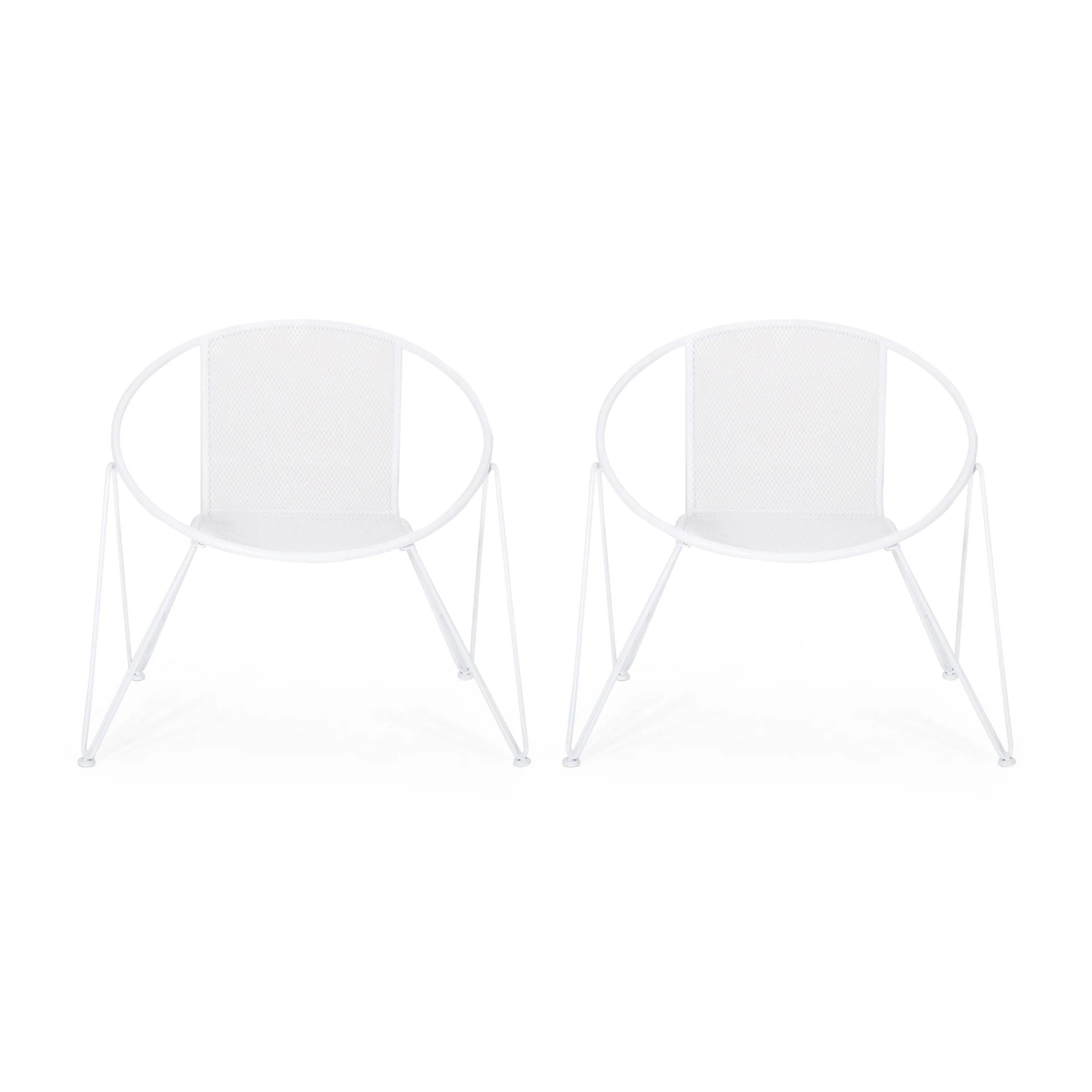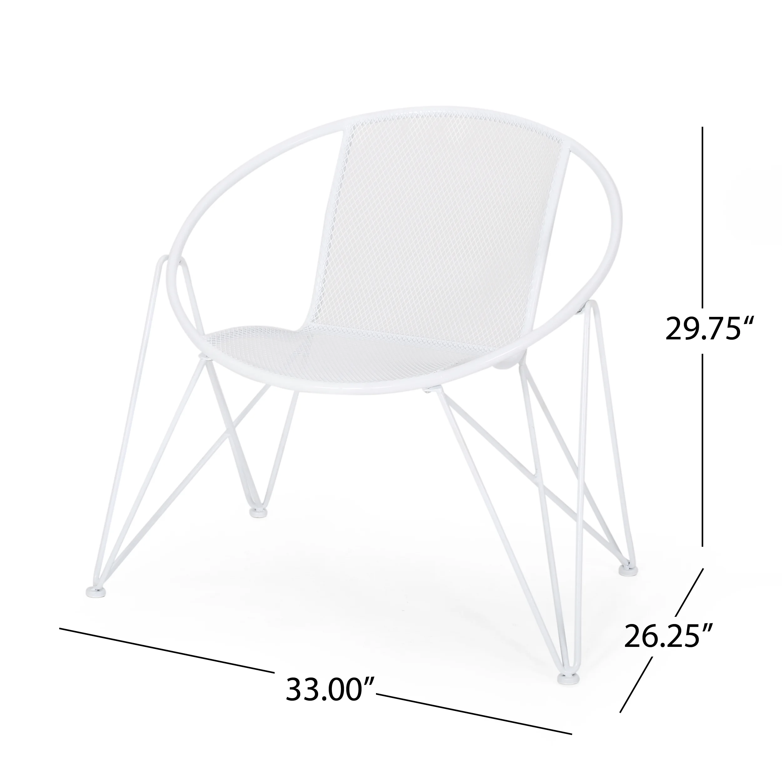 Accent your outdoor décor with a set of chairs that will bring a lively atmosphere to your home. Featuring a breezy mesh look and rounded silhouette, our chair set provides a timeless style to your home while providing ultimate comfort. Consisting of an iron frame and hairpin legs, this charming piece is made to last with its intricate, durable structure and refreshing finish. As the perfect backyard companion, this chair set allows you to relax and enjoy the summer sun for years to come. MODERN: With clean lines contrasted perfectly by its rounded silhouette, our chair is the ideal modern accessory for your interior space. Finished with wide hairpin legs, this chair not only has a sleek, minimalistic look but also provides a stable structure. MESH DESIGN: The seating of this chair offers a fine diamond mesh design that allows for air to circulate and ventilate body heat on a hot day. HAIRPIN LEGS: To complete the sleek look and feel, the hairpin legs of these chairs provide both style and stability. The minimalist look of the legs ties in perfectly with the modern design. IRON FRAME: Constructed of iron, the frame of these chairs are made to be incredibly durable, ensuring that this piece will hold up under heavy use. Combined with the hairpin legs, this chair offers incredible stability for your home. ASSEMBLY REQUIRED: Some assembly is required for this chair set. All of the instructions and tools needed for assembly are included. This comes as a set of two. Features: Includes: Two (2) Club Chairs Material: Iron Finish: Matte White Hand-Crafted Details Assembly Required Specifications: Product Dimensions: 29.75″ H x 26.25″ W x 33.00″ D Product Weight: 29.54 lbs Seat Dimensions: 17.25″ H x 16.00″ W x 17.00″ D