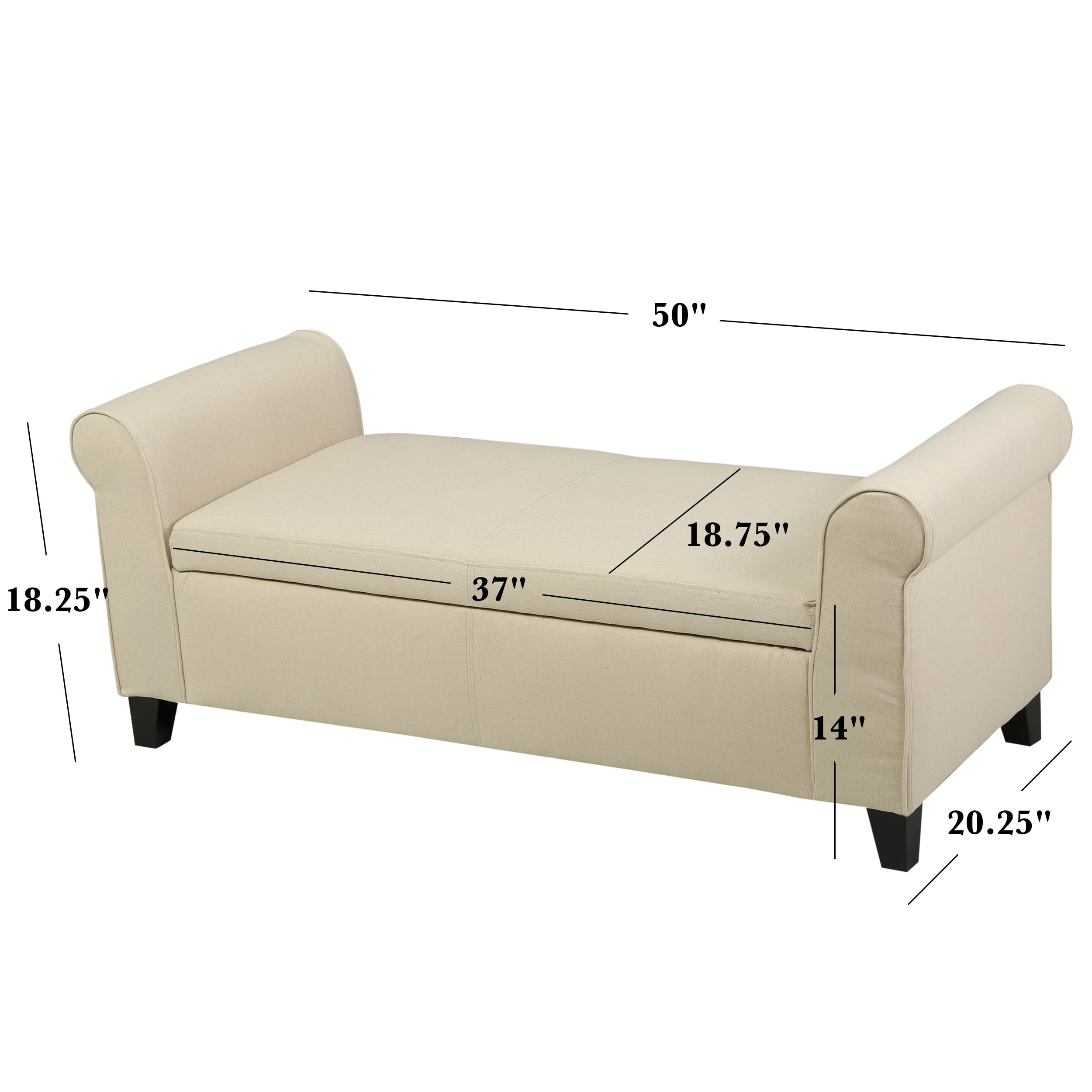 CONTEMPORARY DESIGN: Featuring smooth upholstery and beautifully rolled arms, our storage ottoman offers the look, feel, and design of a truly contemporary piece. With a minimalistic yet refined structure, this piece brings out a simplistic style that emphasizes comfort and functionality. UPHOLSTERED: Our storage ottoman is generously upholstered, giving any room a refined appearance. This provides a smooth, immaculate texture for this piece as well as a plush lid for comfortable seating ROLLED ARMS: To complete the refined contemporary look, this ottoman bench features elegantly rolled arms for a luxurious look. This adds an air of sophistication to your room and compliments the upholstery. VERSATILE: This ottoman bench can function as extra seating while you put on your shoes or can act as storage space for all of your pillows and blankets. This uses pressure hinges so that the lid will stay open on its own and will also ensure a soft close. IDEAL FOR SMALL SPACES: This ottoman bench offers a compact design that makes this set perfect for apartments or small spaces. Includes: One (1) Storage Ottoman Bench Material: Fabric Fabric Composition: 100% Polyester Leg Material: Birch Color: Beige Leg Color: Dark Brown Hand-Crafted Details Assembly Required Dimensions: 19.75 inches deep x 50.00 inches wide x 20.50 inches high Seat Dimensions: 19.75 inches deep x 37.00 inches wide x 14.00 inches high The length of the legs is 3.15 inches.