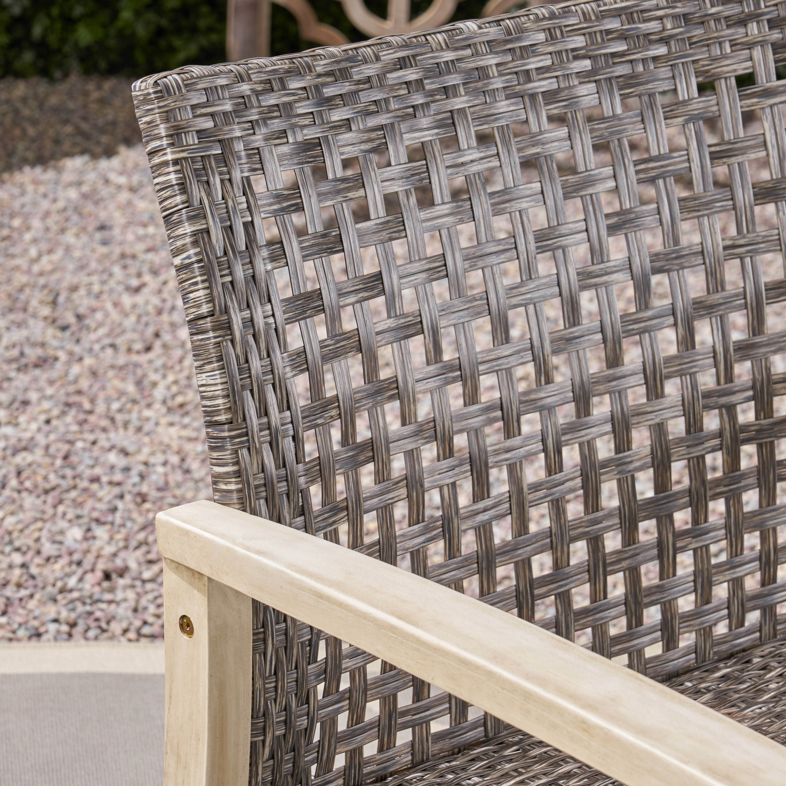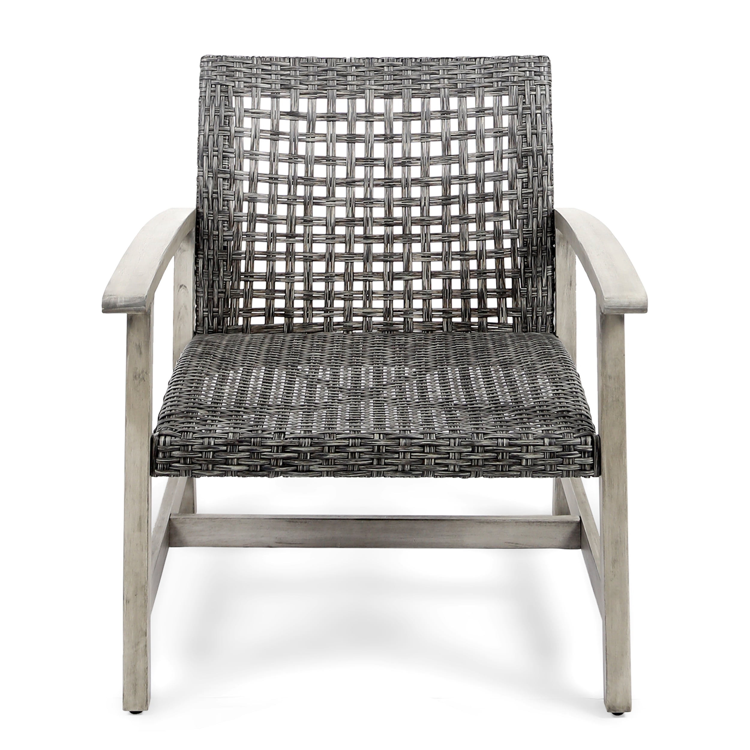 Includes: Two (2) Club Chairs and One (1) Side Table Chair Frame and Table Material: Acacia Wood Chair Seat Material: Polyethylene Wicker Frame and Table Finish: Light Gray Wicker Color: Mixed Black Hand-Crafted Details Seats: 2 Assembly Required
