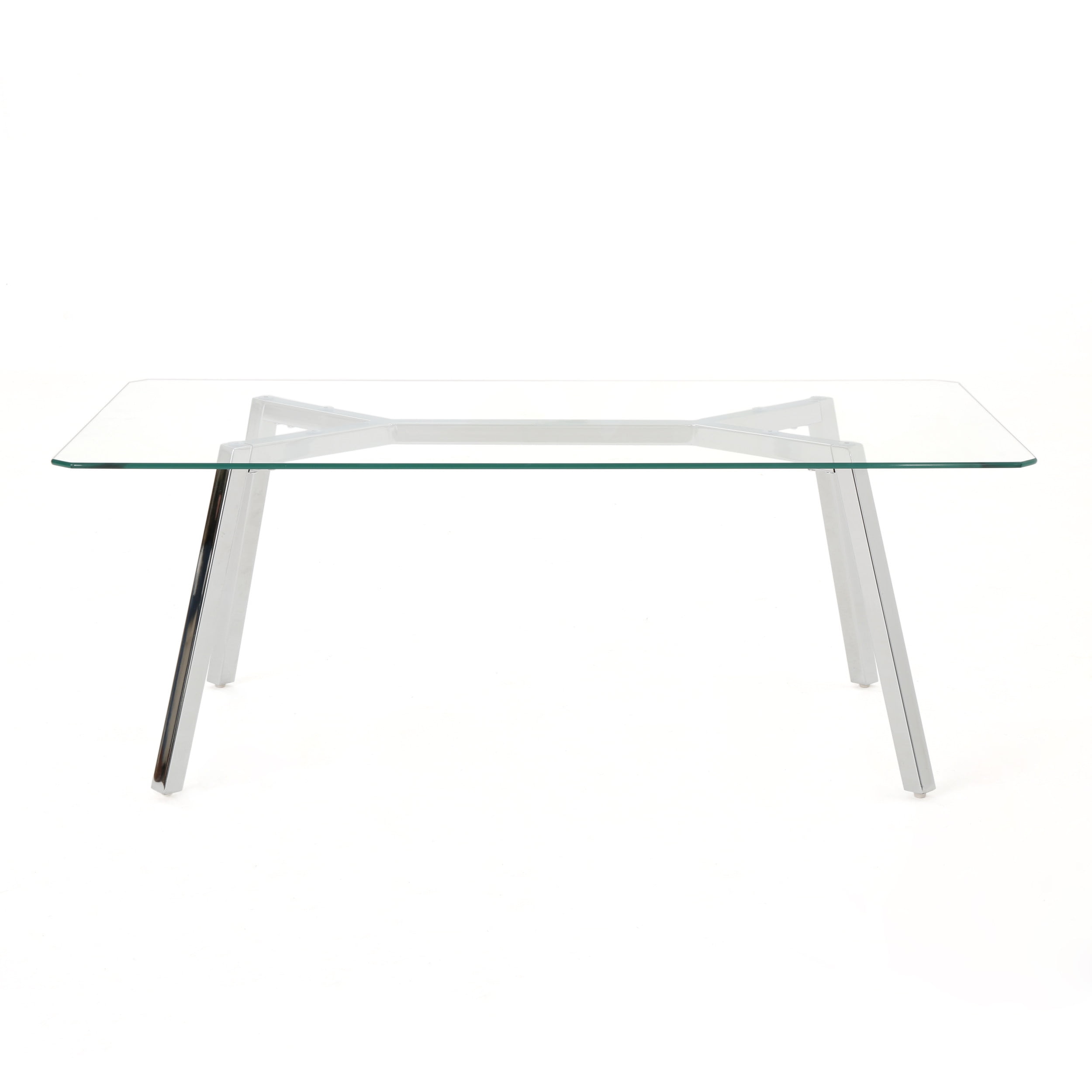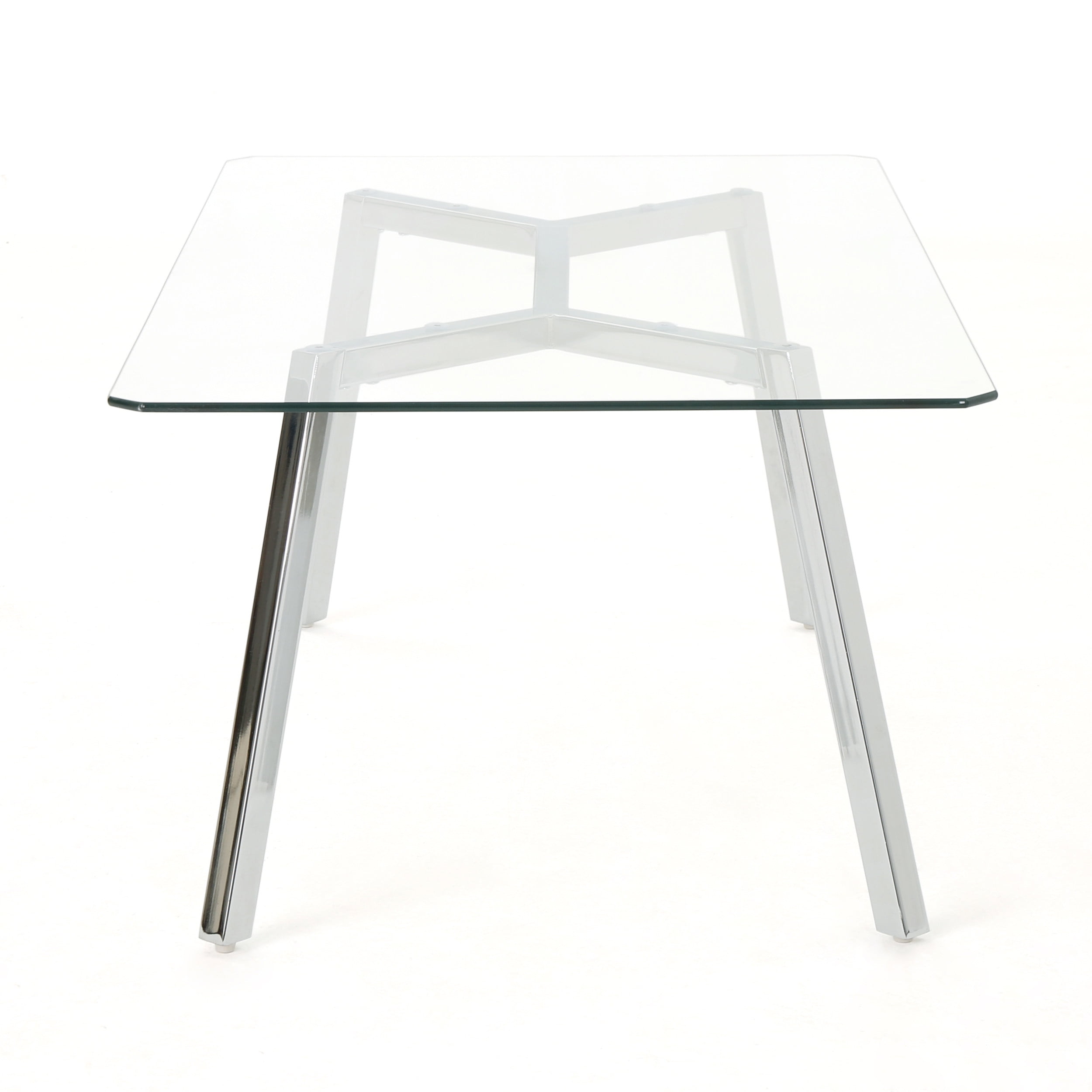 Includes: One (1) Table Material: Tempered Glass Leg Material: Metal Finish: Clear Leg Finish: Chrome Assembly Required Dimensions: 35.50 inches deep x 59.00 inches wide x 29.50 inches high Recommended Location: Indoor