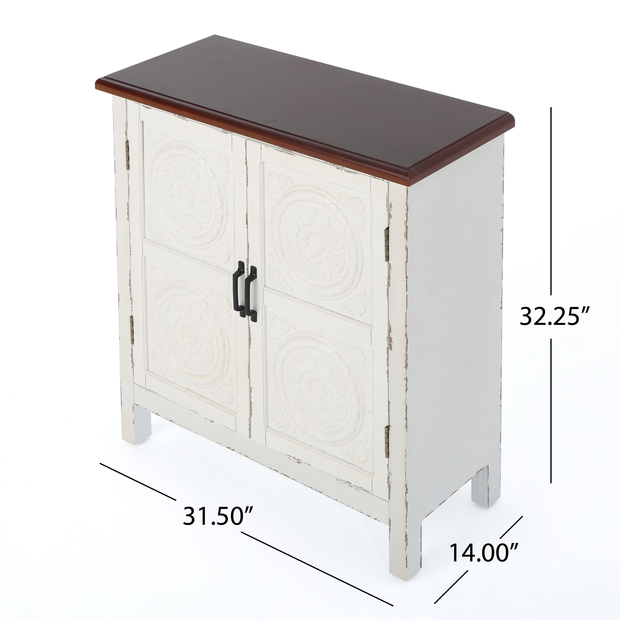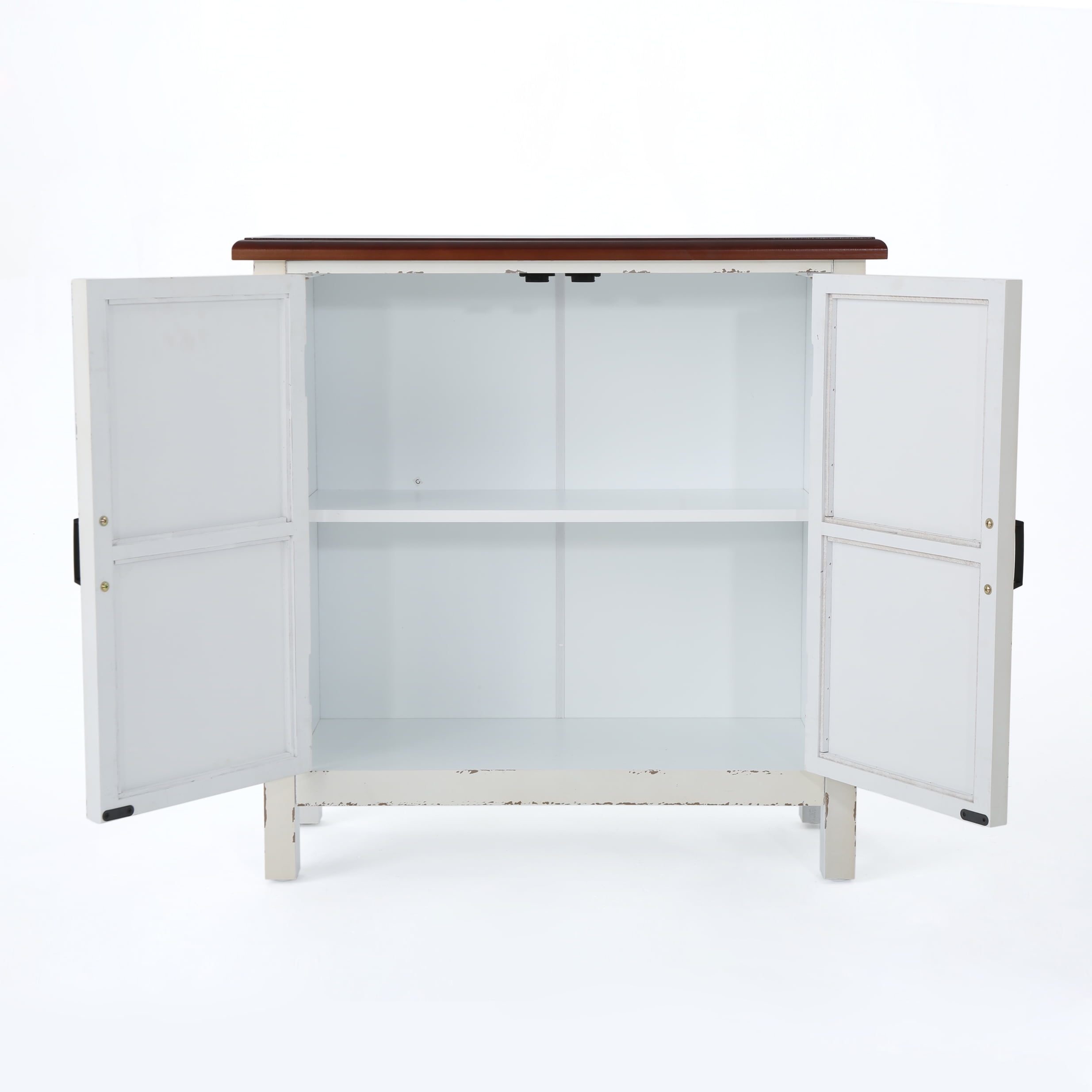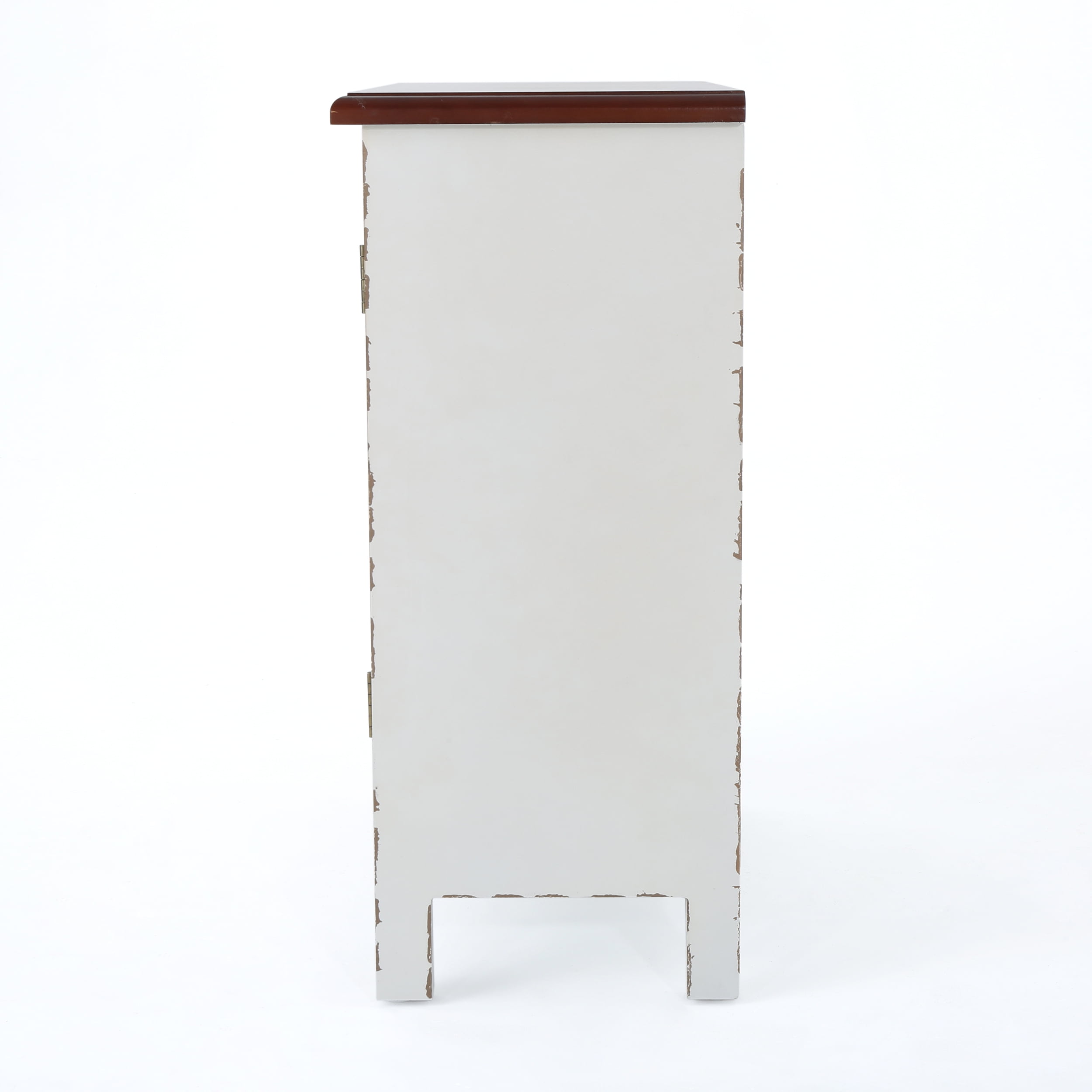 Includes: One (1) Cabinet Material: Firwood with Faux Wood Overlay Body Finish: Distressed White Top Finish: Brown Hand-Crafted Details Assembly Required Dimensions: 14.00 inches deep x 31.50 inches wide x 32.25 inches high