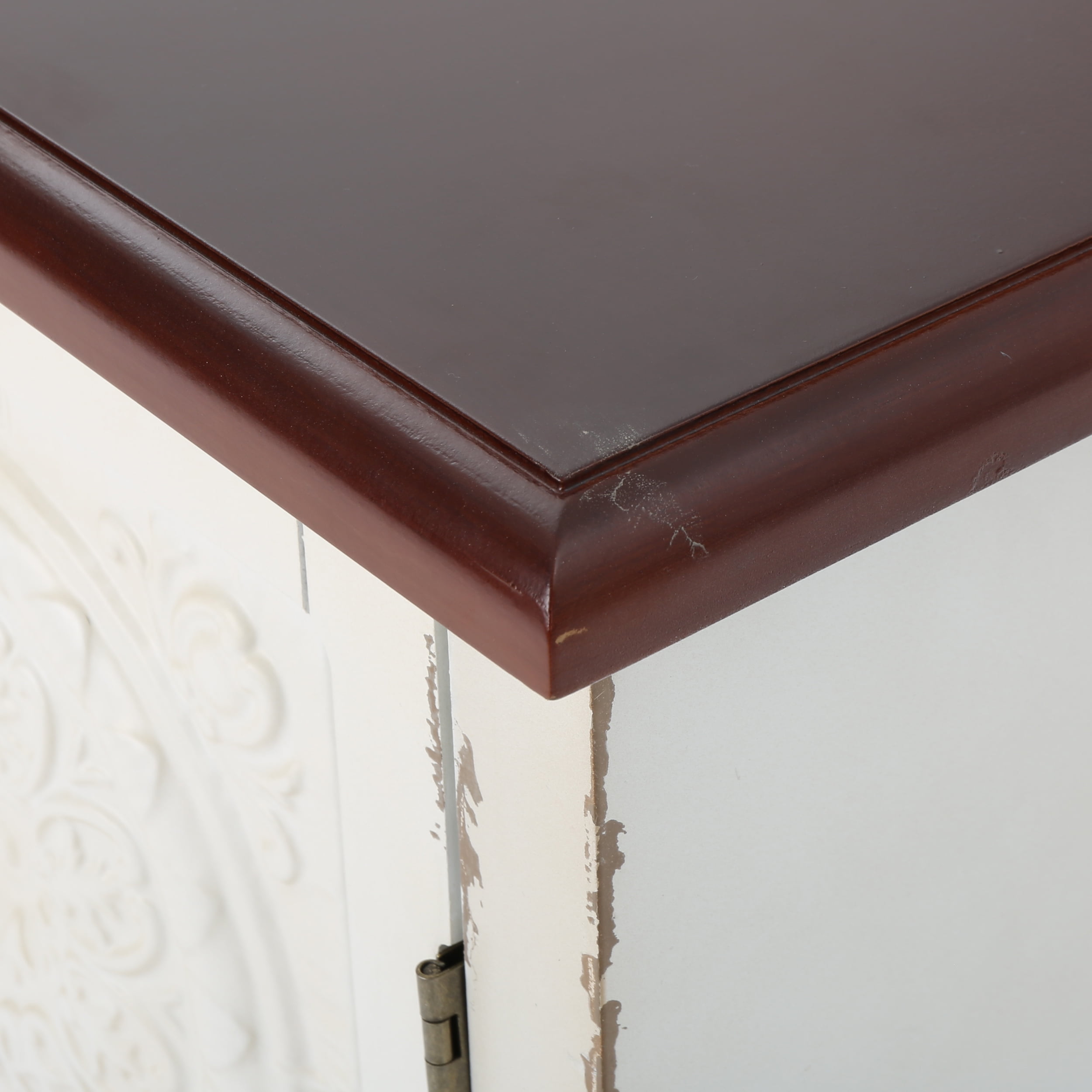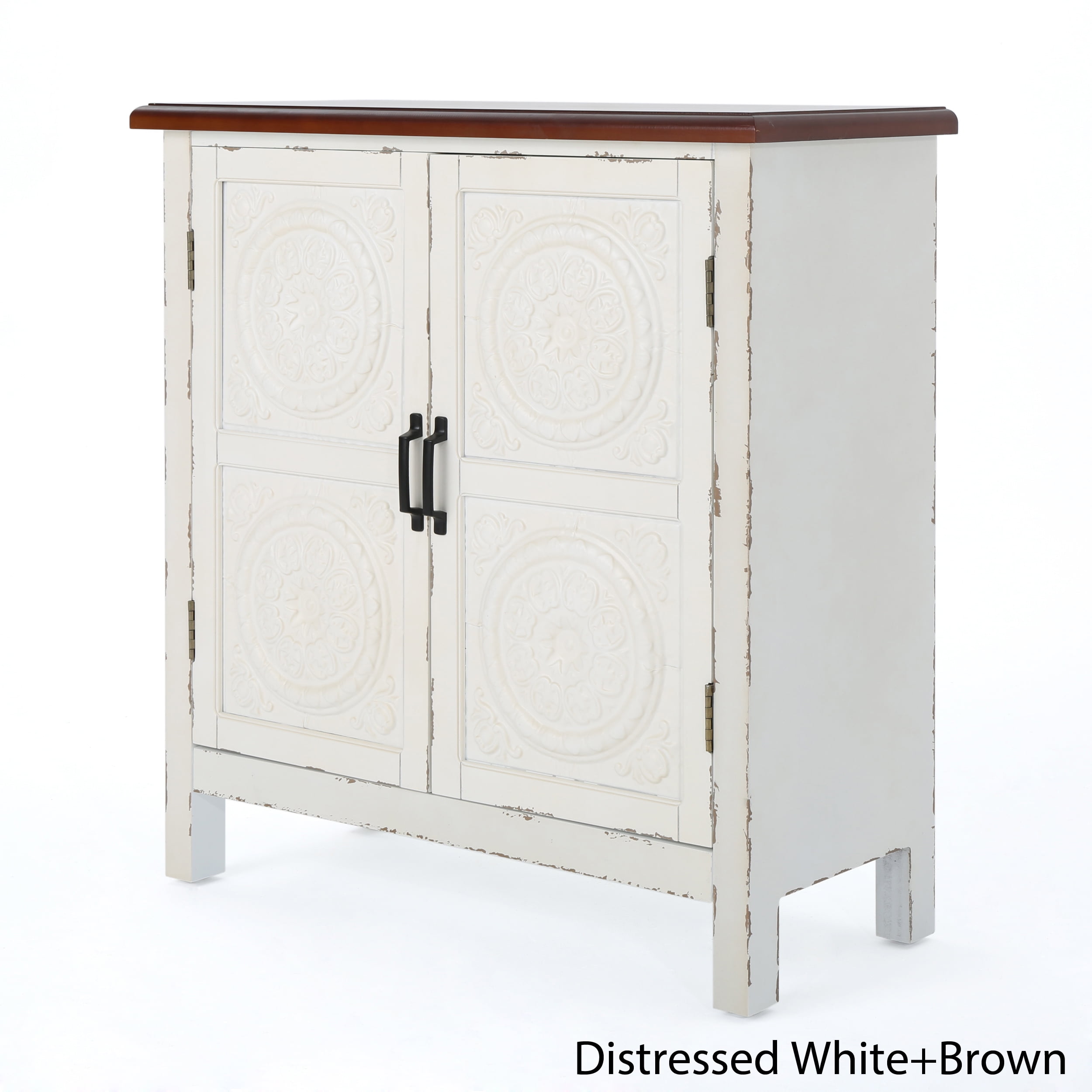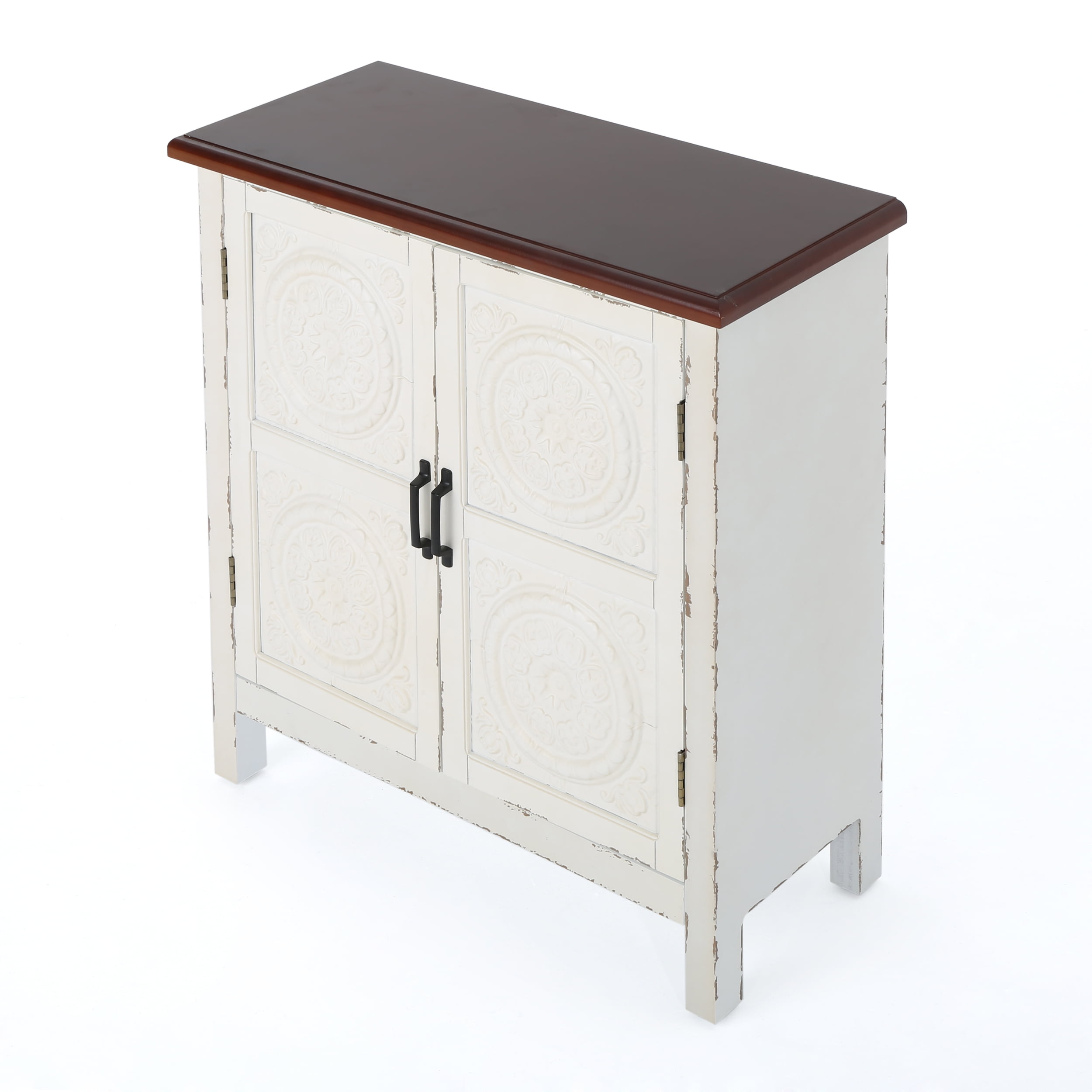Includes: One (1) Cabinet Material: Firwood with Faux Wood Overlay Body Finish: Distressed White Top Finish: Brown Hand-Crafted Details Assembly Required Dimensions: 14.00 inches deep x 31.50 inches wide x 32.25 inches high