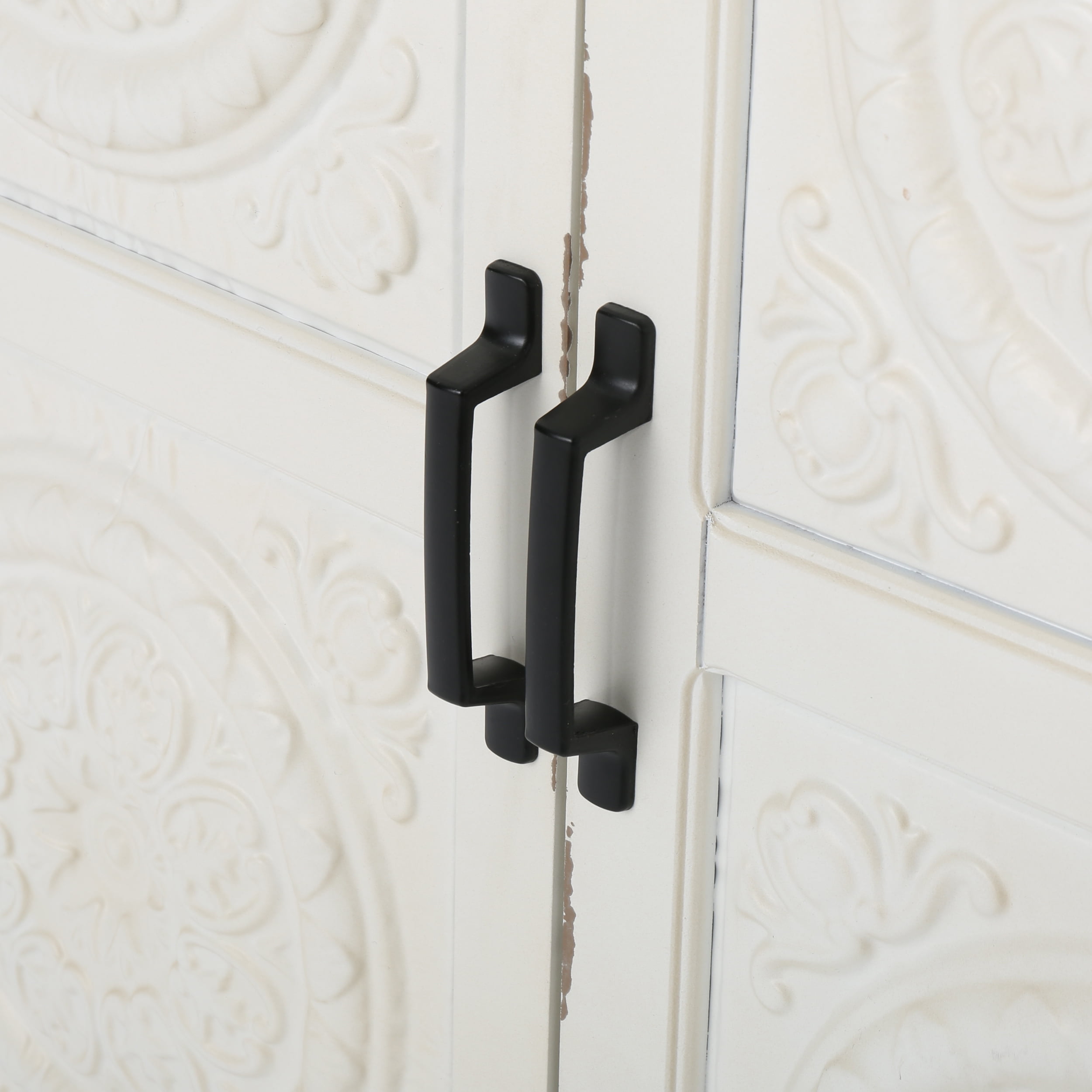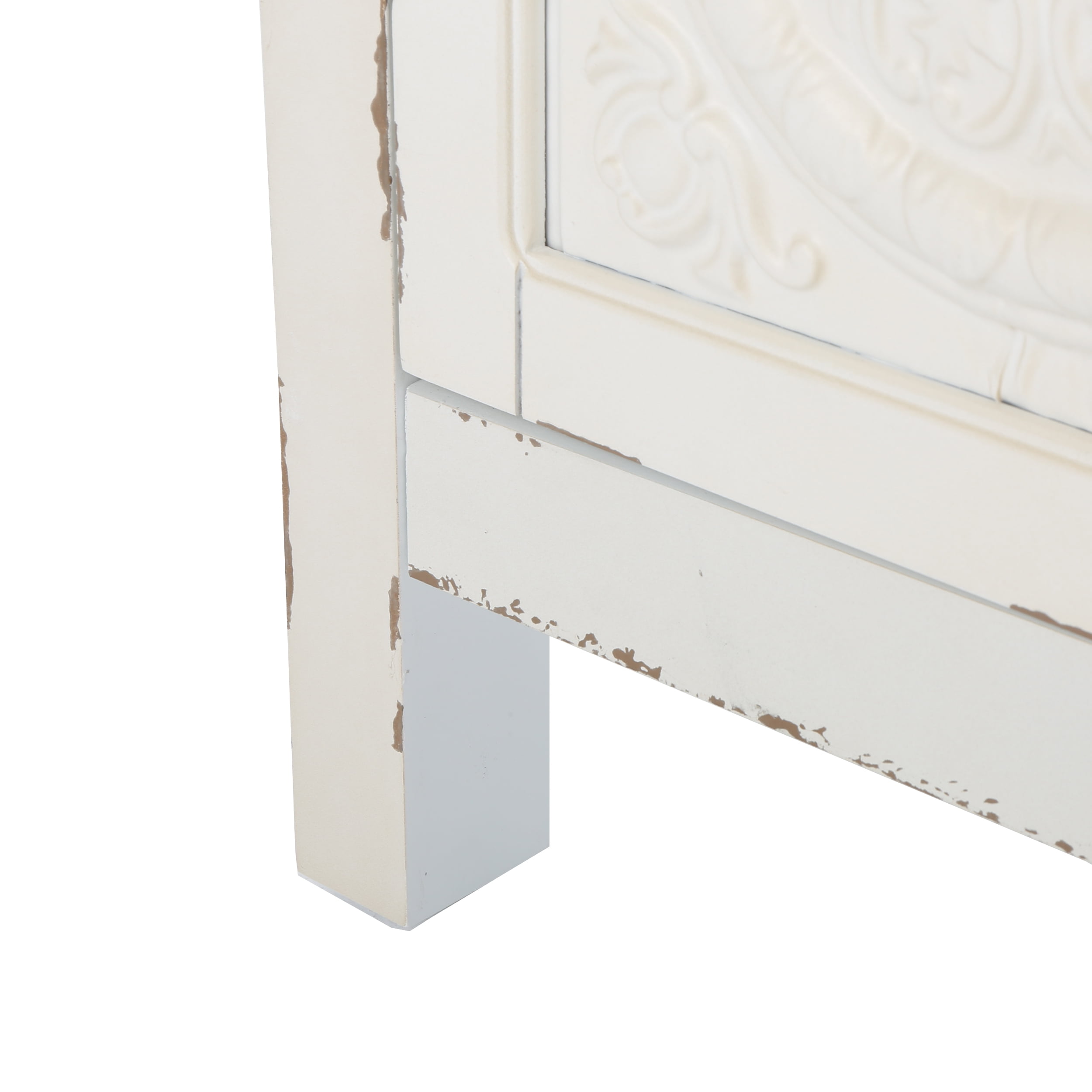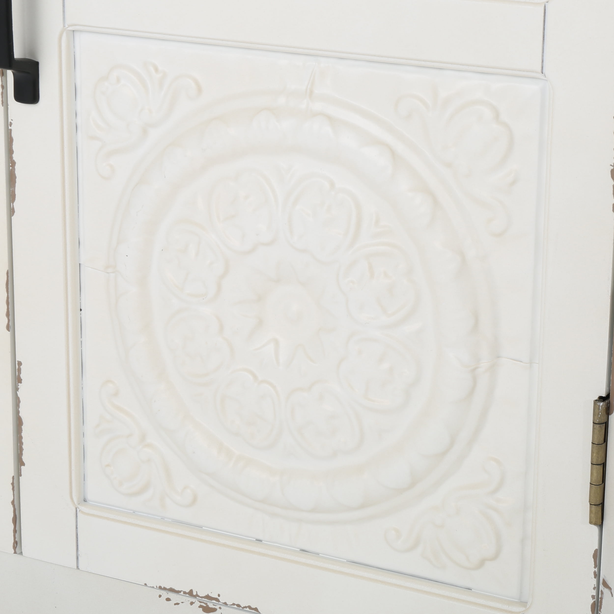 Enliven any room of your home in unparalleled style and homey charm with the perfect addition. Created for both functionality and impeccable style, our firwood cabinet brings a farmhouse atmosphere to any space with its wooden appearance and distressed finish. This cozy cabinet features a stamped-tin pattern that effortlessly adds a touch of traditional design for a hand-crafted touch. Completed with ample storage space, our impressive cabinet provides all sorts of options to remove clutter that will have all your guests in awe of your décor. FARMHOUSE WITH TRADITIONAL INSPIRATION: Combining a homey farmhouse design with hints of traditional engraved design, our cabinet uses its distressed wooden look and stamped-tin pattern to create a unique accessory for your home. FIRWOOD: Our cabinet is created with refined firwood for a resilient structure that features straight, tight grains. This durable wood less prone to warping or twisting due to its dense nature. DISTRESSED FINISH: Our cabinet is finished with a complementing wash that enhances the overall look of the piece. This distressed look emphasizes farmhouse style and gives this piece an extra boost of charisma. CARVED PANELS: This cabinet features beautiful stamped-tin paneling that brings a traditional look to any room. This design brings a touch of texture to any space and enhances the style of your existing décor. STORAGE SPACE: This accessory comes with a two-door cabinet and an inside shelf, helping you organize your items. This is finished with sleek black handles that accentuate the modern design of this piece.