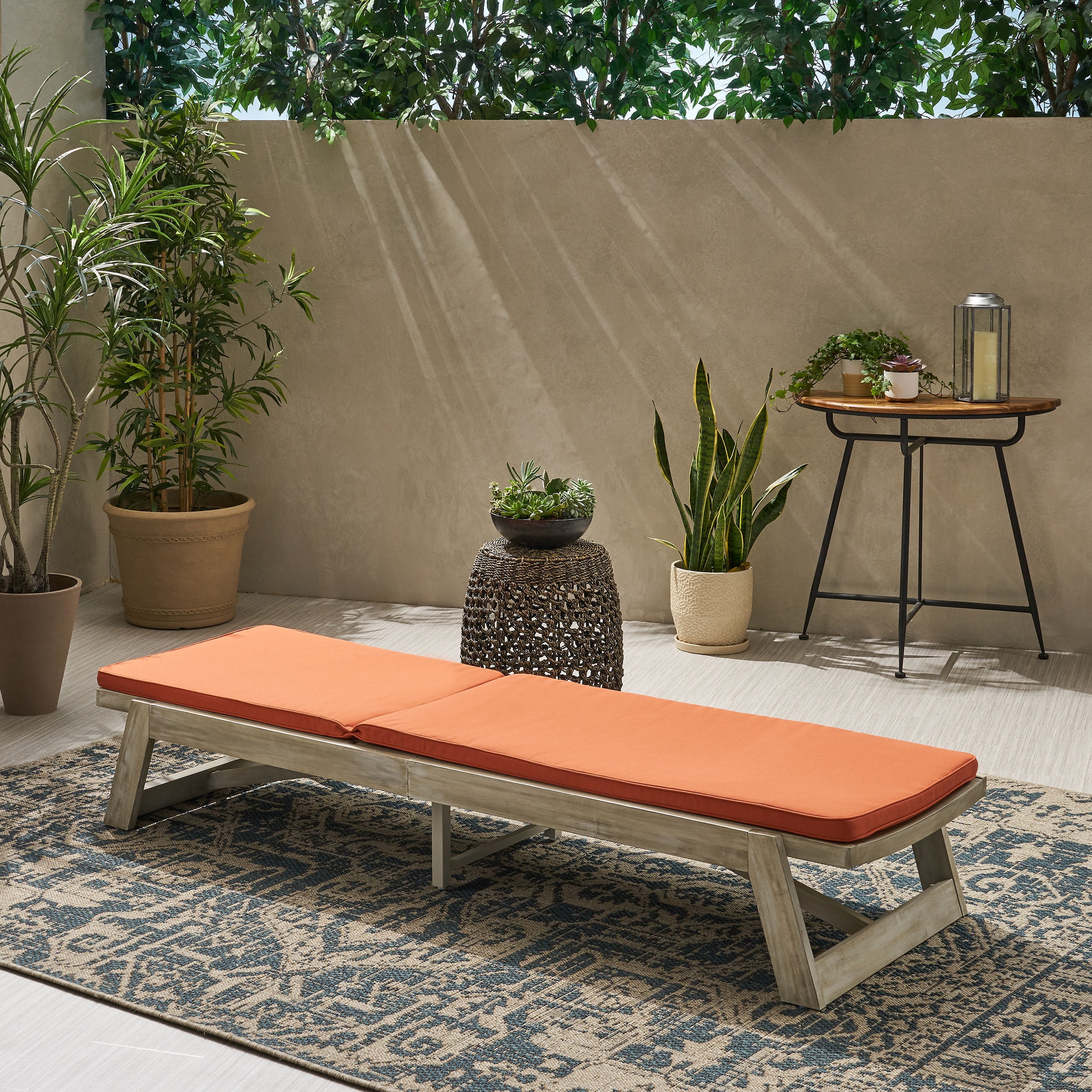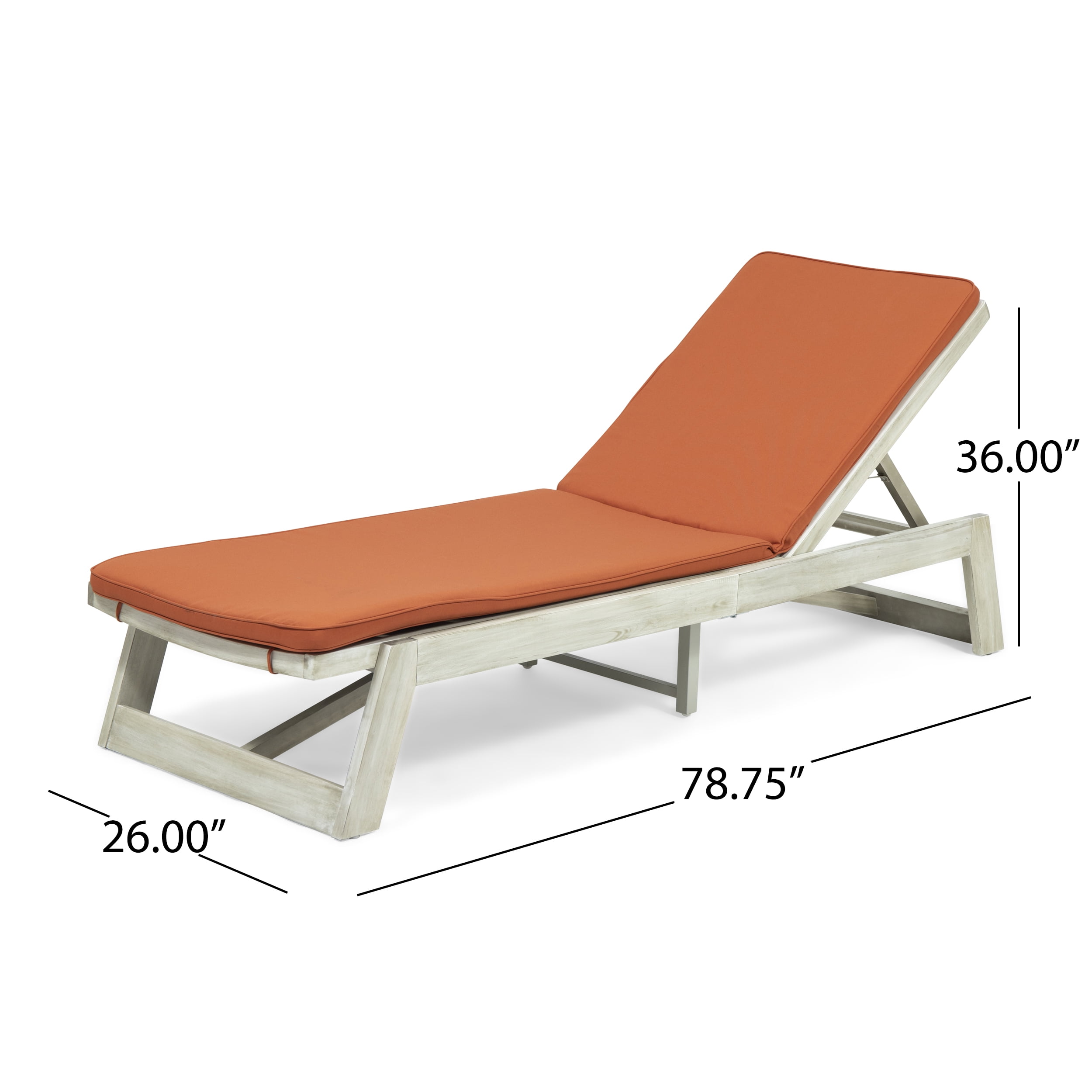 Create irresistible poolside relaxation with a chaise lounge that offers impeccable design and alluring comfort. Ideal for family and friends alike, this chair will have everyone unwinding under the warm sun for hours. With a water-resistant cushion and acacia wood frame, this lounge chair offers you outstanding comfort with its adjustable seating and graceful slat panels. Whether you are looking to settle back with a good book or just looking to breathe in the summer air, our chaise lounge is the perfect addition for your décor. ACACIA WOOD: Made with acacia wood that brings a sleek and exotic look to your space, this durable hardwood naturally withstands outdoor elements and will not darken over time. Acacia wood is perfect as a solid, heavy frame that resists wear and tear. COMPLEMENTING FINISH: Finished with a complementing wash and matching metal accents, the coating provides a hand-crafted touch to this chaise lounge, blending seamlessly with any décor. ADJUSTABLE: Our chaise lounge offers adjustable seating to ensure maximum comfort. This accommodates four different positions, including a fully reclined option. WATER-RESISTANT FABRIC: Our cushions are covered with a non-porous material that makes cleaning any spills a breeze so you can spend all summer lounging outdoors in comfort. Please note that these cushions are water-resistant and not waterproof. Please do not submerge in water. SLAT PANELING: Our chaise lounge features bold slats with a gentle curve that molds perfectly to your body. Not only does this enhance your comfort but also the style of your outdoor space. Features: Includes: One (1) Chaise Lounge and One (1) Lounge Cushion Lounge Material: Acacia Wood Frame Material: Iron Cushion Material: Water Resistant Fabric Composition: 100% Polyester Lounge Finish: Light Gray Wash Cushion Color: Rust Orange Hand-Crafted Details Assembly Required Specifications: Product Dimensions: 12.50″ H x 26.00″ W x 78.75″ D Product Weight: 55.12 lbs Chaise Lounge Dimensions: 36.00″ H x 26.00″ W x 78.75″ D Chaise Lounge Dimensions: (Reclined) 12.50″ H x 26.00″ W x 78.75″ D Seat Dimensions: 47.25″ D x 23.75″ W Pillow / Cushion Dimensions: 1.50″ H x 23.75″ W x 78.75″ D Seat Dimensions: 47.25″ D x 23.75″ W