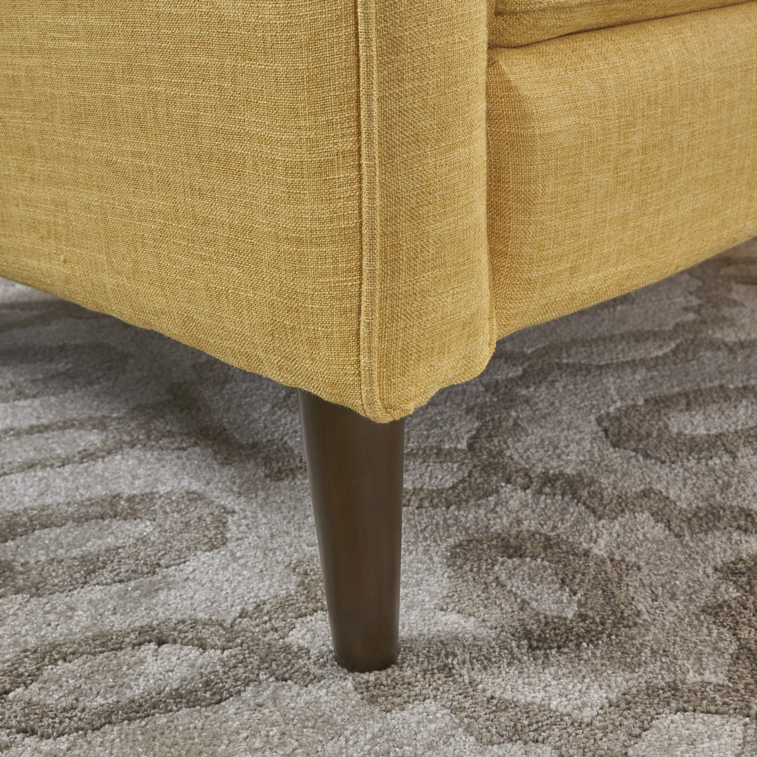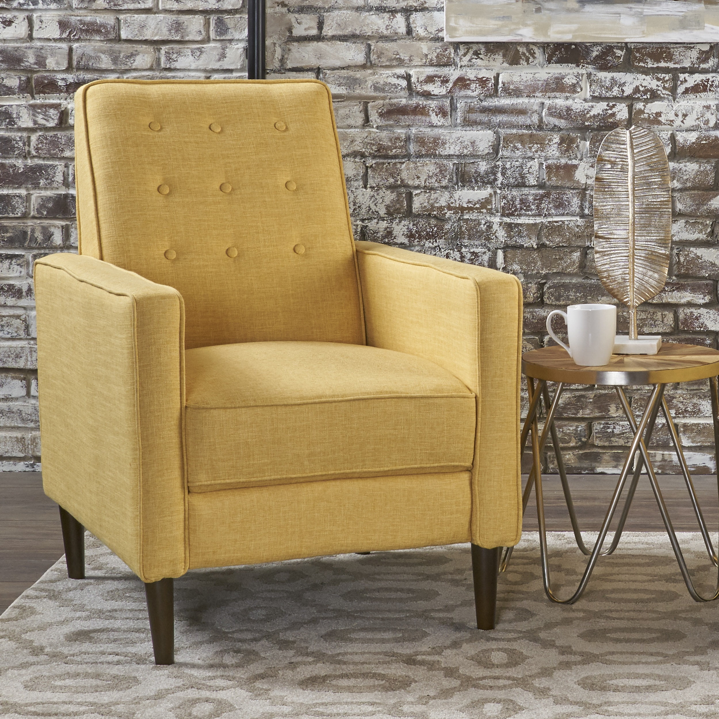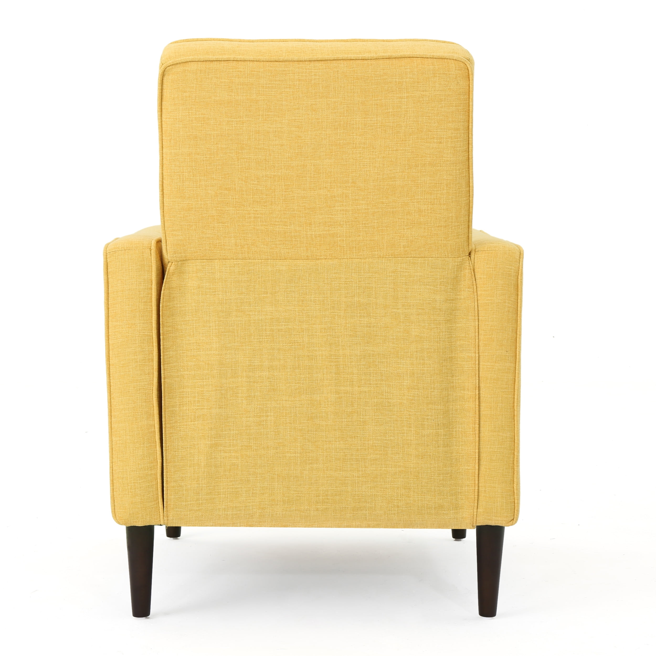 Noble House Mercury Standard Fabric Tufted Recliner, Yellow Includes: One (1) Recliner Material: Fabric Composition: 100% Polyester Leg Material: Birch Color: Muted Yellow Leg Finish: Dark Espresso Some Assembly Required Hand Crafted Details Dimensions: 34.25 inches deep x 27.25 inches wide x 38.00 inches high Seat Width: 20.00 inches Seat Depth: 21.50 inches Seat Height: 18.50 inches Arm Height: 25.00 inches