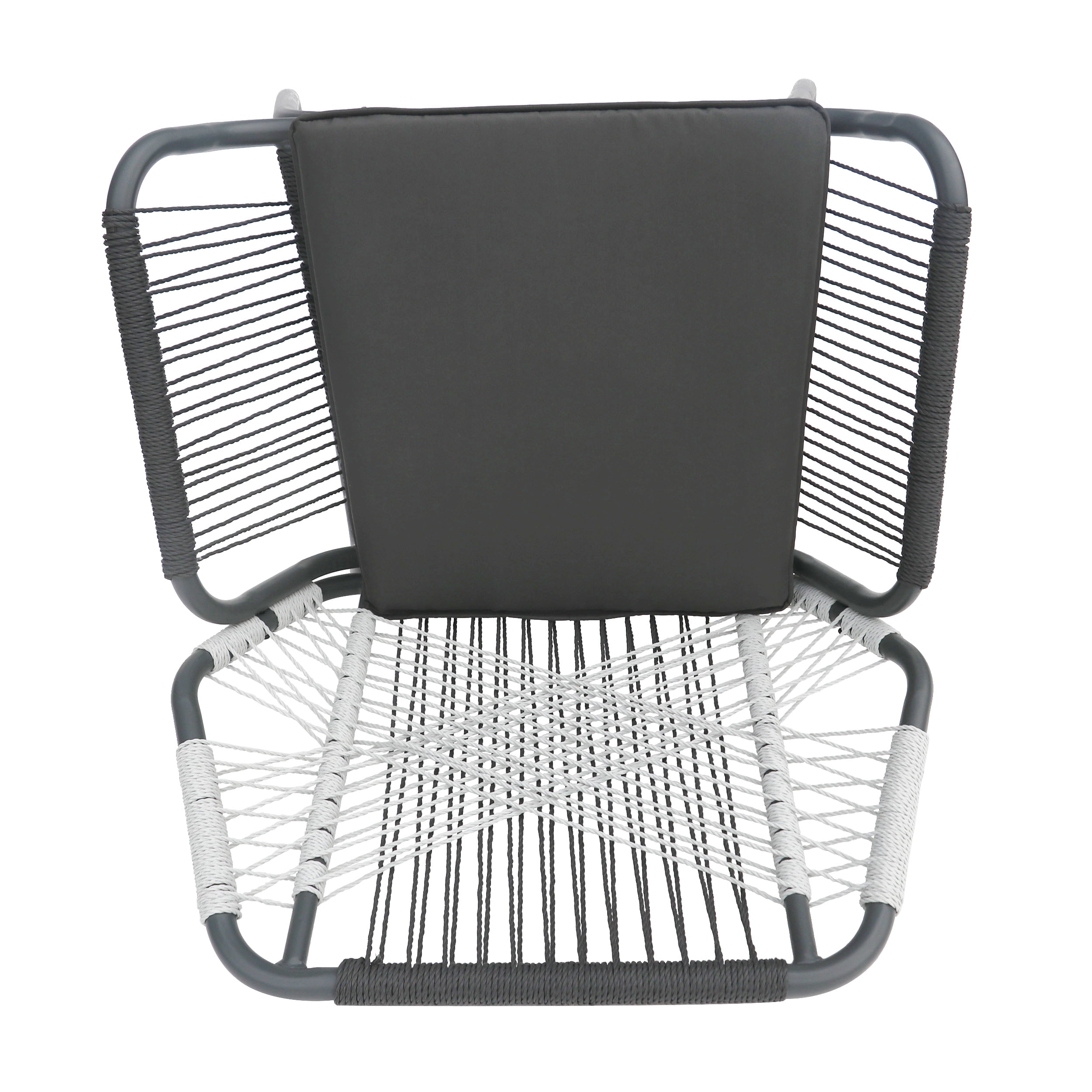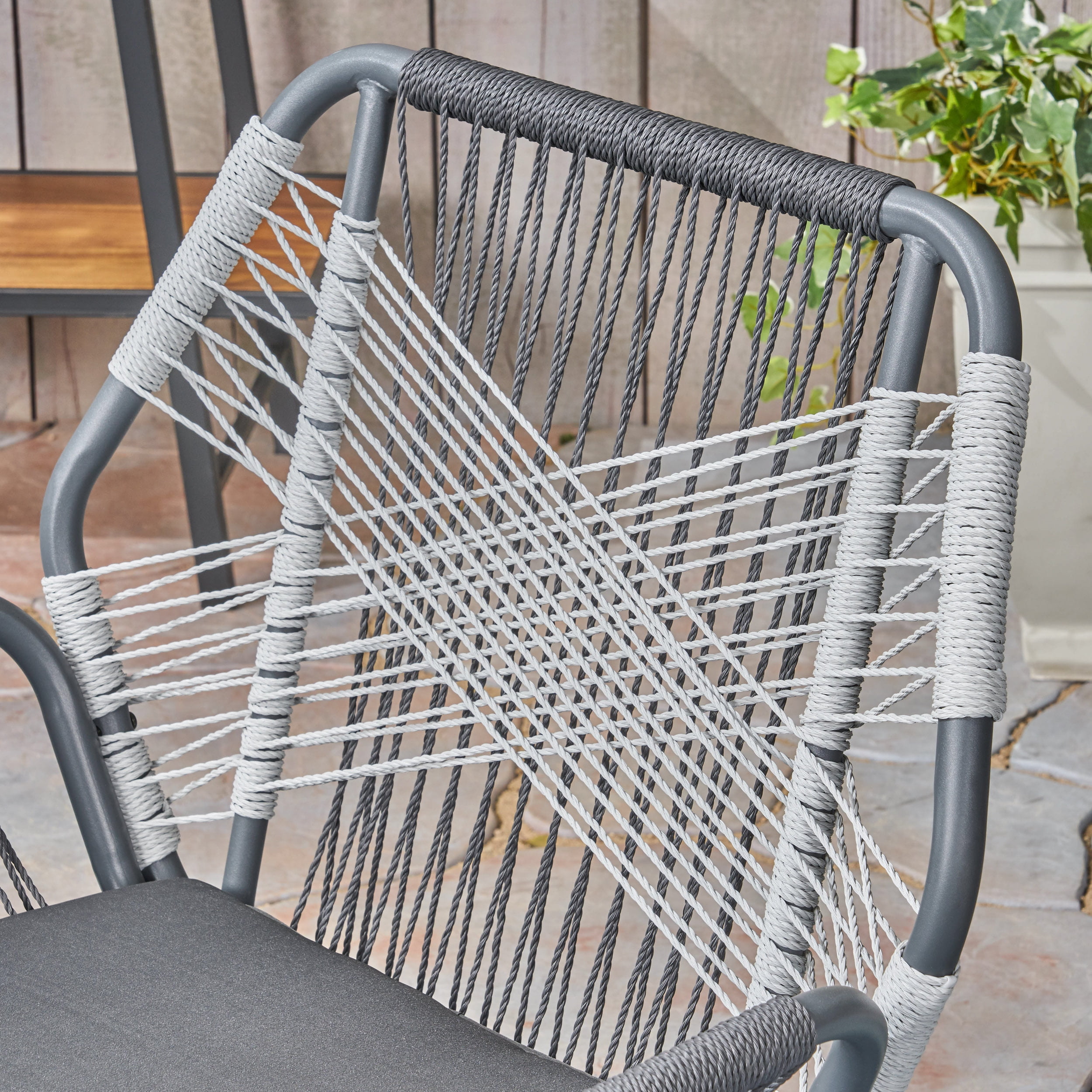 Noble House Morgan Modern Solid Print Outdoor Rope and Steel Club Chairs, Gray / White Set of 2 Includes: Two (2) Club Chairs Frame Material: Durable Rope and Steel Cushion Material: Water Resistant Fabric for enhanced durability Composition: 100% Polyester for easy maintenance Frame Color: Elegant Gray Cushion Color: Stylish Gray and White Some Assembly Required for convenience Hand Crafted Details for a unique touch Dimensions: 28.50 inches deep x 27.25 inches wide x 33.25 inches high Seat Width: 19.00 inches for comfortable seating Seat Depth: 18.75 inches for added comfort Seat Height: 15.75 inches for optimal seating position Arm Height: 22.00 inches for relaxed arm support
