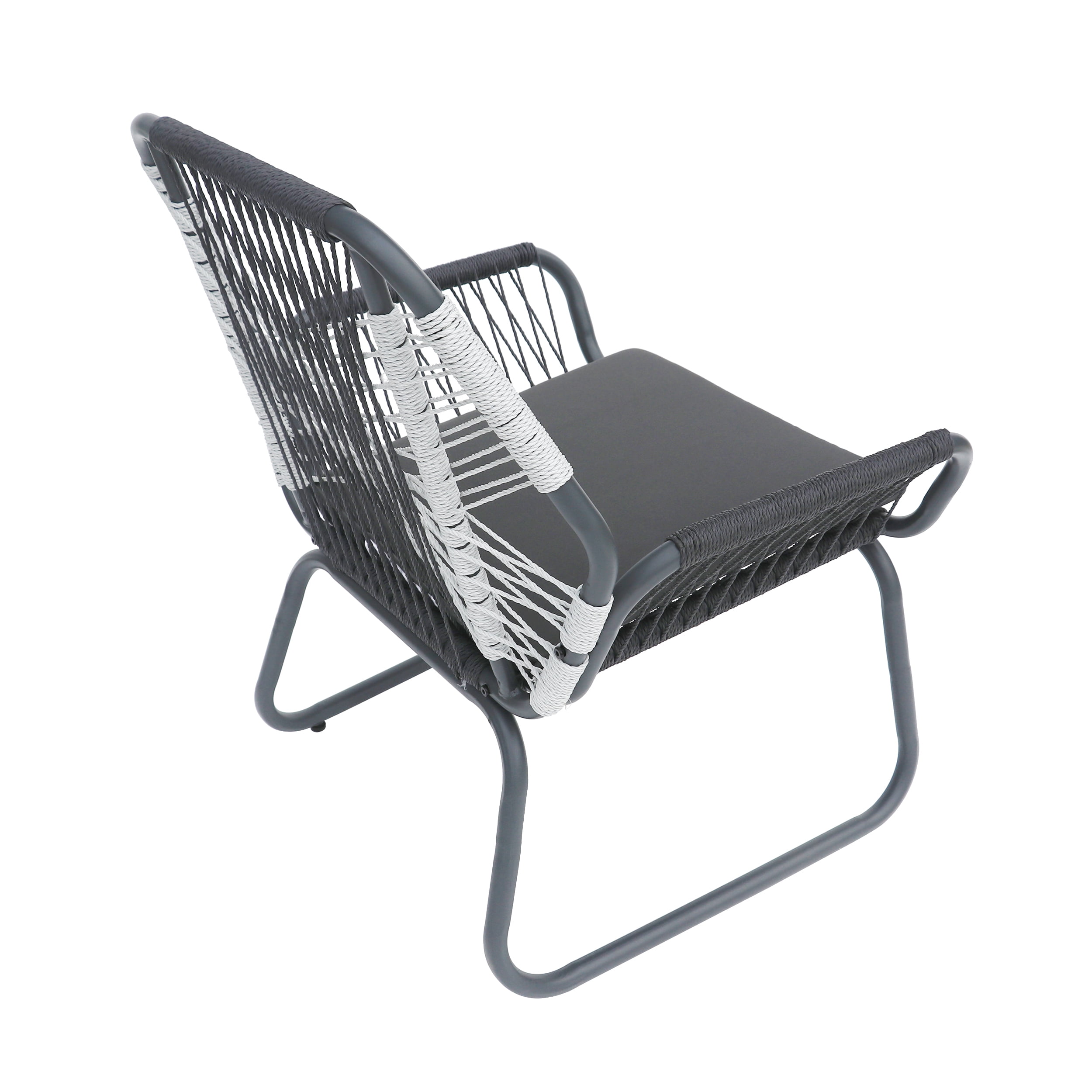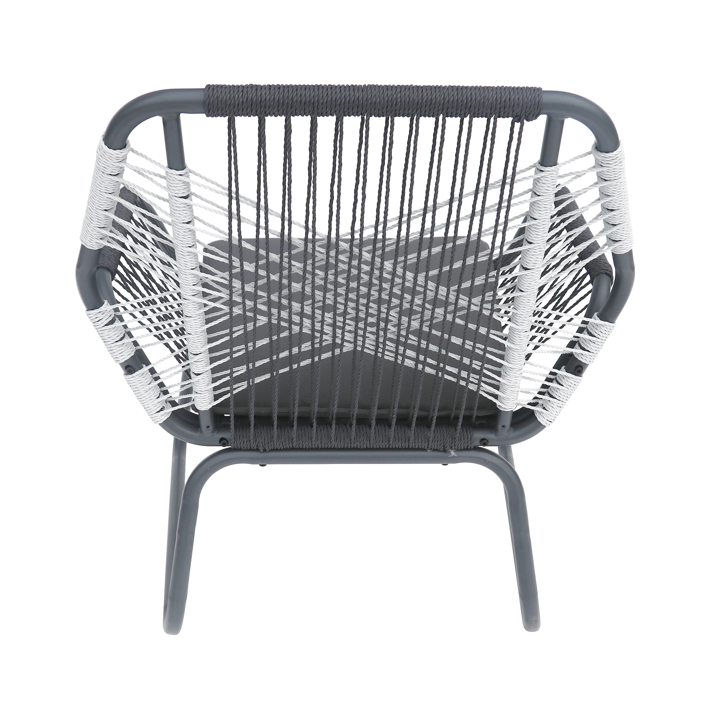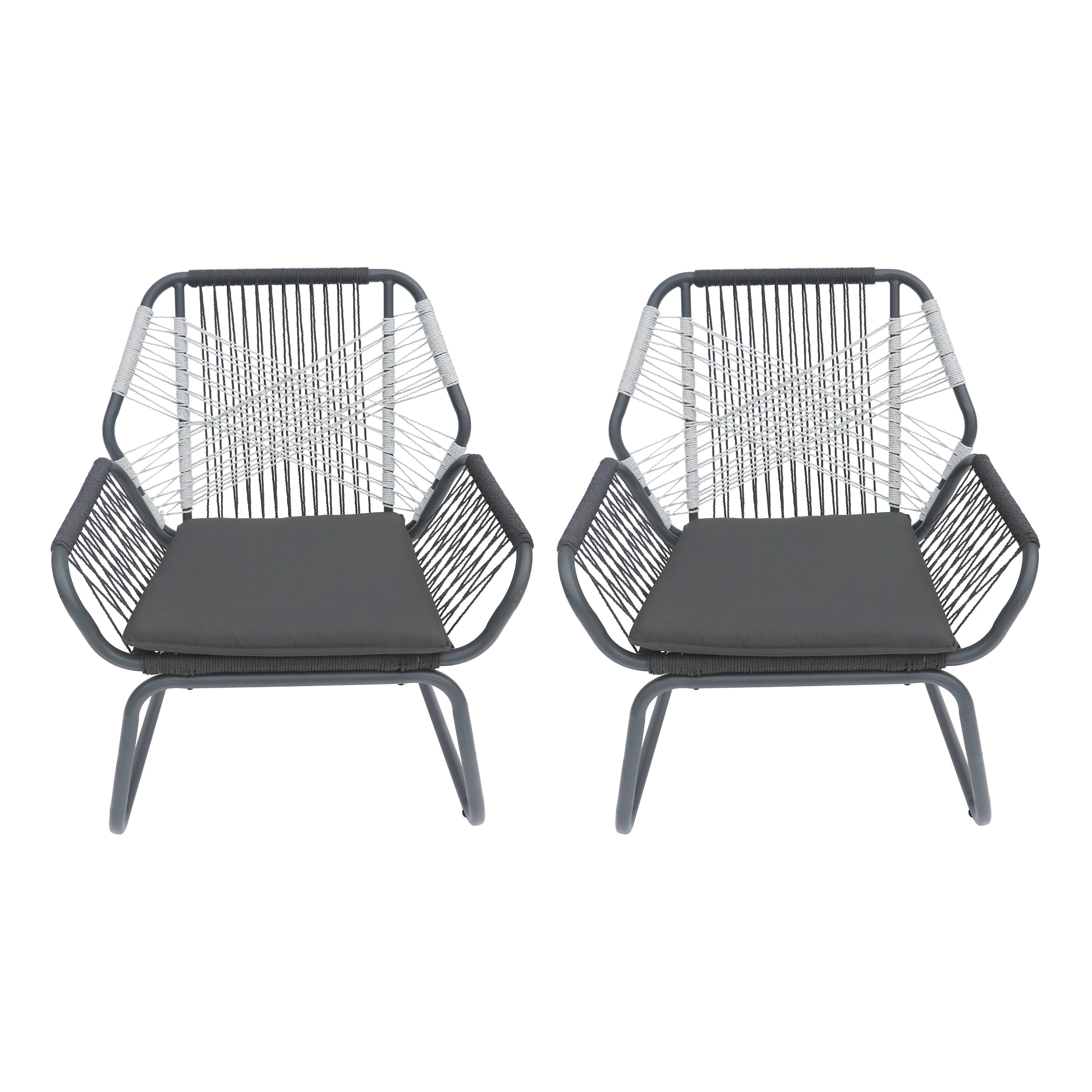 These rope and steel club chairs are a wonderful addition to any patio or back yard area. Featuring a stylish cross stich design on the chair back along with a cushion for maximum comfort, you can’t go wrong with these club chairs. Perfect for the summer and designed with longevity in mind, simply bring the cushions instead during the off seasons and these club chairs will last you for years to come. Features: Includes: Two (2) Club Chairs Frame Material: Steel and Rope Cushion Material: Water Resistant Fabric Composition: 100% Polyester Frame Color: Gray Cushion Color: Gray and White Hand Crafted Details Specifications: Product Dimensions: 33.25″H x 28.5″W x 27.25″D Product Weight: 16.76 lbs Seat Dimensions: 15.75″H x 19″W x 18.75″D Arm Height: 22″H