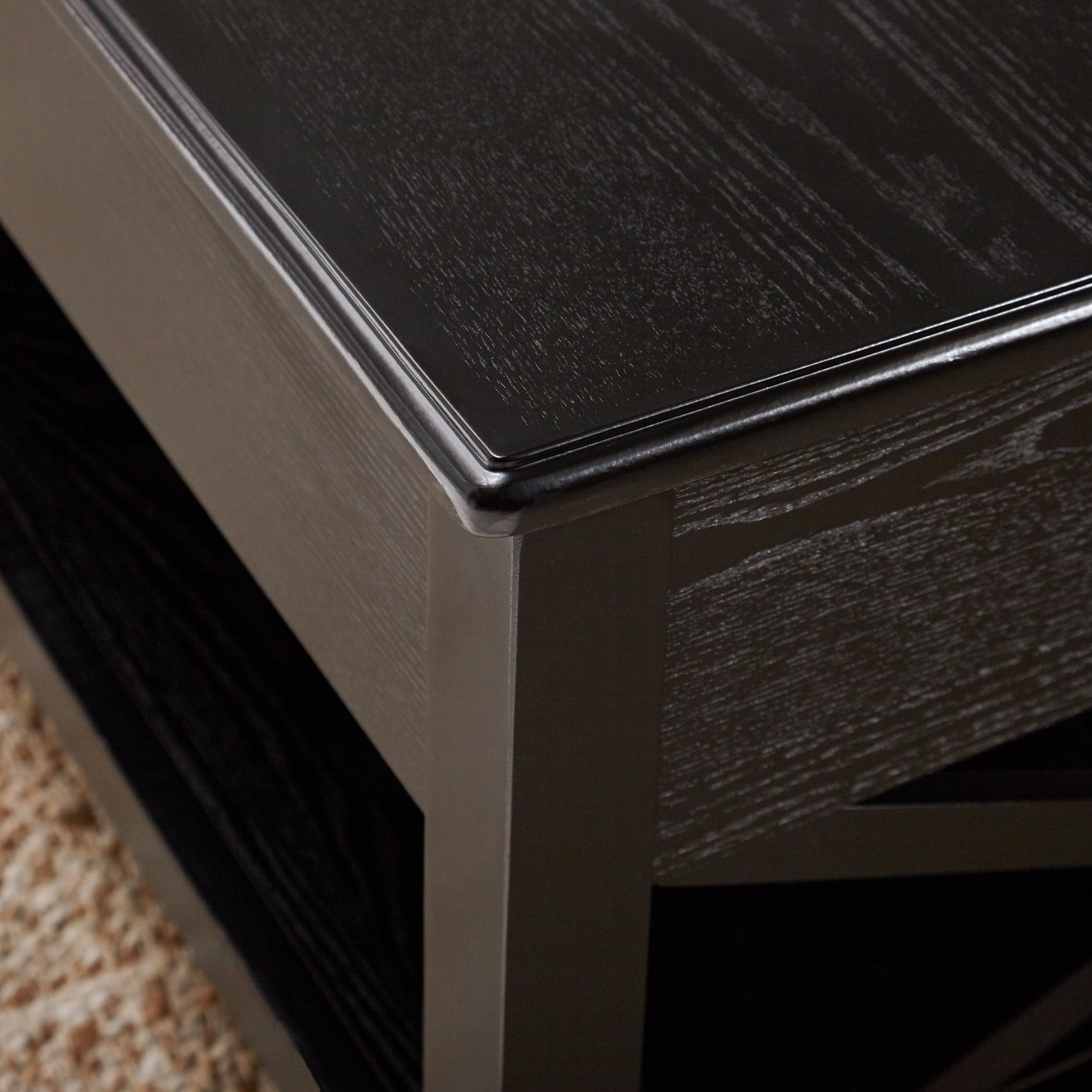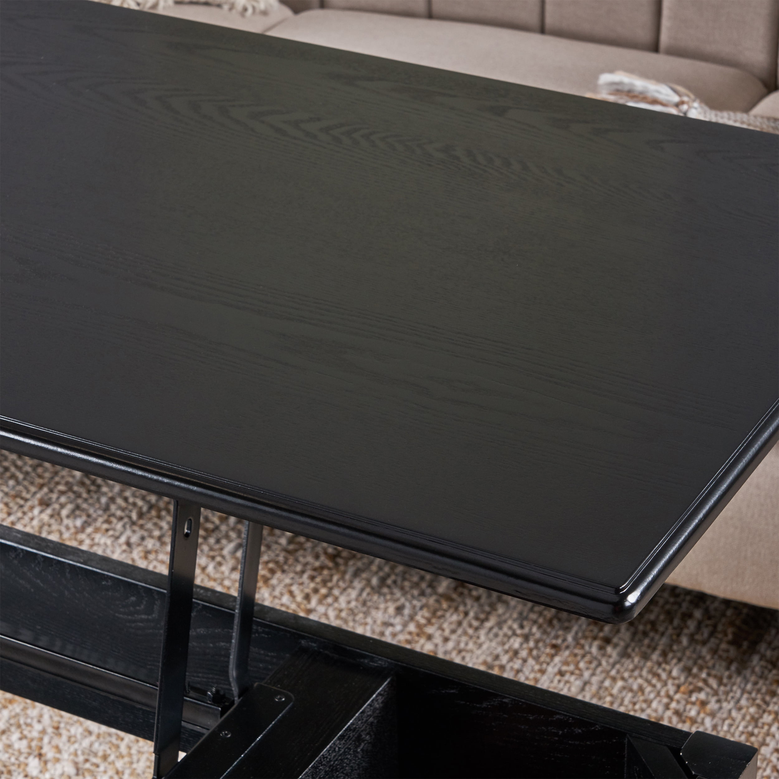 Includes: One (1) Coffee Table Material: Faux Wood with an Ash Wood Veneer Leg Material: Pinewood Finish: Black Hand-Crafted Details Assembly Required Lowered Dimensions: 23.75 inches deep x 48.00 inches wide x 19.50 inches high Raised Dimensions: 23.75 inches deep x 48.00 inches wide x 29.50 inches high Storage Dimensions: 20.00 inches deep x 9.00 inches wide x 4.80 inches high Height Between Shelf and Storage Area: 7.25 inches
