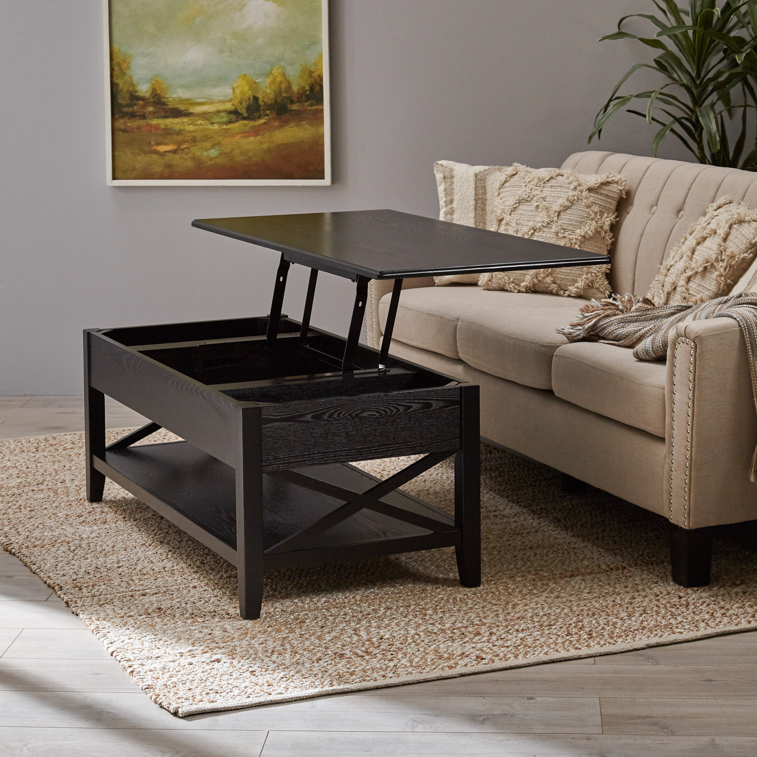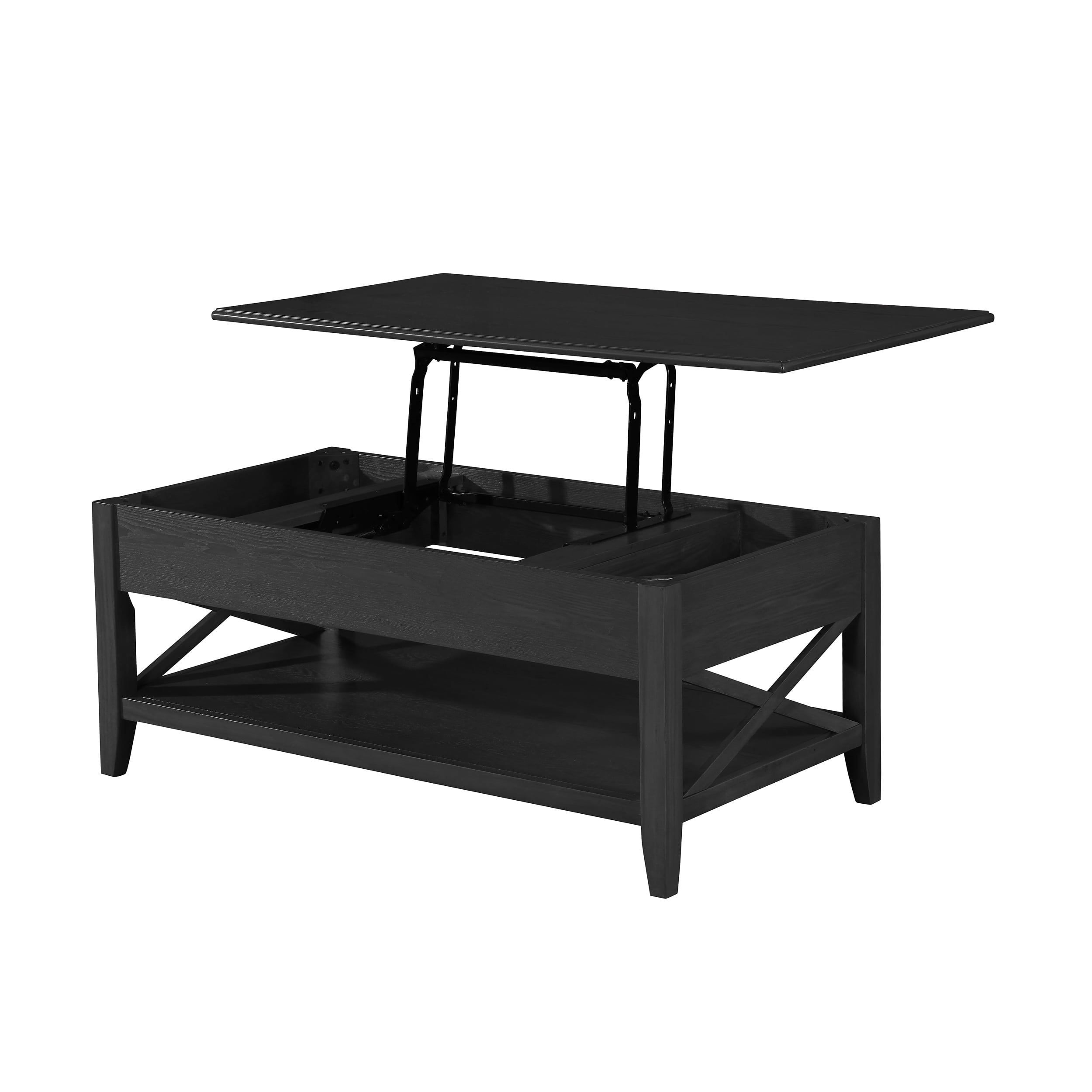 Store your items away from the eyes of your guests while giving your living room a rustic centerpiece that will keep your space uncluttered. With our striking lift-top adjustable coffee table, your living room décor will never be the same. From hidden storage compartments to an open display shelf, this table has it all. Featuring a handsome farmhouse look, this table not only gives your living room a visual boost but also packs a multitude of functions within its simple design. FARMHOUSE STYLE: Our coffee table offers a farmhouse style that is known for its charm and simplicity. With a combination of clean, crisp lines and a fresh wood look, the side panels for this piece tops off this countryside design with traditional X-frames. Featuring neutral colors and open shelving, this table brings a homey feel to any living space. ADJUSTABLE LIFT TOP: With a closed height of 19.5 inches and an open height of 29.5 inches, our table lifts up and forward for a versatile work space. This adjustable lift-top mechanism provides the perfect height for writing, reading or just settling back with a refreshing drink. Please note that this top only lifts to the maximum height. It does not stop in between the open and closed positions. CONTROLLED CLOSING HINGES: This table lift-top uses hinges that offers controlled closing to ensure your fingers will not accidentally get caught when shutting. STORAGE COMPARTMENTS: This coffee table contains two hidden storage compartments under the table top that are each 9?W x 20?L x4.8?H. This also offers an open bottom shelf for easy access to your magazines and other items. ASSEMBLY REQUIRED: Some assembly is required for this coffee table. All of the instructions and tools needed for assembly are included.