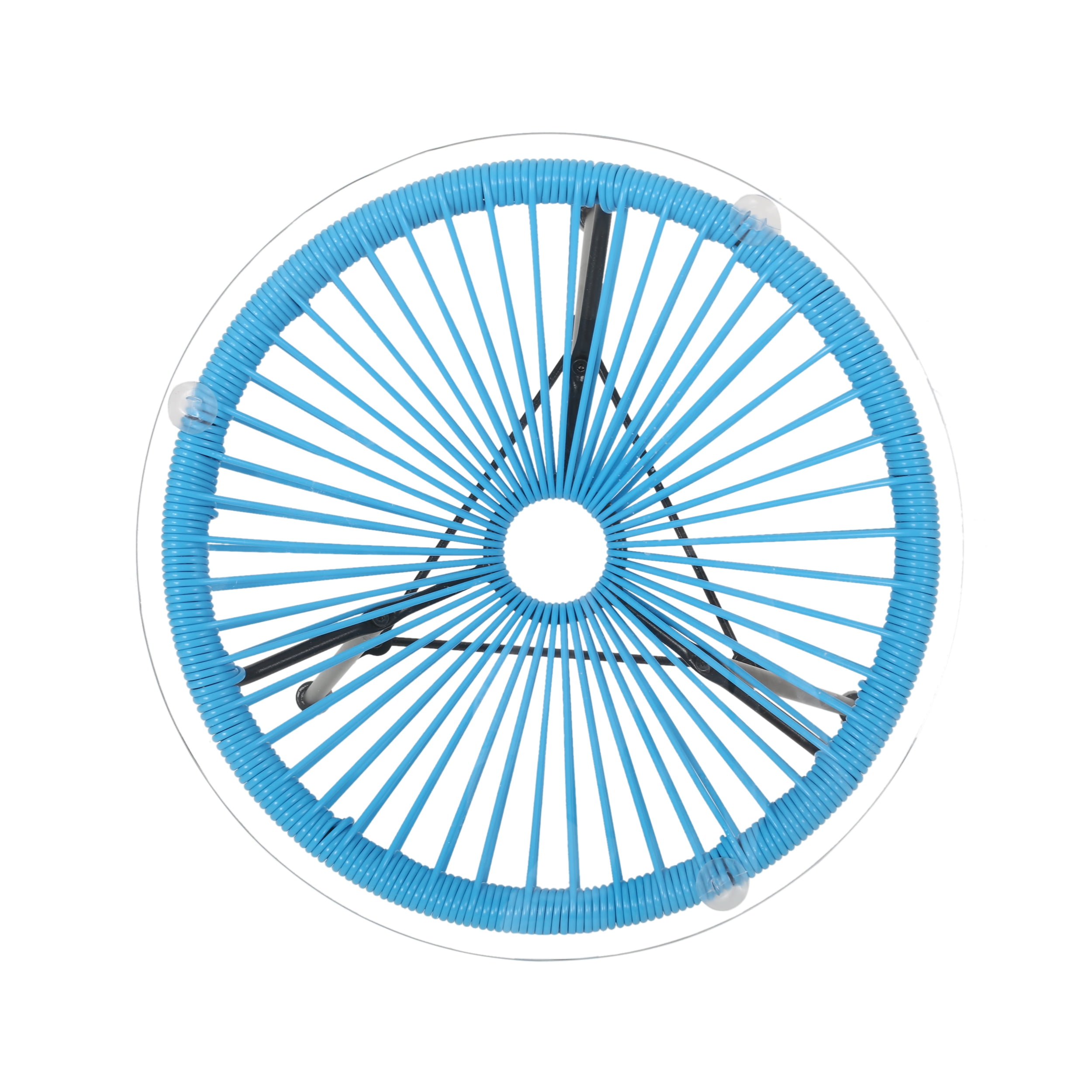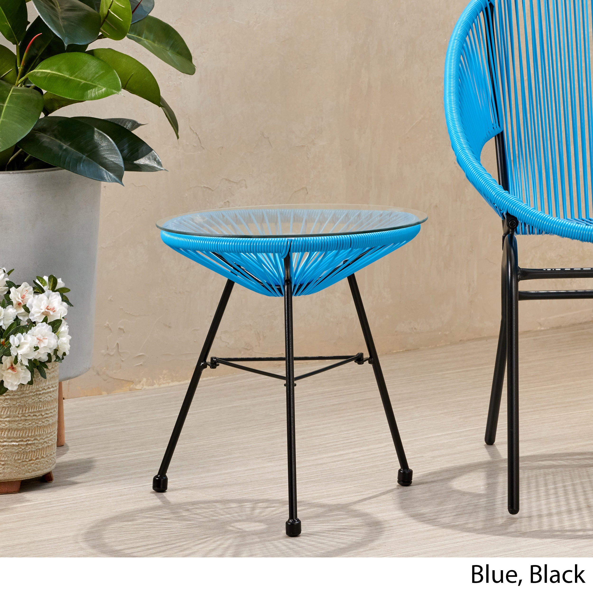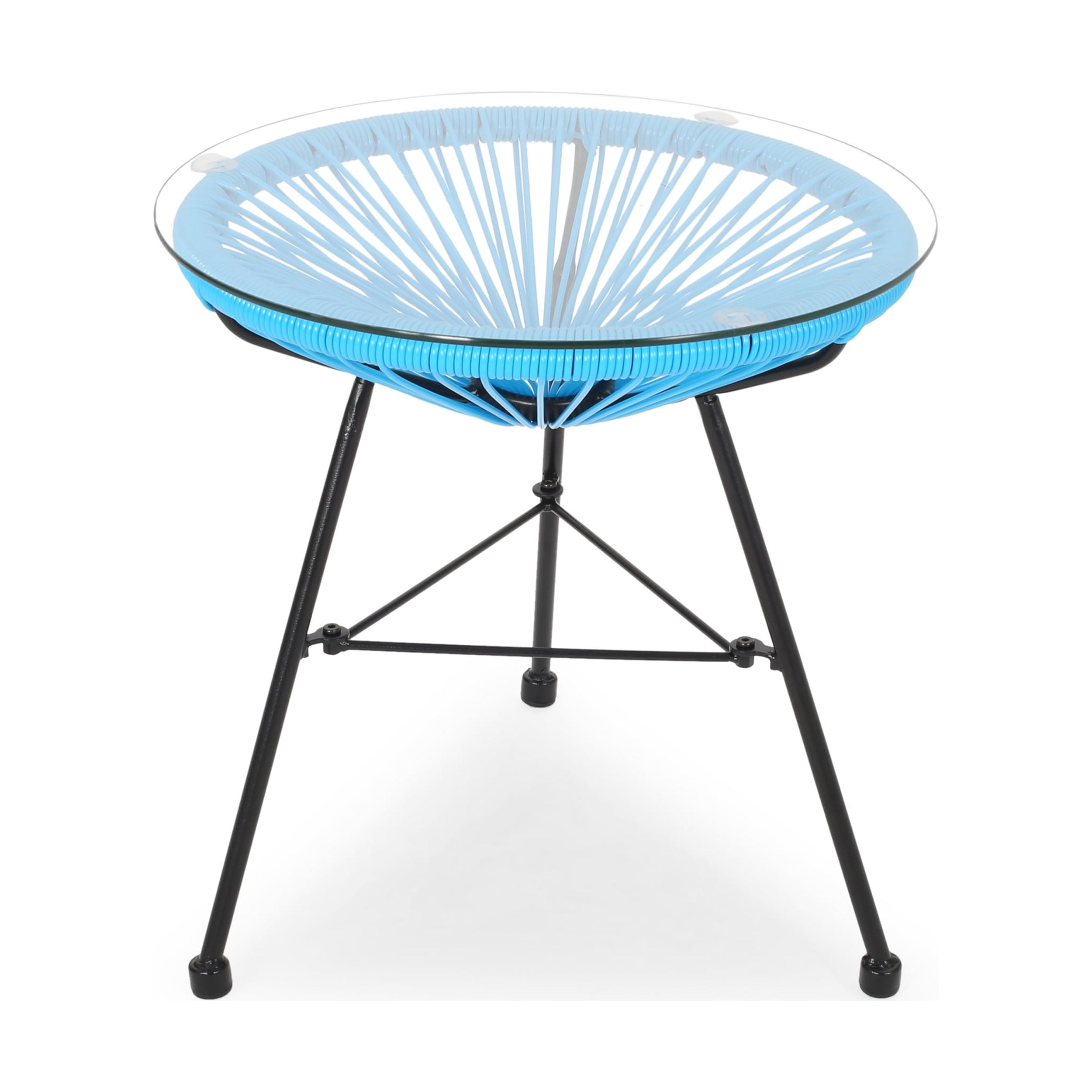 Includes: One (1) Side Table Table Top Material: Tempered Glass Table Top Base Material: Faux Rattan Leg Material: Iron Table Top Support Color: Blue Leg Finish: Black Hand-Crafted Details Assembly Required