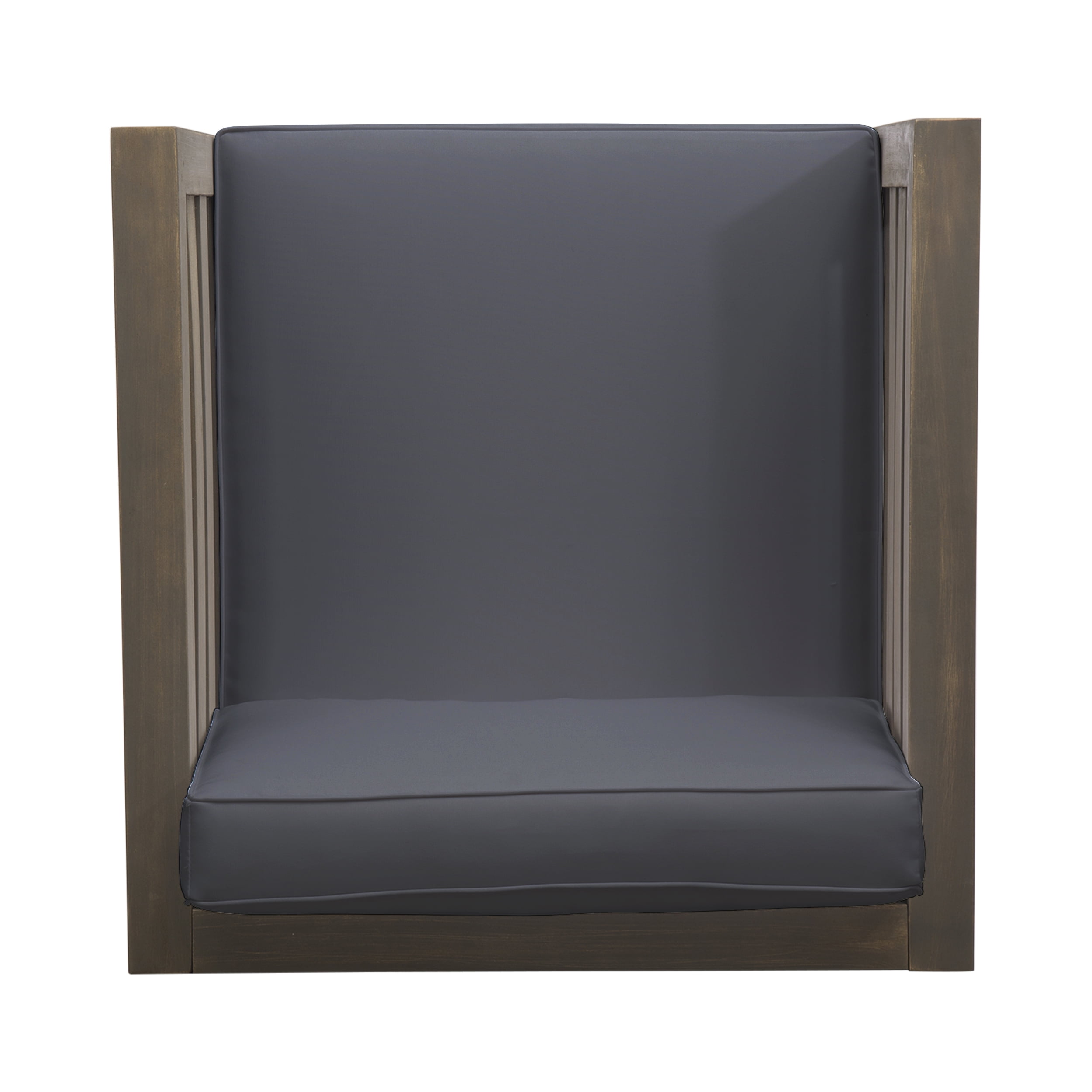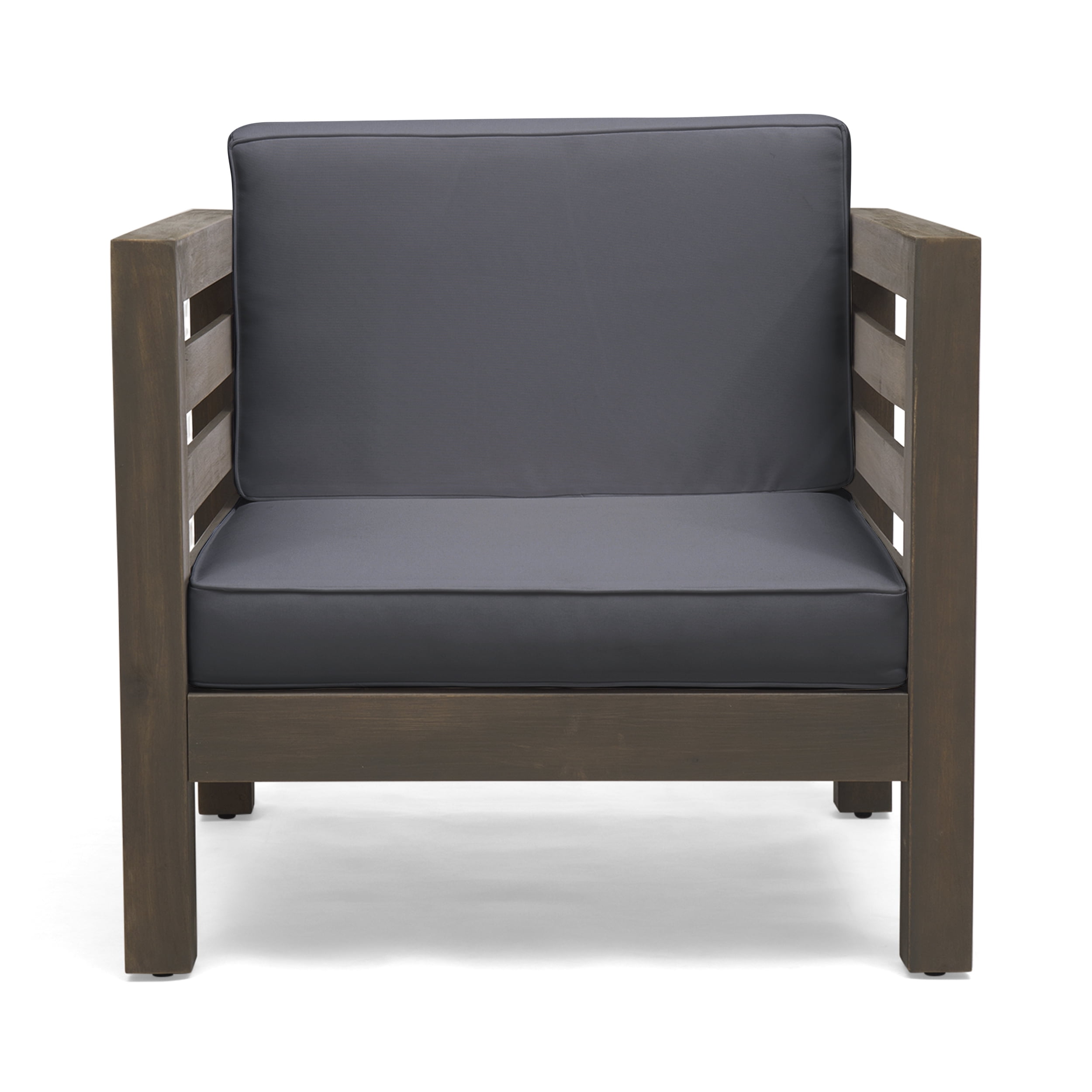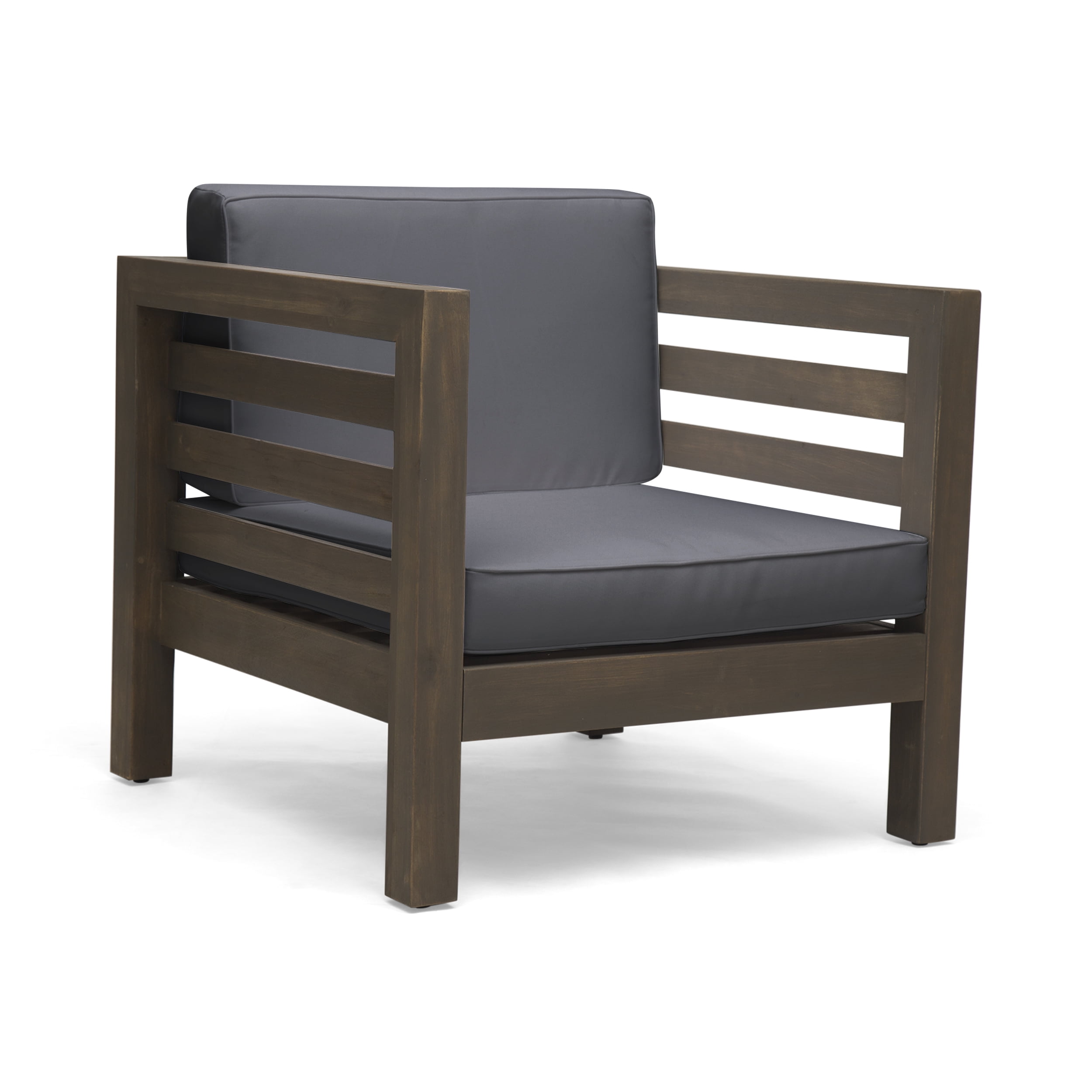 Includes: One (1) Club Chair Material: Acacia Wood Cushion Material: Water Resistant Fabric Fabric Composition: 100% Polyester Finish: Gray Cushion Color: Dark Gray Hand-Crafted Details Assembly Required