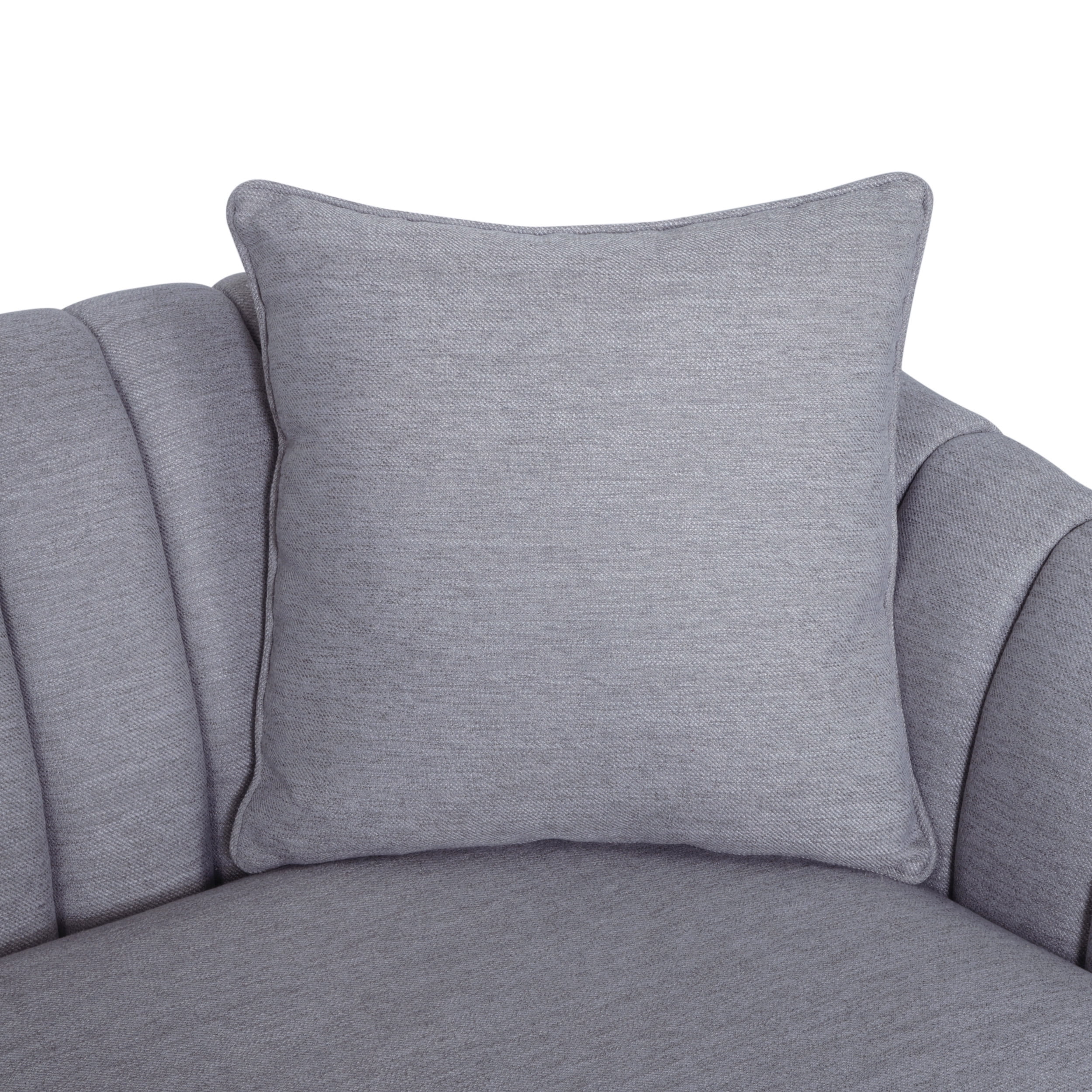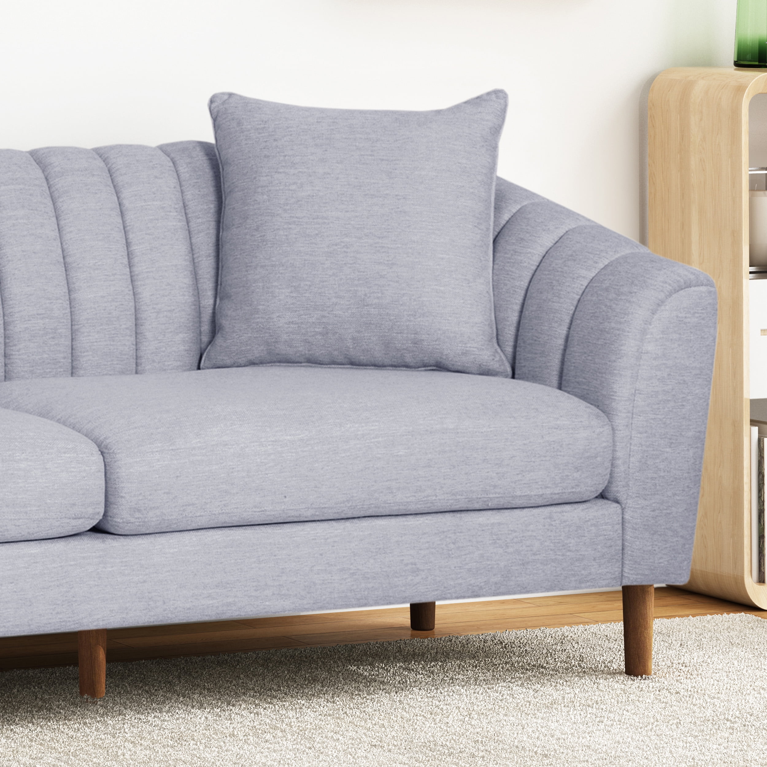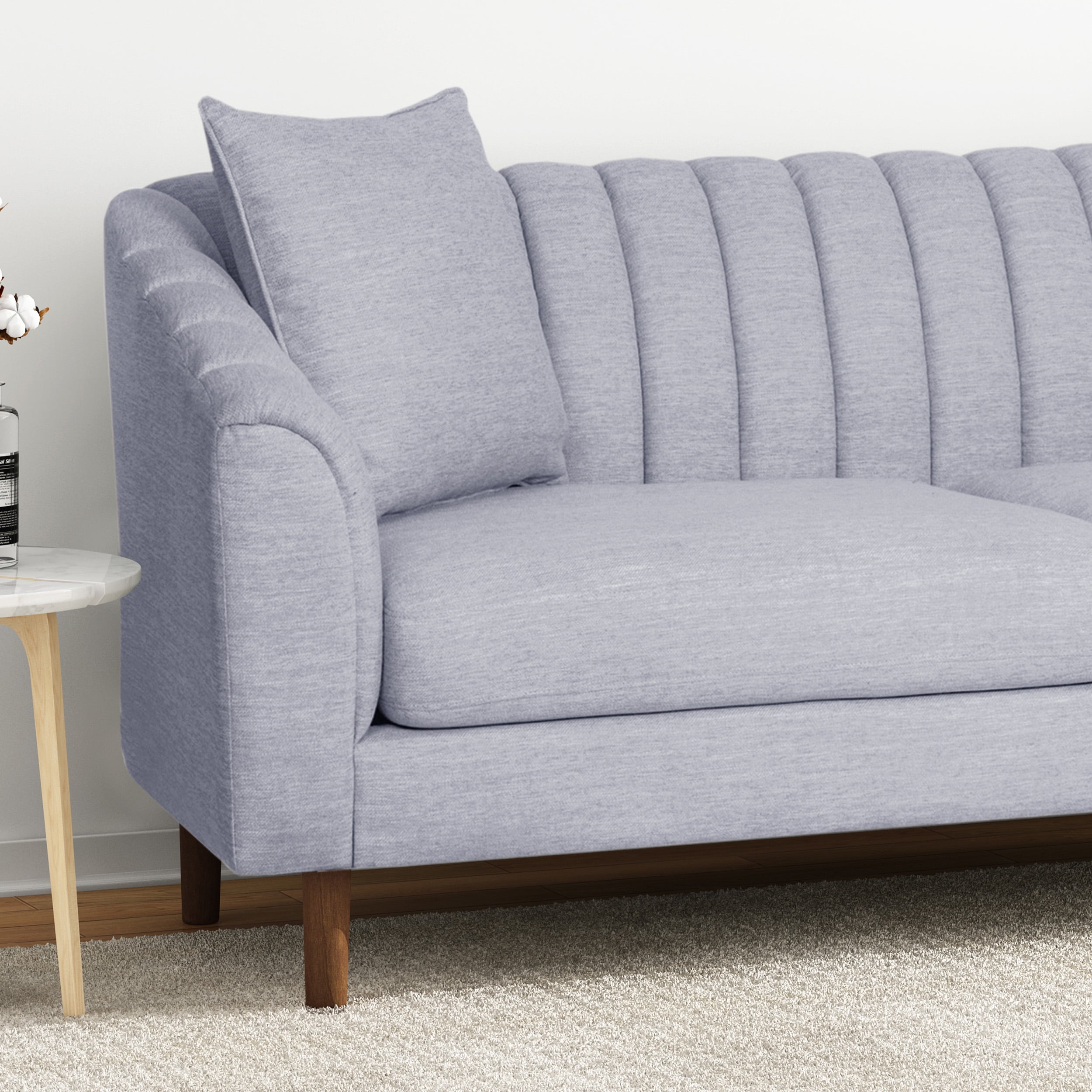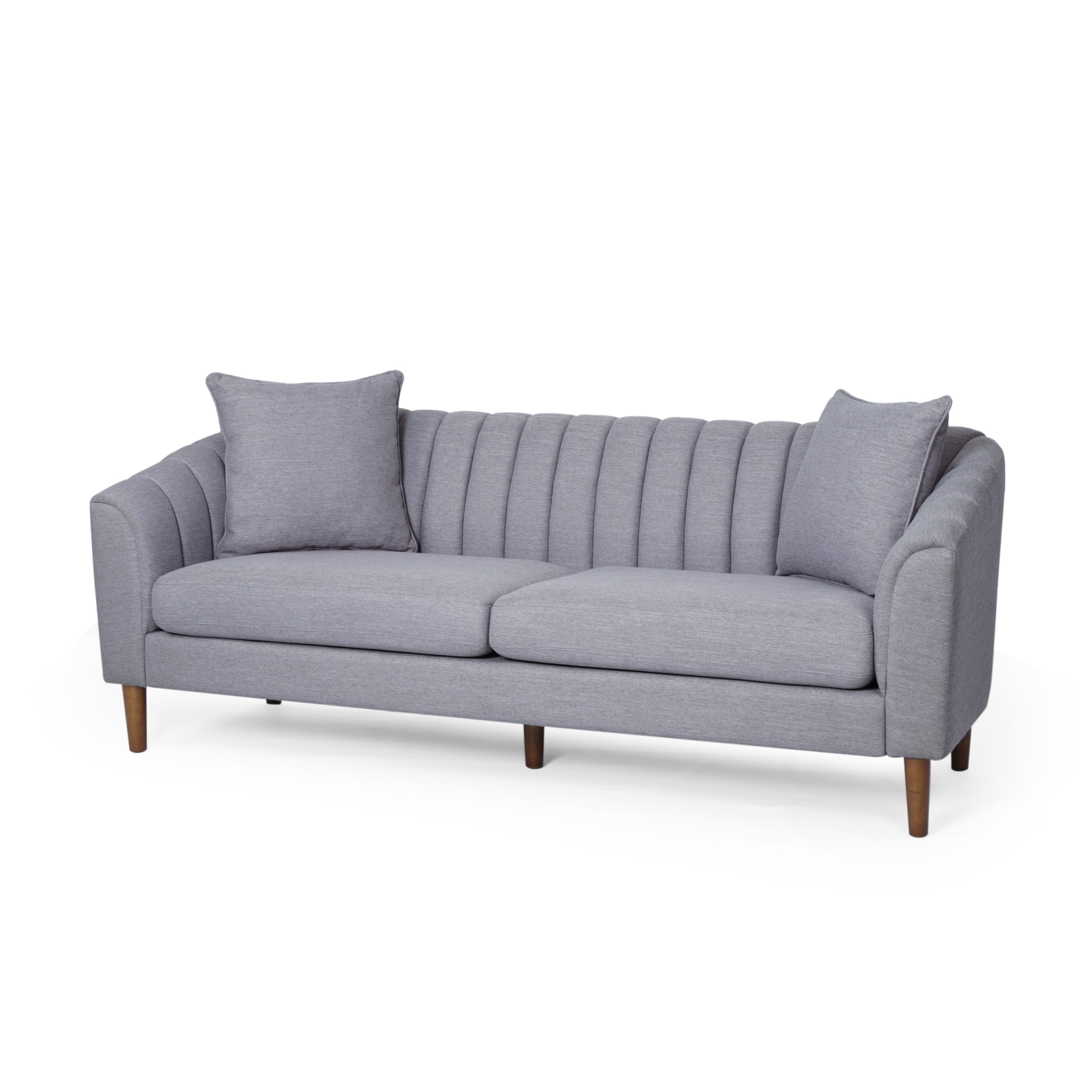 Offer your home a centerpiece of exceptional design and texture to create an atmosphere of refinement throughout your interior decor. Our three-seater sofa brings your living room a stunning look with its deep channel stitching, plush upholstery, and sloped arms. Finished with a low profile design, this sofa stands as a streamlined statement piece that can change the whole flow of your interior decor, creating an open, clean space. From its cozy design to its lovely tapered legs, our sofa will bring excellent comfort and style to any room. CONTEMPORARY: Our sofa set has the look, feel, and design of contemporary style with its plush accents, tapered legs, and button tufted diamond stitching. With a classy and functional design, this sofa will give your room an instant upgrade in style and comfort. DEEP CHANNEL STITCHING: The channel stitching in the backrest and armrests offers an extra touch of sophistication that provides a smooth design. The straight stitch pattern adds a bit of texture without sacrificing any comfort. UPHOLSTERED: Our sofa is generously upholstered, giving any room a refined appearance. This provides a smooth, immaculate texture for this piece as well as plush comfort for relaxation. ACCESSORY PILLOWS: This sofa includes two matching accent pillows, giving this piece both extra comfort and a boost of style. These square pillows maximize the coziness of this sofa with a lovely embellishment. SLOPED ARMS: Featuring armrests with a graceful slope, this sofa offers an encompassing design that is similar to a shell shape, creating extra coziness and style for your home. Features: Includes: One (1) Sofa Material: Fabric Leg Material: Rubber Wood Color: Cloud Gray Leg Finish: Dark Brown Hand-Crafted Details Assembly Required Specifications: Product Dimensions: 33.50″ H x 33.75″ W x 84.50″ D Product Weight: 109.35 lbs Seat Dimensions: 15.50″ H x 72.00″ W x 25.75″ D