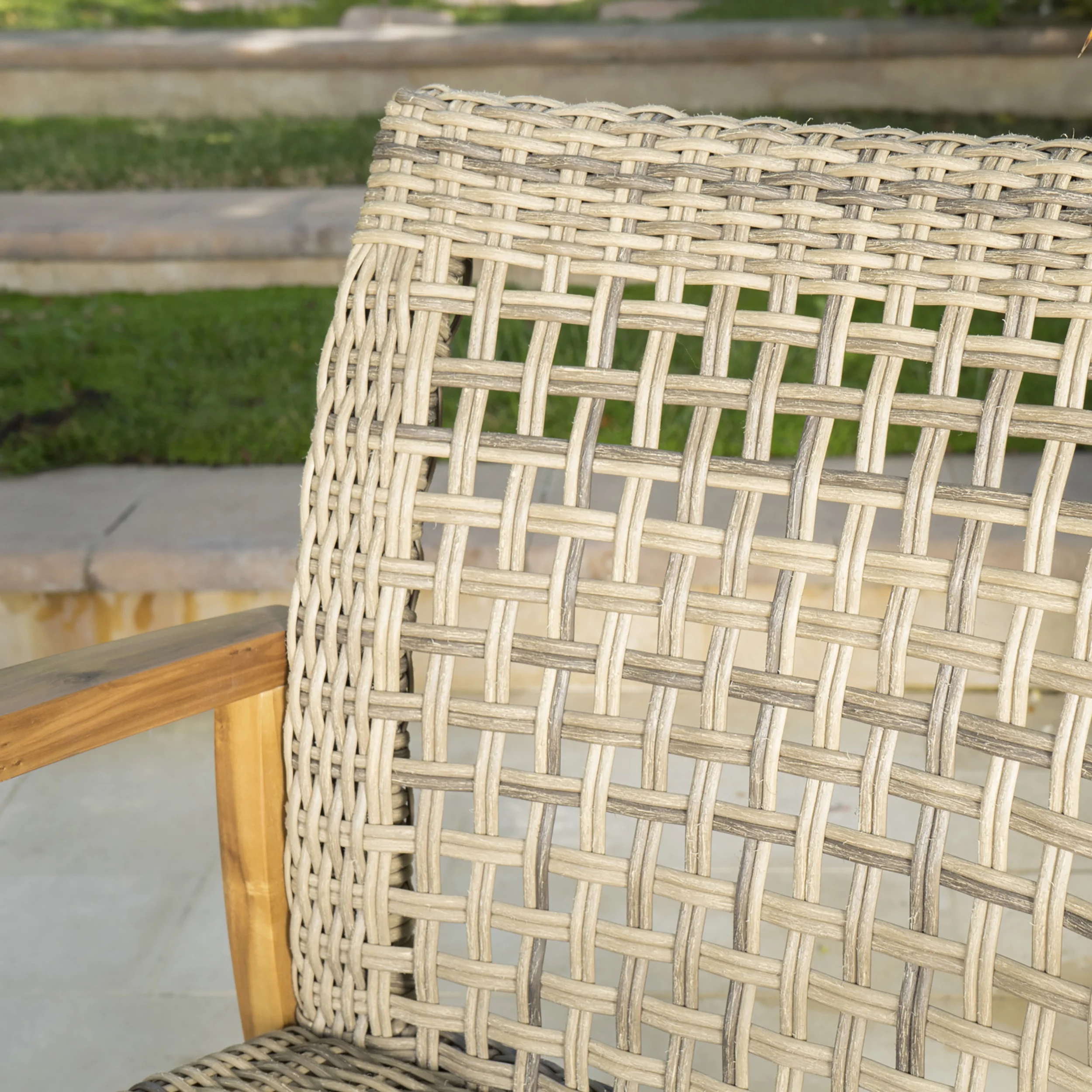 Noble House Outdoor Mid Century Club Chairs with Natural Stained Acacia Wood Frame, Grey (Set of 2) Includes: Two (2) Club Chairs Material: Polyethylene Wicker for durability and weather resistance Frame Material: Sturdy Acacia Wood for a natural look Chair Seat Frame Material: Iron for added strength Wicker Finish: Elegant Grey to complement outdoor settings
