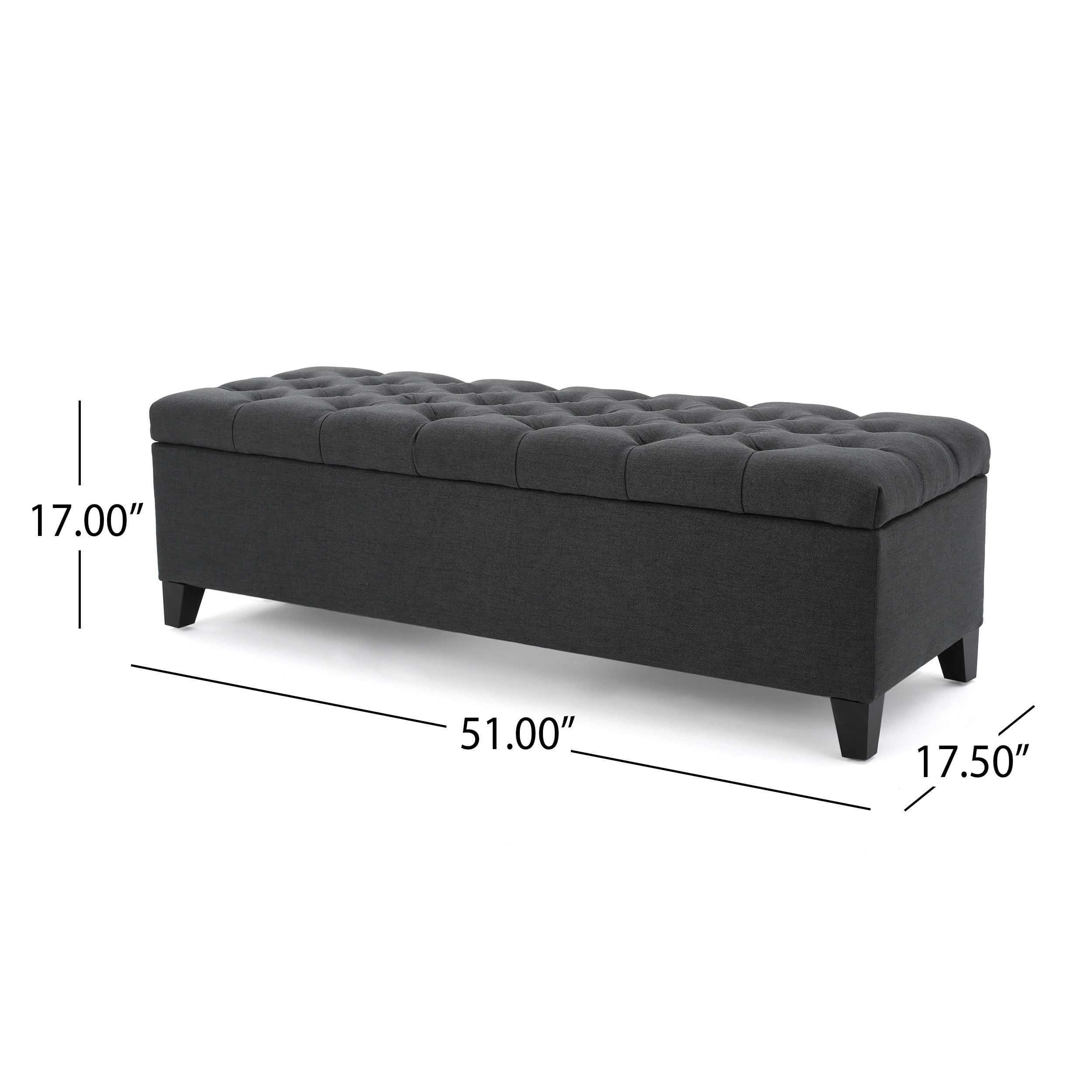 Includes: One (1) Ottoman Bench Multiple Material Options Fabric and Velvet Composition: 100% Polyester Leg Material: Birch Wood Multiple Color Options Leg Finish: Dark Brown Hand-Crafted Details Assembly Required Dimensions: 17.50 inches deep x 51.00 inches wide x 17.00 inches high Weight Capacity: 125 lbs