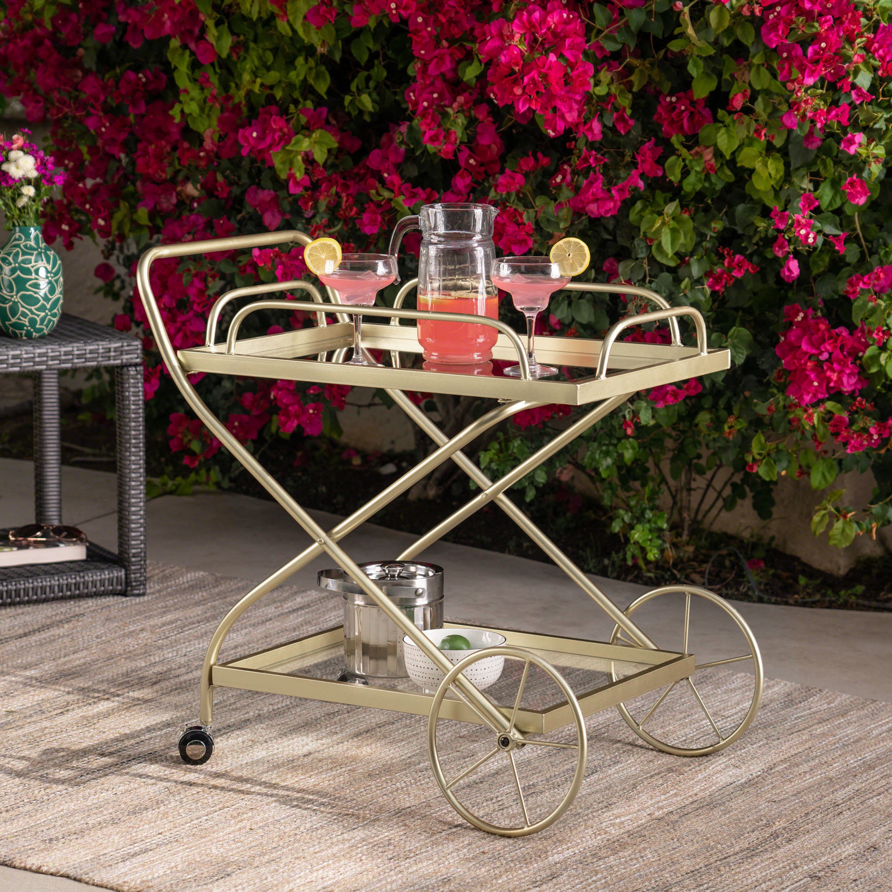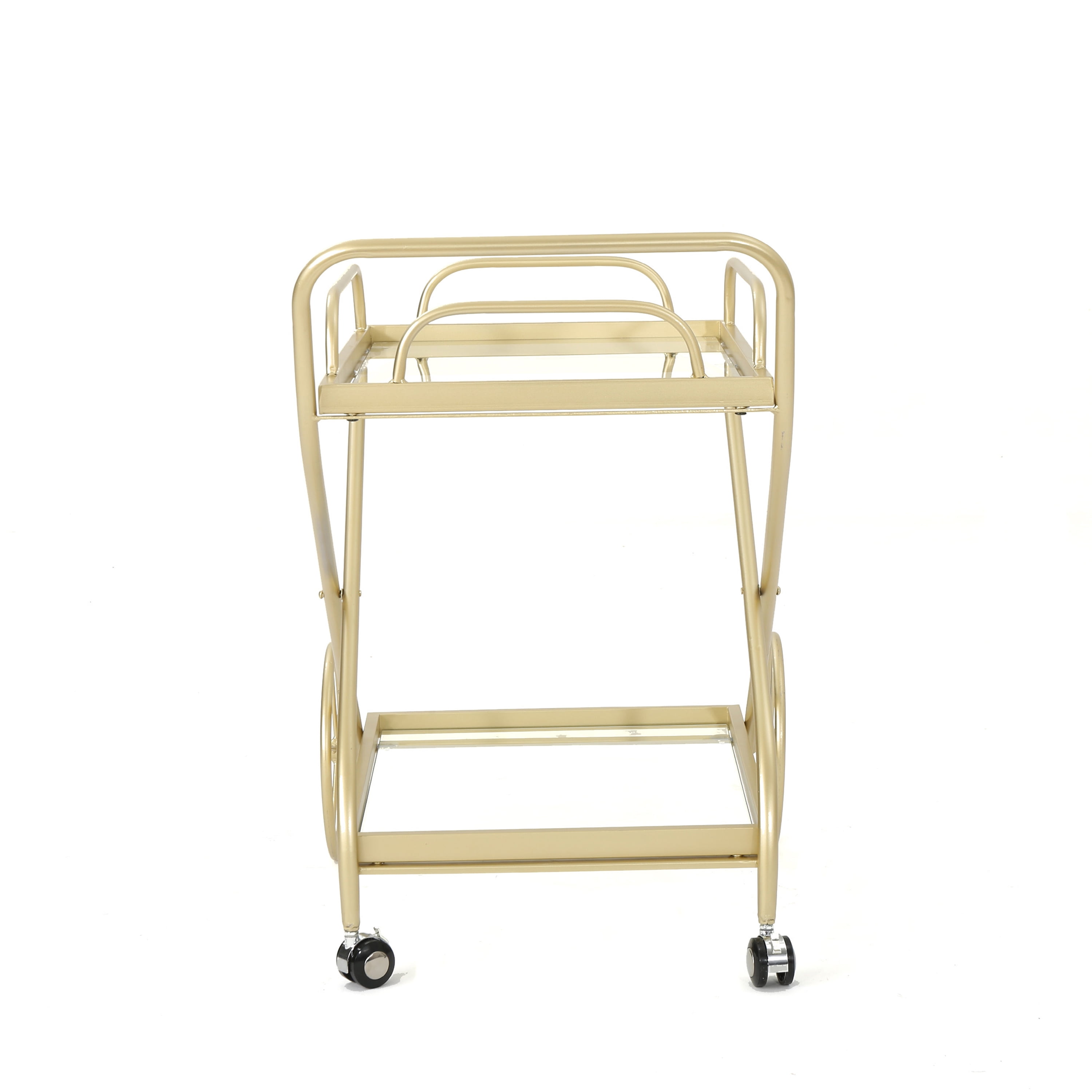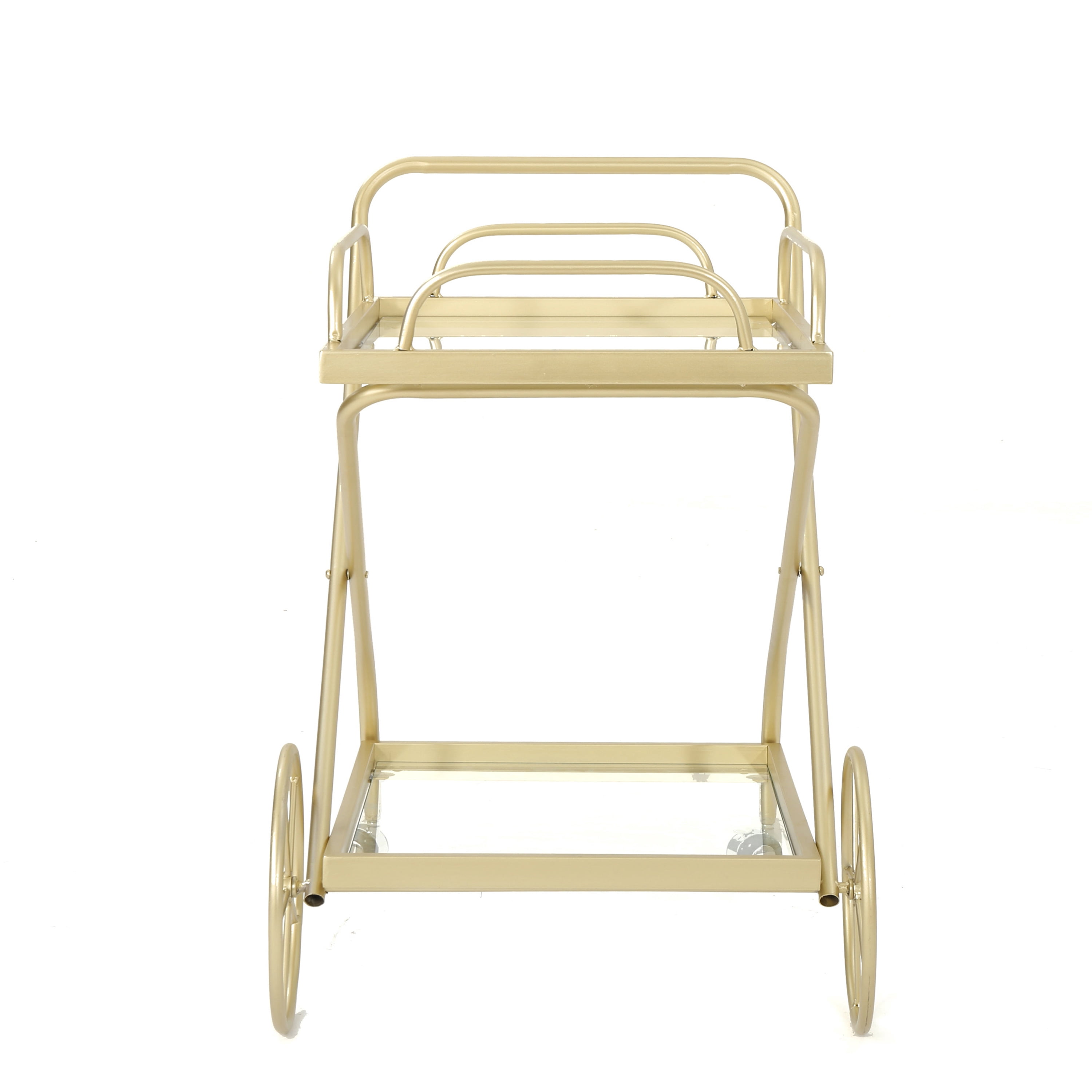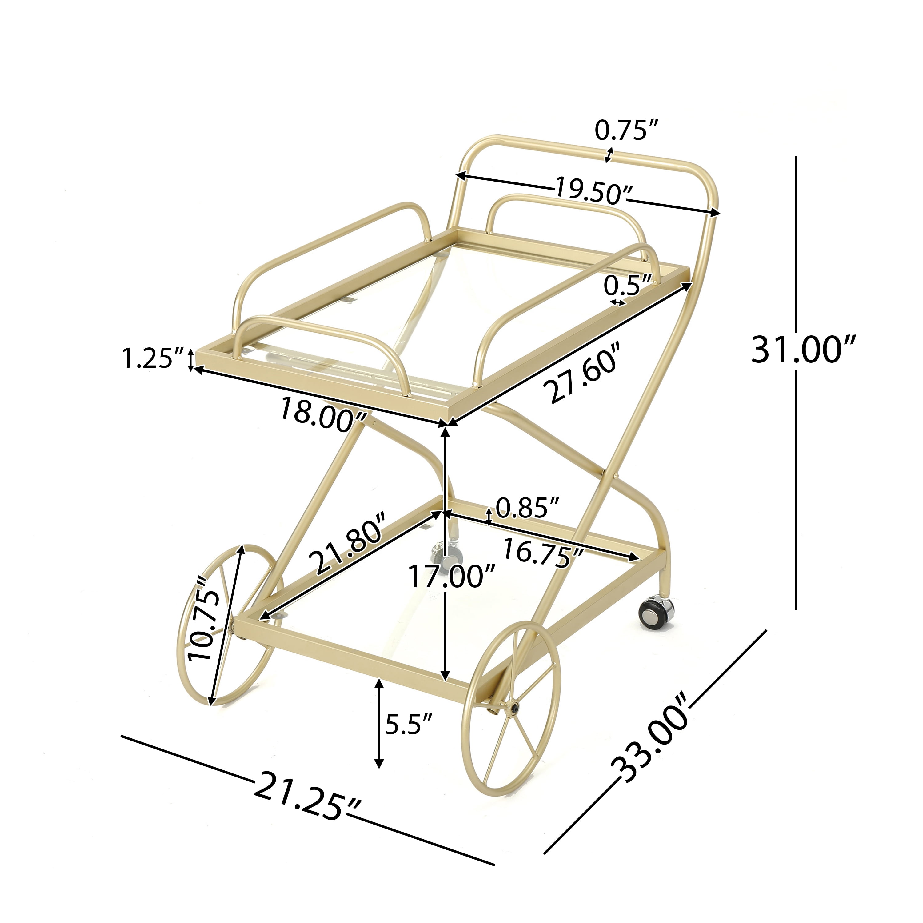 Includes: One (1) Bar Cart Material: Tempered Glass Frame Material: Iron Frame Finish: Gold Assembly Required Hand Crafted Details Dimensions: 21.25 inches deep x 33.00 inches wide x 31.00 inches high