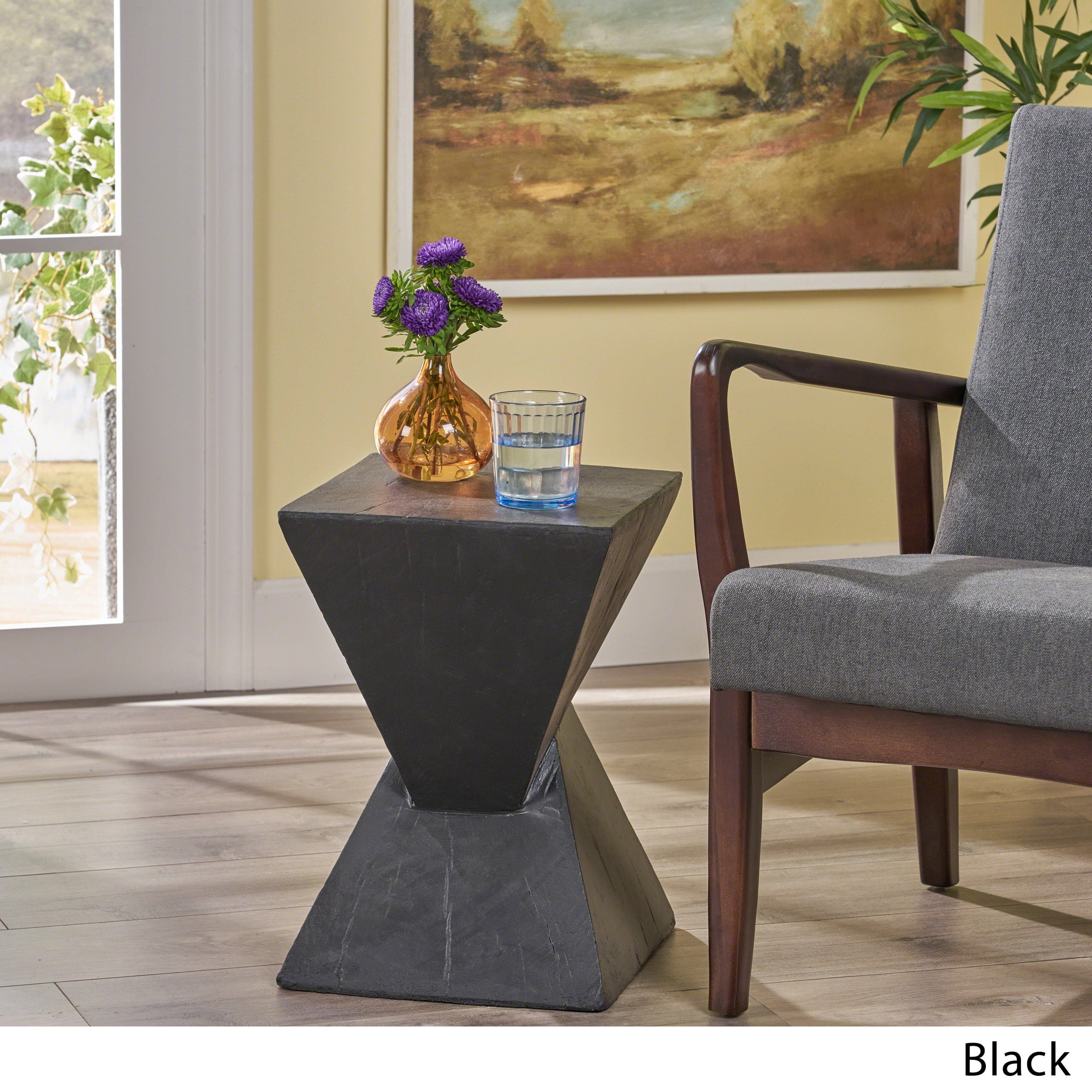 Includes: One (1) Accent Table Material: Lightweight Concrete Color: Black No Assembly Required Dimensions: 12.50 inches deep x 12.50 inches wide x 18.00 inches high